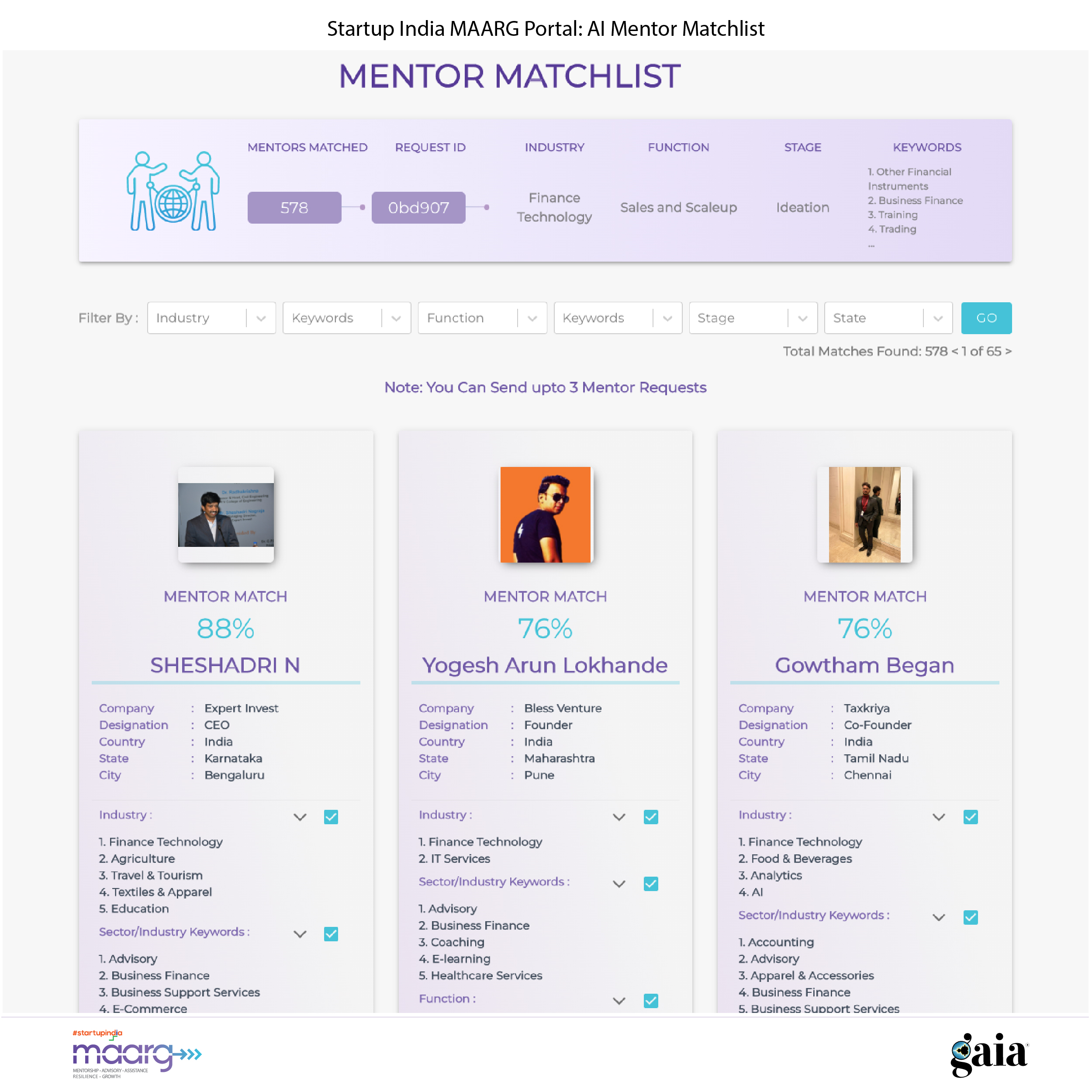 The artificial intelligence engine recommends best-suited mentors or startups based on attributes and contextual keywords. It envisions the usage of Generative AI to understand the pattern of selection by users to improve the search and match ability of the algorithm.