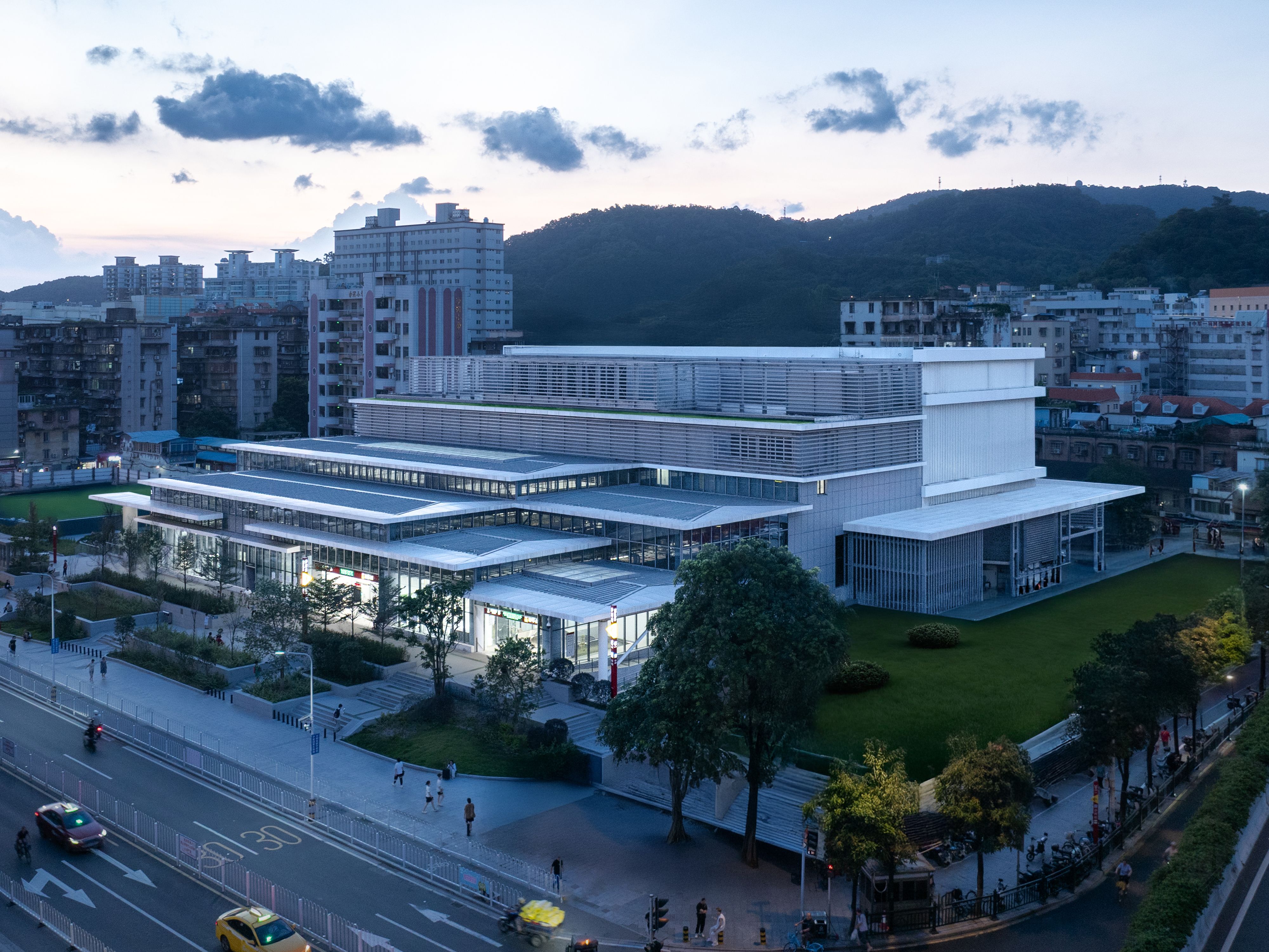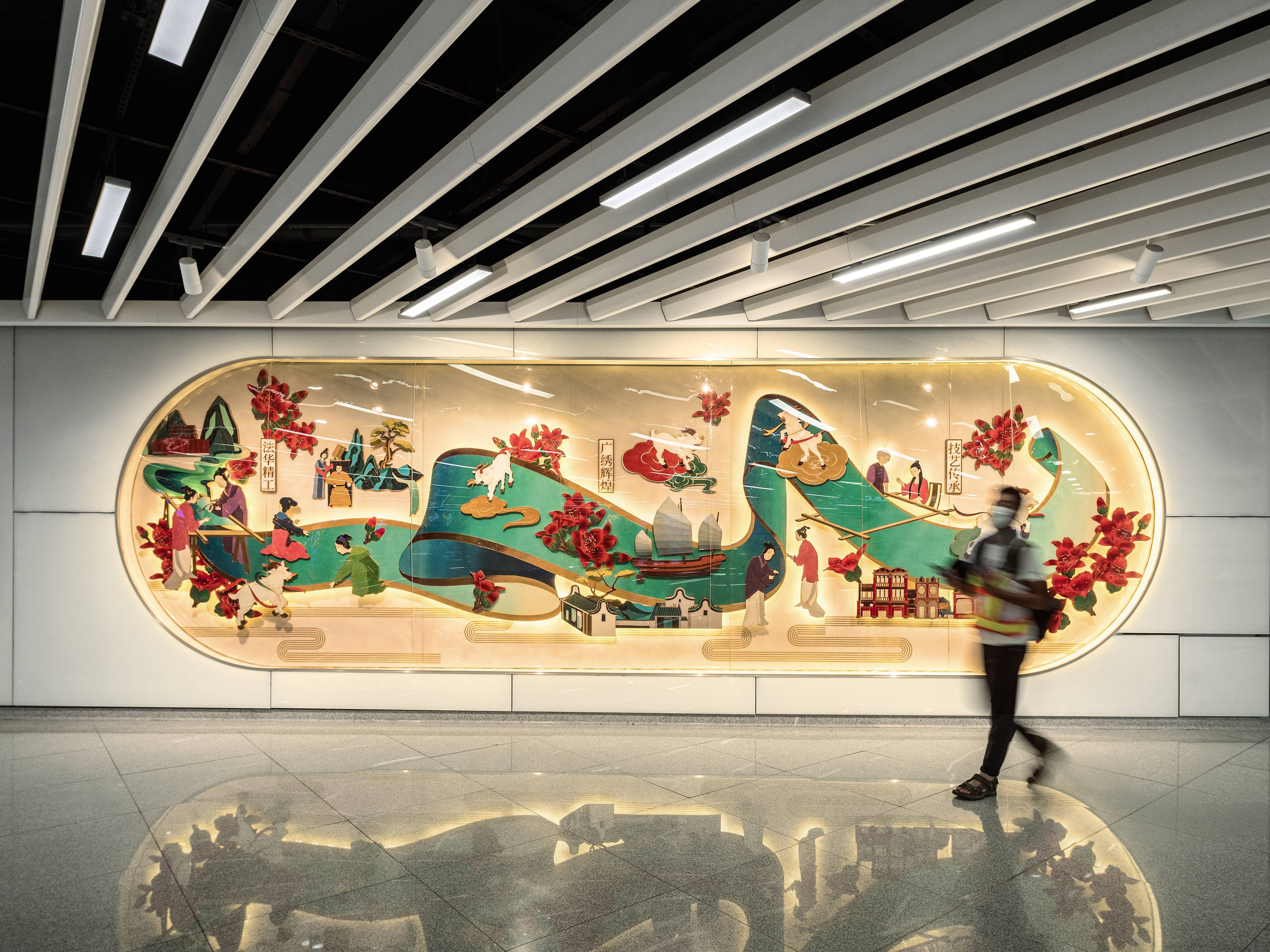 By removing outdated structures, the design seamlessly integrates the 12,000-square-meter landscaped plaza with its surroundings, dissolving the boundary between the urban core and Baiyun Mountain. This creates a three-tiered public network: an underground metro hub, a ground-level intangible cultural heritage corridor alongside a Qilou architectural space, and a rooftop garden with a viewing platform. The Qilou’s tripartite facade provides a sheltered gathering area for people. Along the intangible cultural heritage corridor, digital displays and interactive installations bring traditional crafts—such as Cantonese embroidery and porcelain—to life, weaving them into the fabric of daily life.