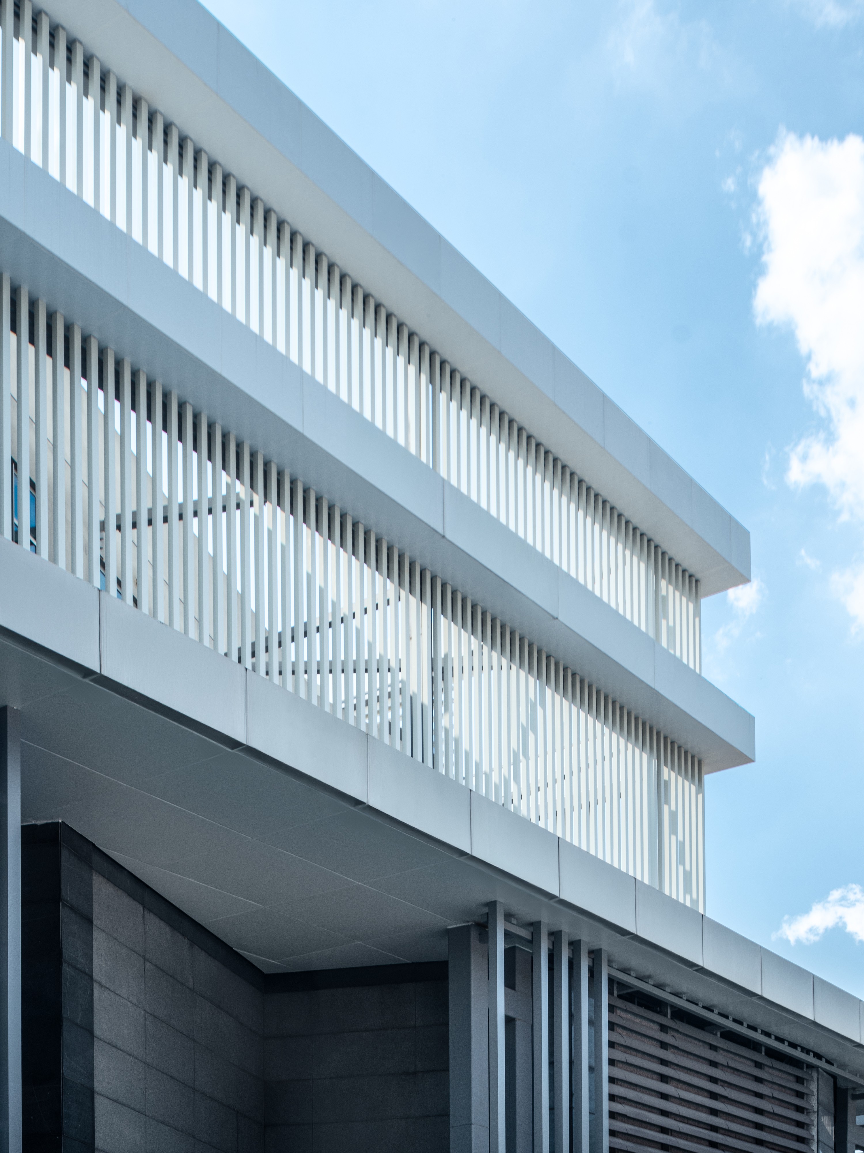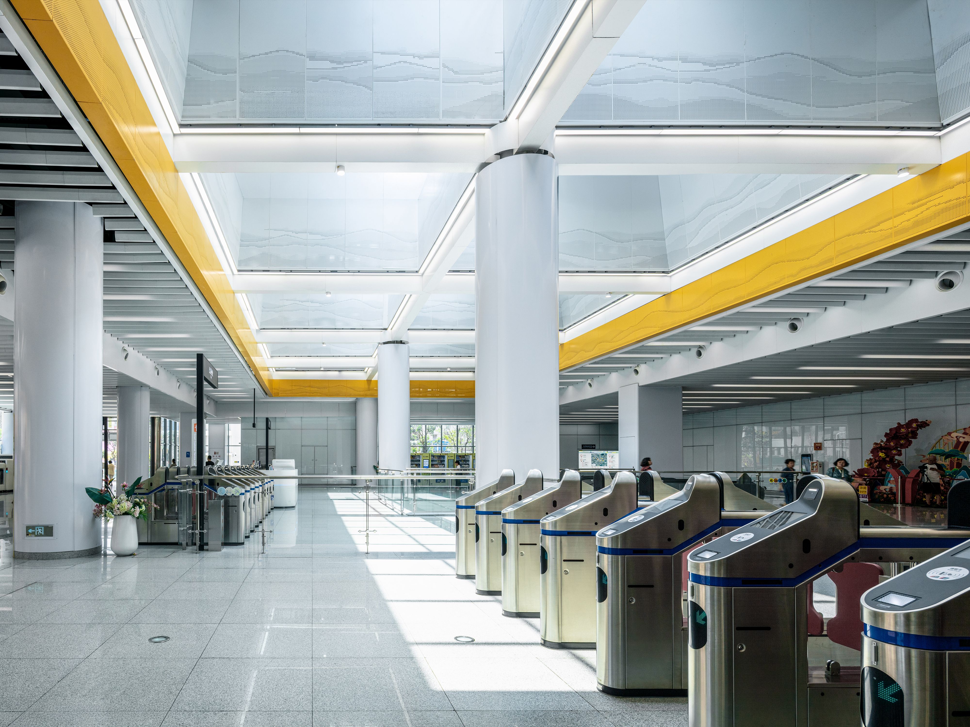 The project embraces the guiding concept: “Let mountains mold architecture; let cities cradle culture.” Inspired by the natural form of Guangzhou’s Baiyun Mountain, it forges a seamless synthesis of nature and the built environment. The dominant color palette of Liwan White and Baiyun Mountain Cyan reflects the beauty of Guangzhou’s natural landscape, evoking a gentle and tranquil atmosphere. A geometric lightwell choreographs the movement of sunlight throughout the day, transforming the interior into a dynamic play of light and shadow. A sequence of white columns forms a rhythmic “light lattice,” and yellow bands decorate the space like drifting clouds, creating a poetic dialogue between earth and sky. Alternating aluminum panels and steel grilles (in a 1:1 pattern) mimic Baiyun Mountain’s sedimentary layers, contrasting with transparent glass curtain walls. By day, the glass glows with a greenish hue, reminiscent of a distant mountain vista, imbuing the architecture with a fluid, natural aesthetic.