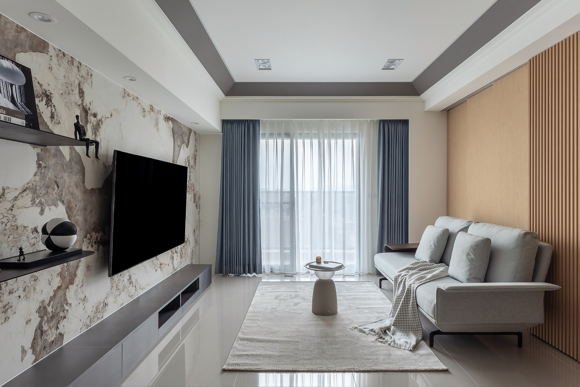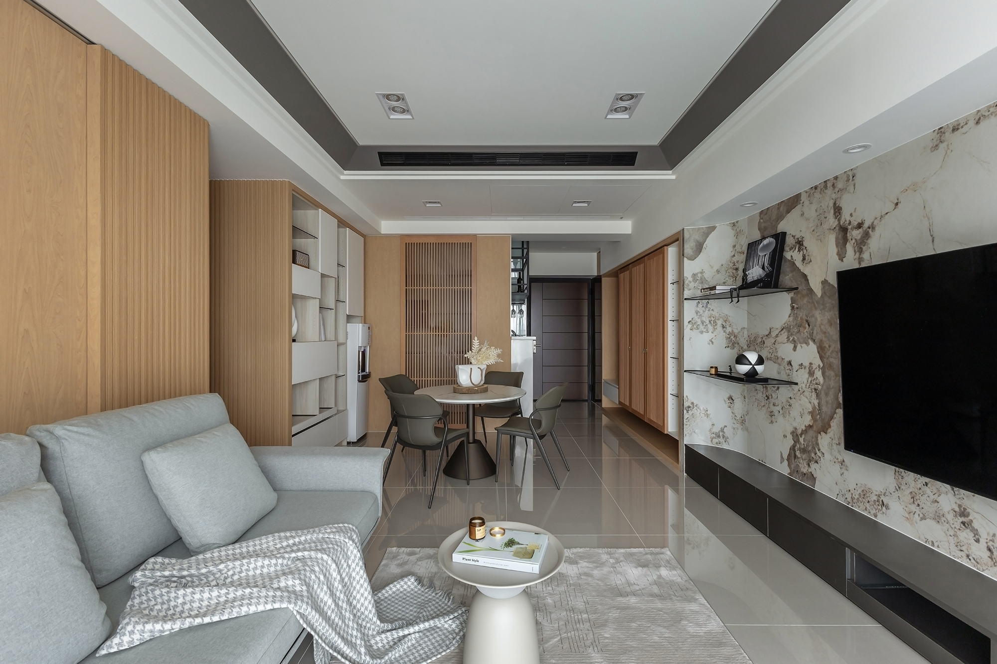 The living room showcases a striking light-colored stone wall that elegantly frames the television, becoming a focal point of the space. Notably, the back wall is adorned with beautifully crafted sliding wooden lattice doors that fulfill a dual purpose as both a partition and an architectural feature. As the doors glide open, they seamlessly connect the living room to a versatile multifunctional area, promoting a sense of spaciousness and fluidity. Conversely, when closed, they create a soft facade that enhances the room’s sense of order and privacy.