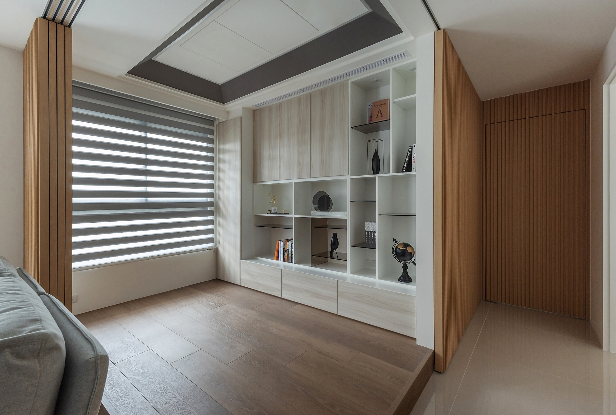 In this multifunctional zone, the flooring is raised, skillfully delineating distinct levels and adding visual interest. Furthermore, integrated storage and display cabinets serve as functional transitional elements that bridge private areas, ensuring that lifestyle flexibility is preserved without compromising aesthetics. This thoughtful design approach not only enhances the overall usability of the space but also elevates its sophistication and charm.