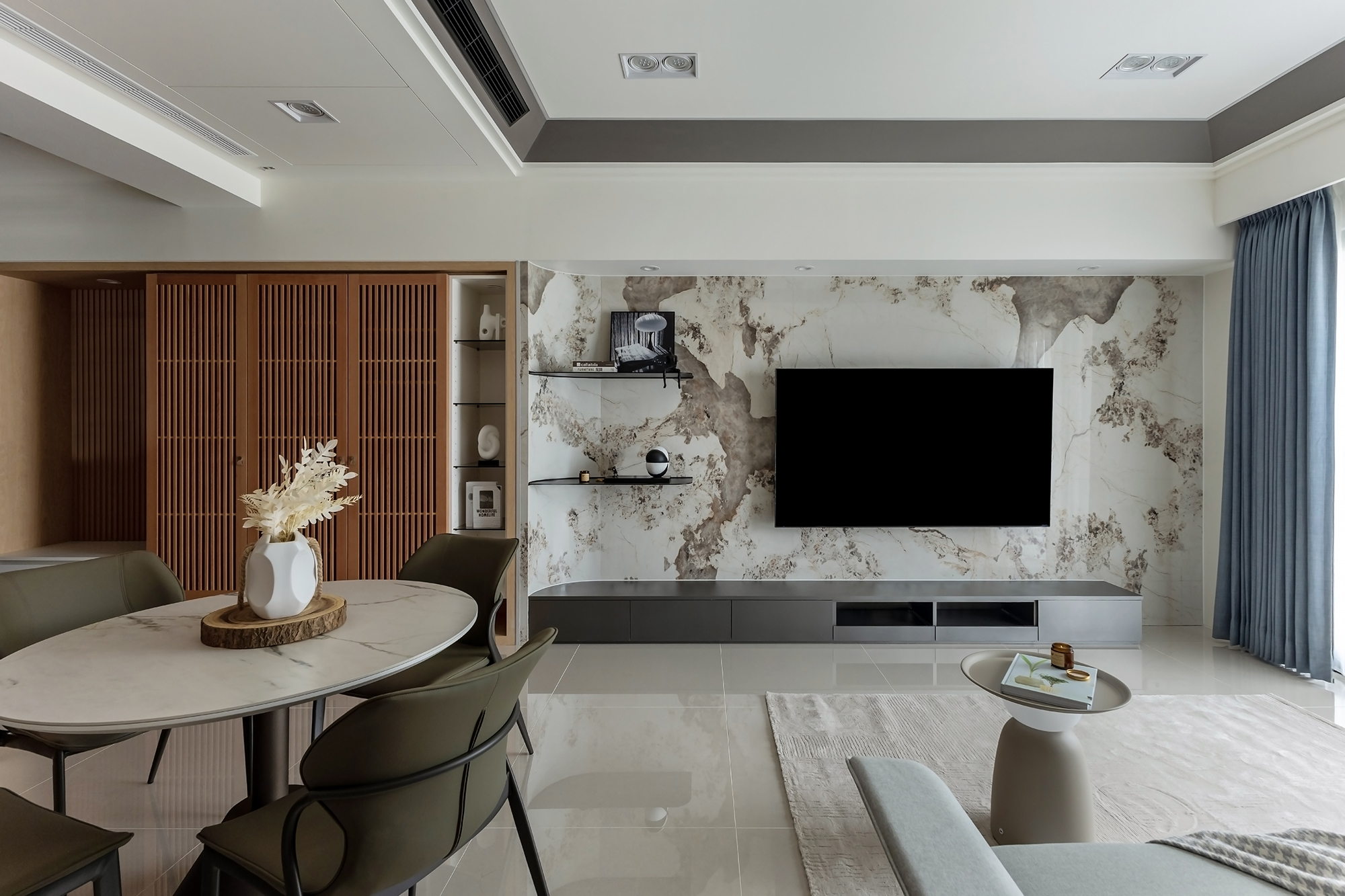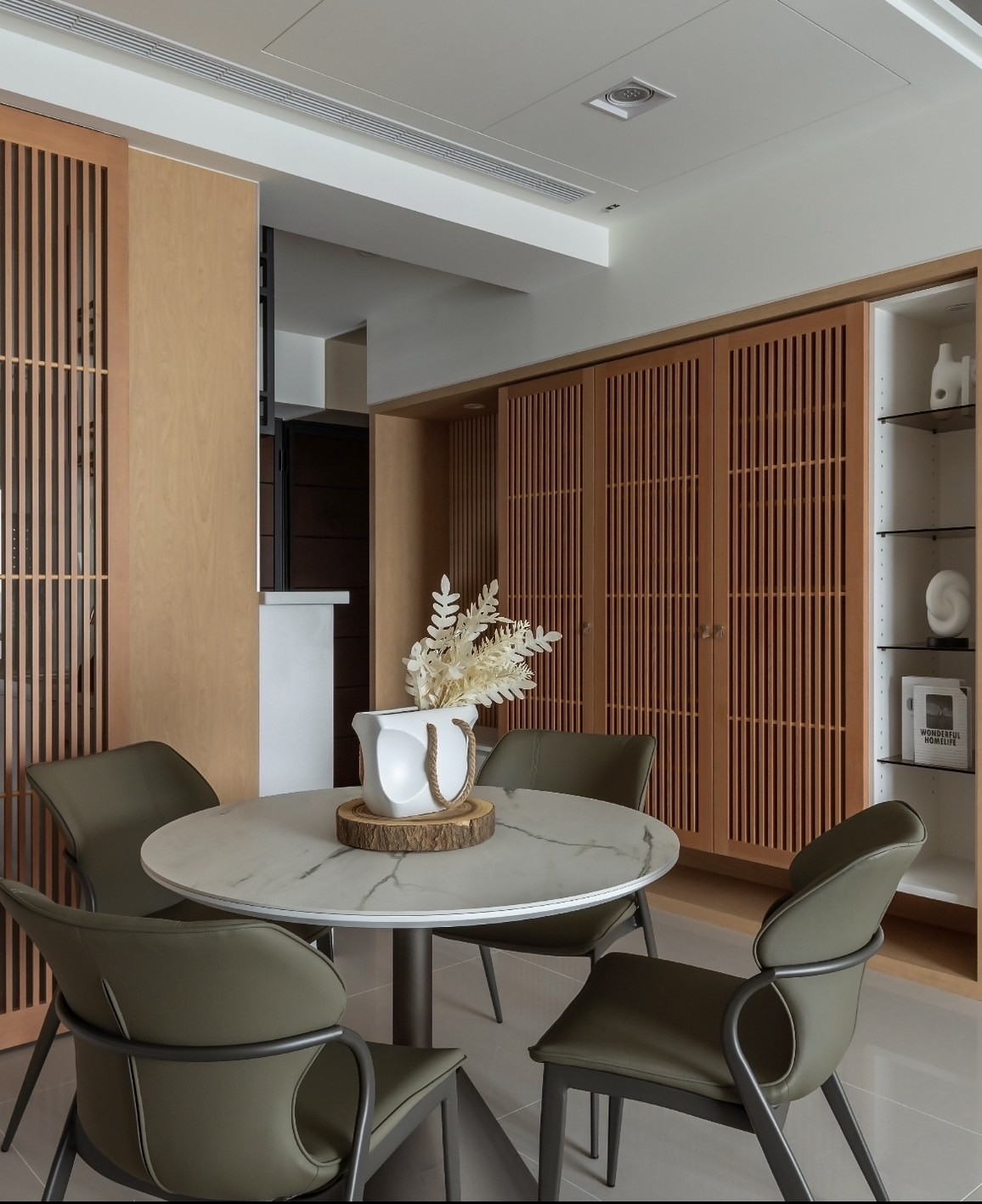 Transitioning into the dining area, one will notice that the wooden lattice sliding doors elegantly delineate the space, offering flexibility in both sightlines and circulation. Here, the dining space centers around a stunning circular table with a textured stone finish, surrounded by stylish army-green chairs that add character and style. Additionally, thoughtfully designed shelving units not only provide essential storage but also serve as a platform for display, thus infusing warmth and personality into the home’s orderly design.