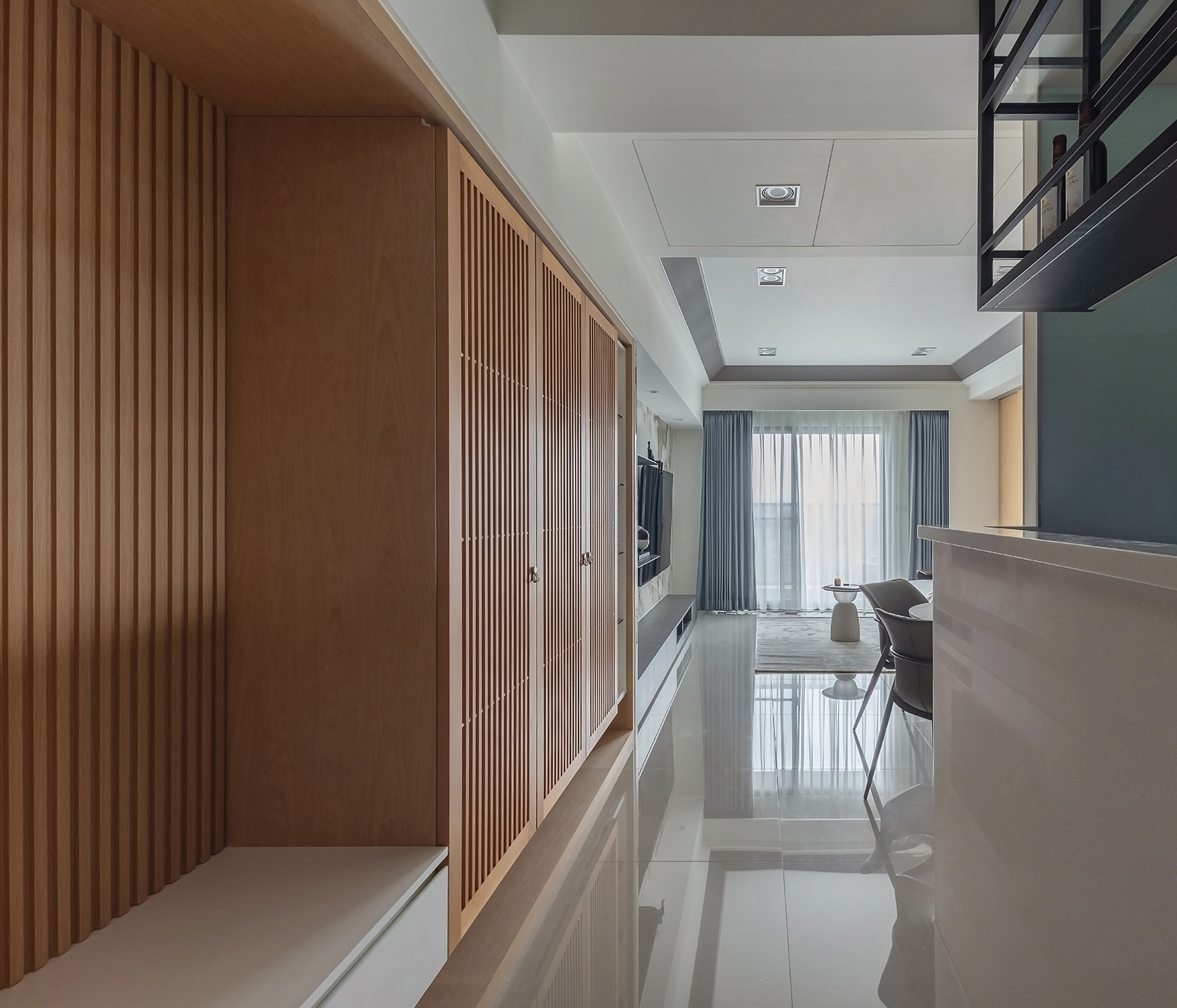 The project is thoughtfully anchored in the concepts of "transparency and order," which resonate deeply with the homeowner's aspiration for stability amid the demands of a high-pressure lifestyle. Notably, the rhythmic interplay of solid and void within the elegantly designed lattice screens artfully guides the flow of light, air, and emotion, thereby cultivating a sense of spatial openness. This openness is achieved while still preserving essential hierarchy and definition throughout the space. Moreover, drawing inspiration from the Japanese ethos of minimalism and refined restraint, the design seamlessly harmonizes the dialogue between rich wood textures and the cool elegance of stone. This delicate balance allows for a rational structure to coexist alongside an inviting warmth, ultimately shaping a tranquil everyday setting. In such an environment, inner balance and serenity can quietly blossom, enhancing the overall experience of daily life.