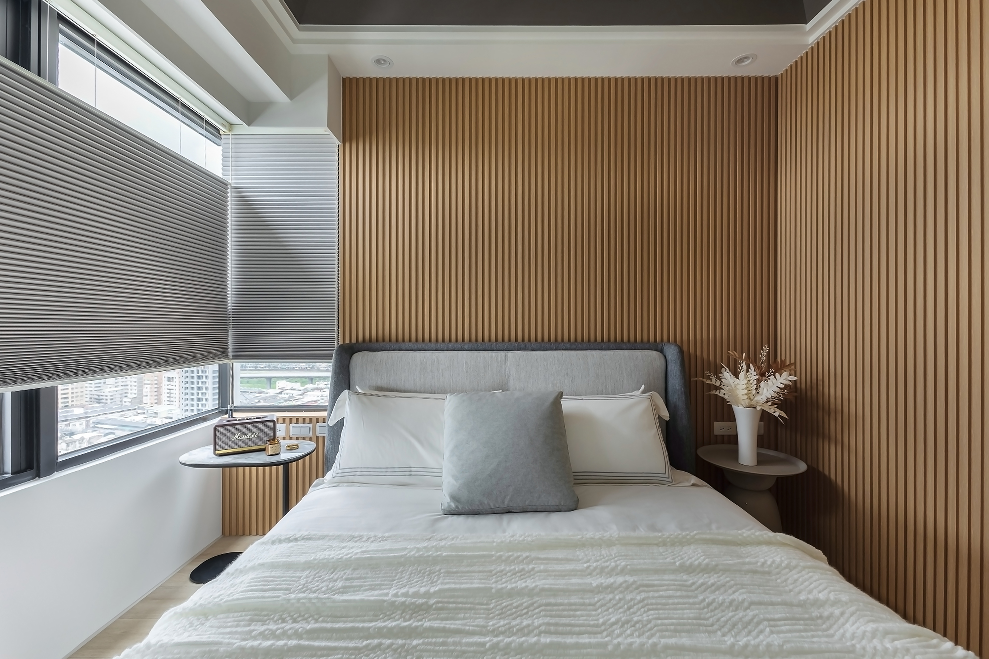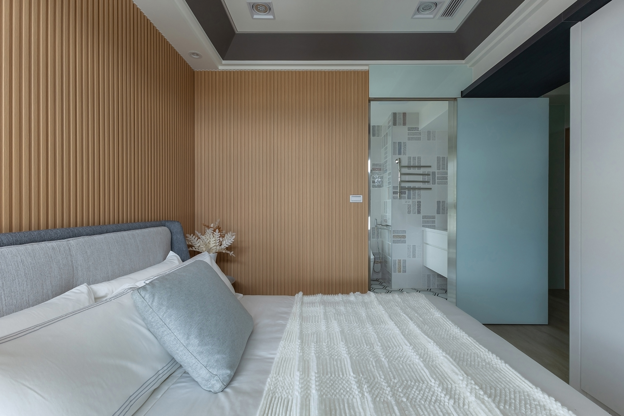 Into the primary suite, the vertical wooden slats of the headboard evoke a sense of stability and grounding, establishing a serene focal point for the space. Meanwhile, the bathroom weaves a captivating modern rhythm through its carefully selected patterned wall tiles and striking hexagonal floor tiles. These elements infuse the area with distinctive personality, contributing to an overall lived-in feel that is both stylish and welcoming.