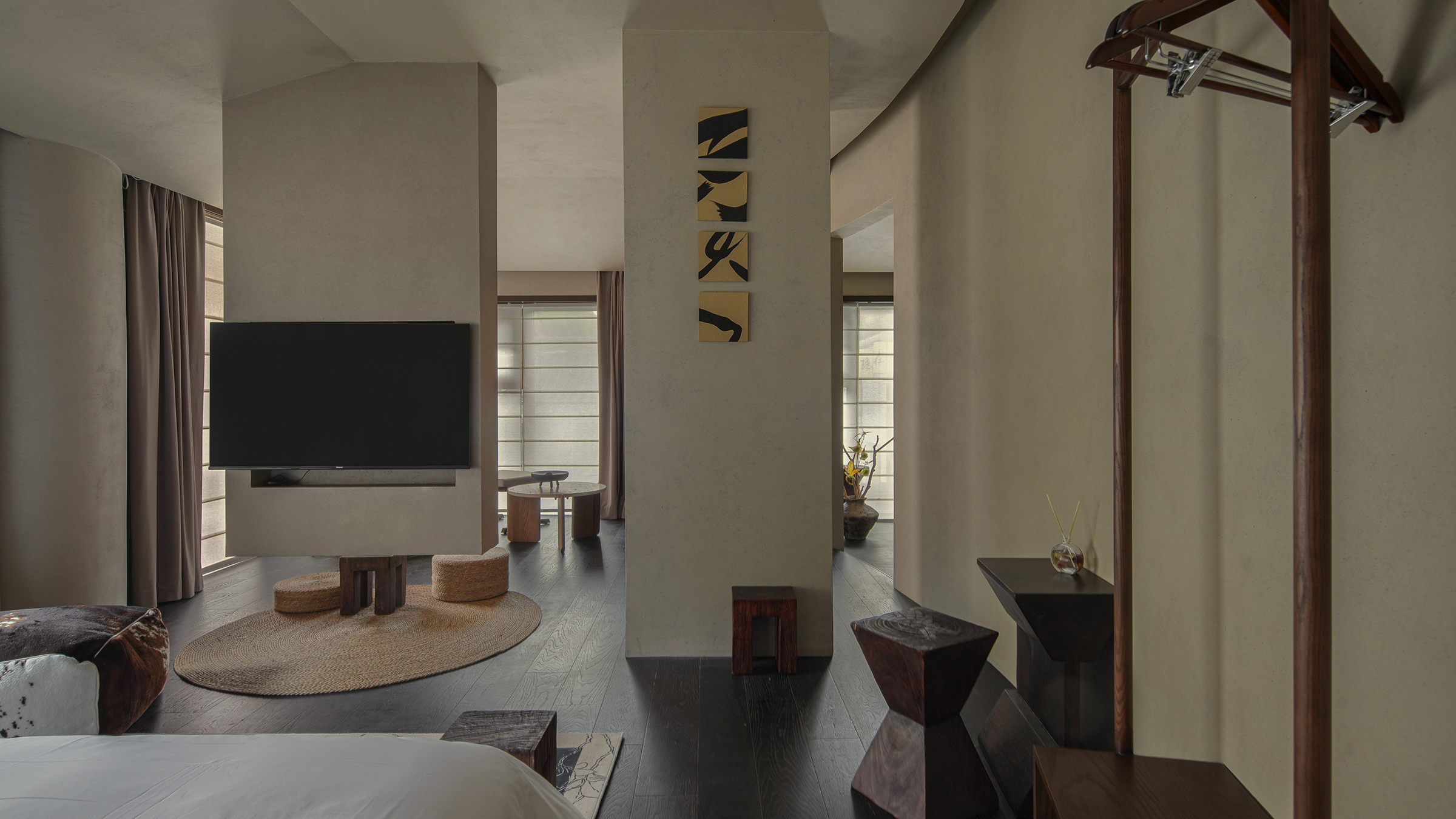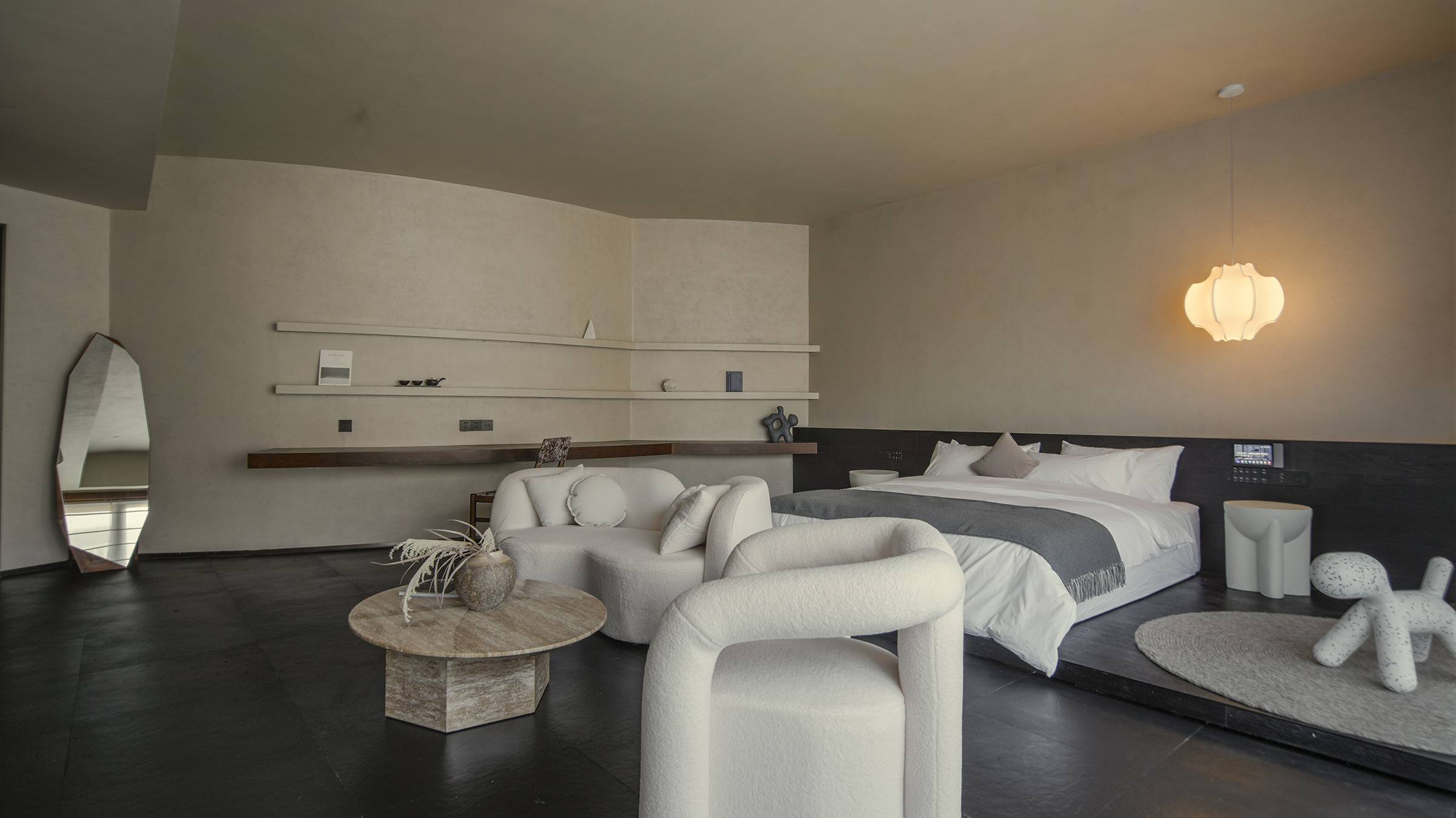 Each themed accommodation area is both independent and interconnected, enabling seamless transitions to meet the diverse functional needs of the guests. To maintain the integrity of the space's main tone while considering the budget, the use of artistic paint is deliberately restrained, running through all areas to create a base canvas reminiscent of "old rice paper." The addition of aggregates in the paint further enhances this handmade paper making texture.