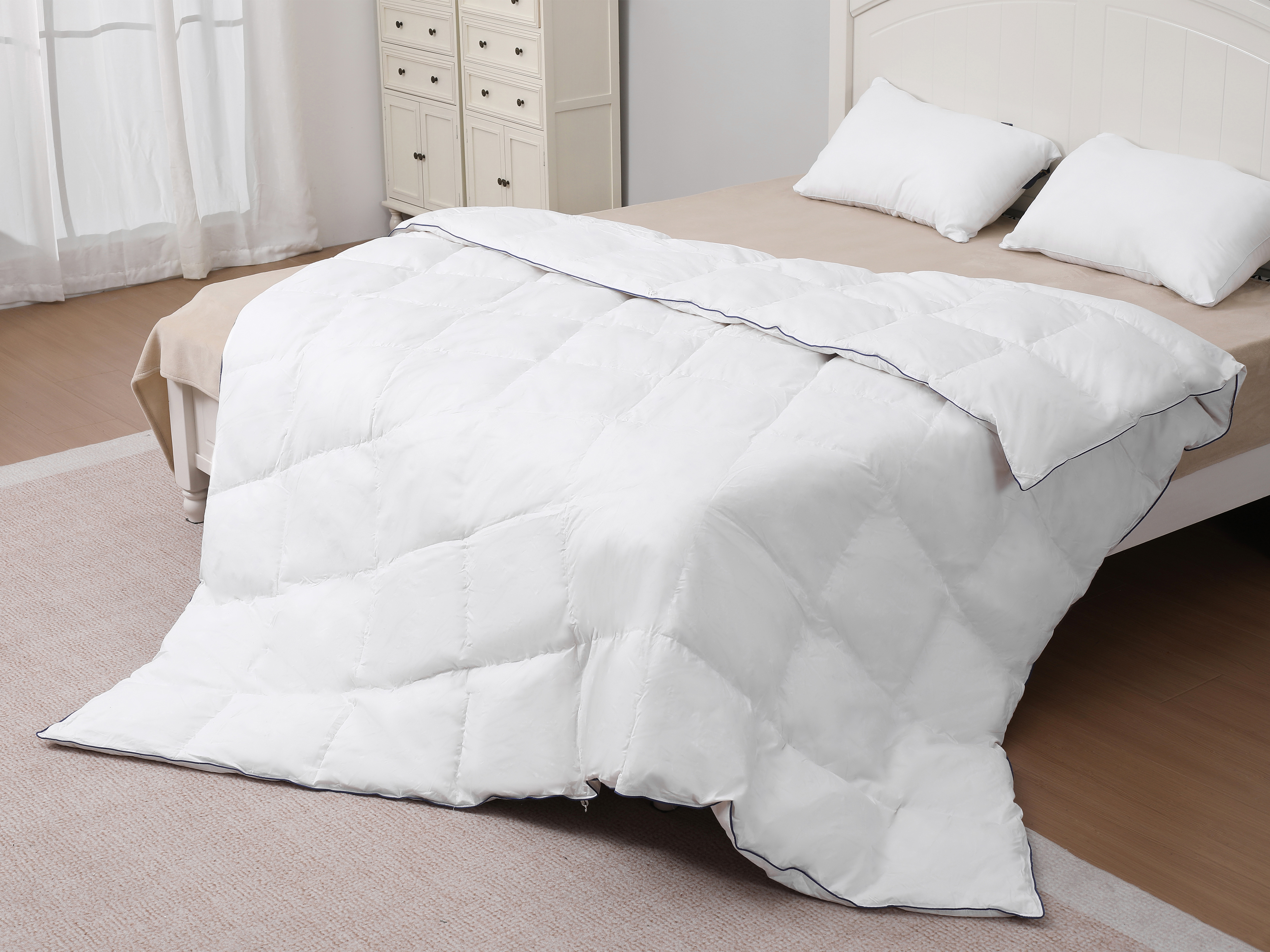 As consumers pay more attention to sleep quality, the market calls for an all-season down duvet that combines comfort with durability. This Down Duvet is filled with RDS-certified materials including 10% goose down and 90% feathers, with a high fill weight of 650 grams per square meter for a loft and soft texture suitable for year-round use. The outer layer is made of 100% cotton, certified by Oeko-Tex Standard 100 for safety, skin-friendliness and excellent breathability. It is also finished with down-proof treatment to prevent down leakage. A box-stitch quilting design secures the filling in place, effectively preventing shifting and extending the product’s lifespan. The quilt is machine washable and supports vacuum storage for everyday convenience. In addition, its minimalist ivory-white design blends with a variety of bedroom styles, providing modern households with a high-quality sleep solution.
