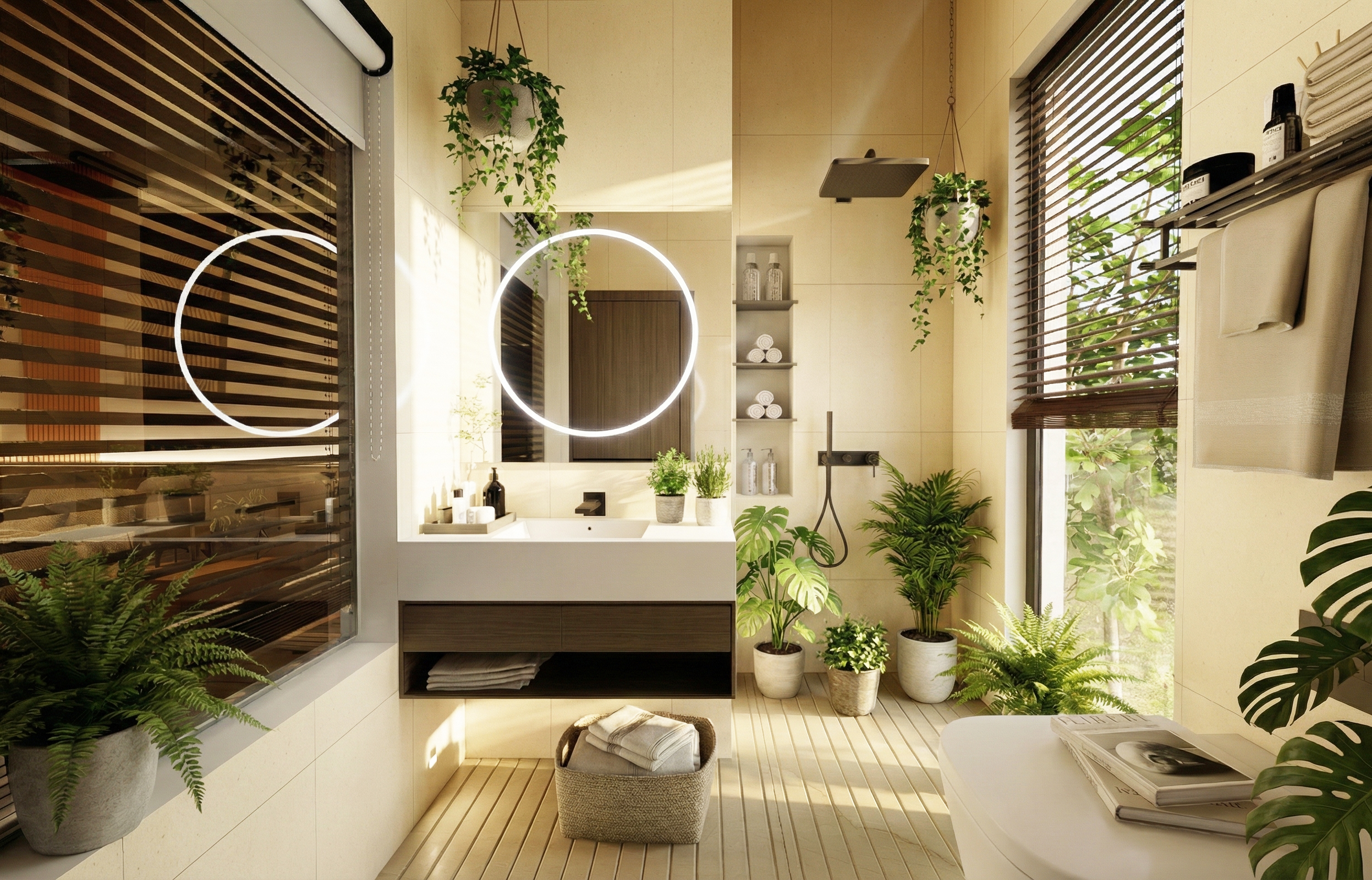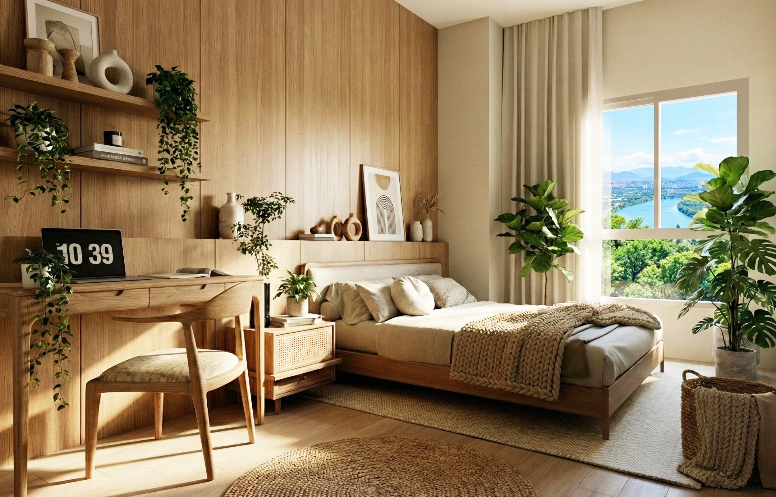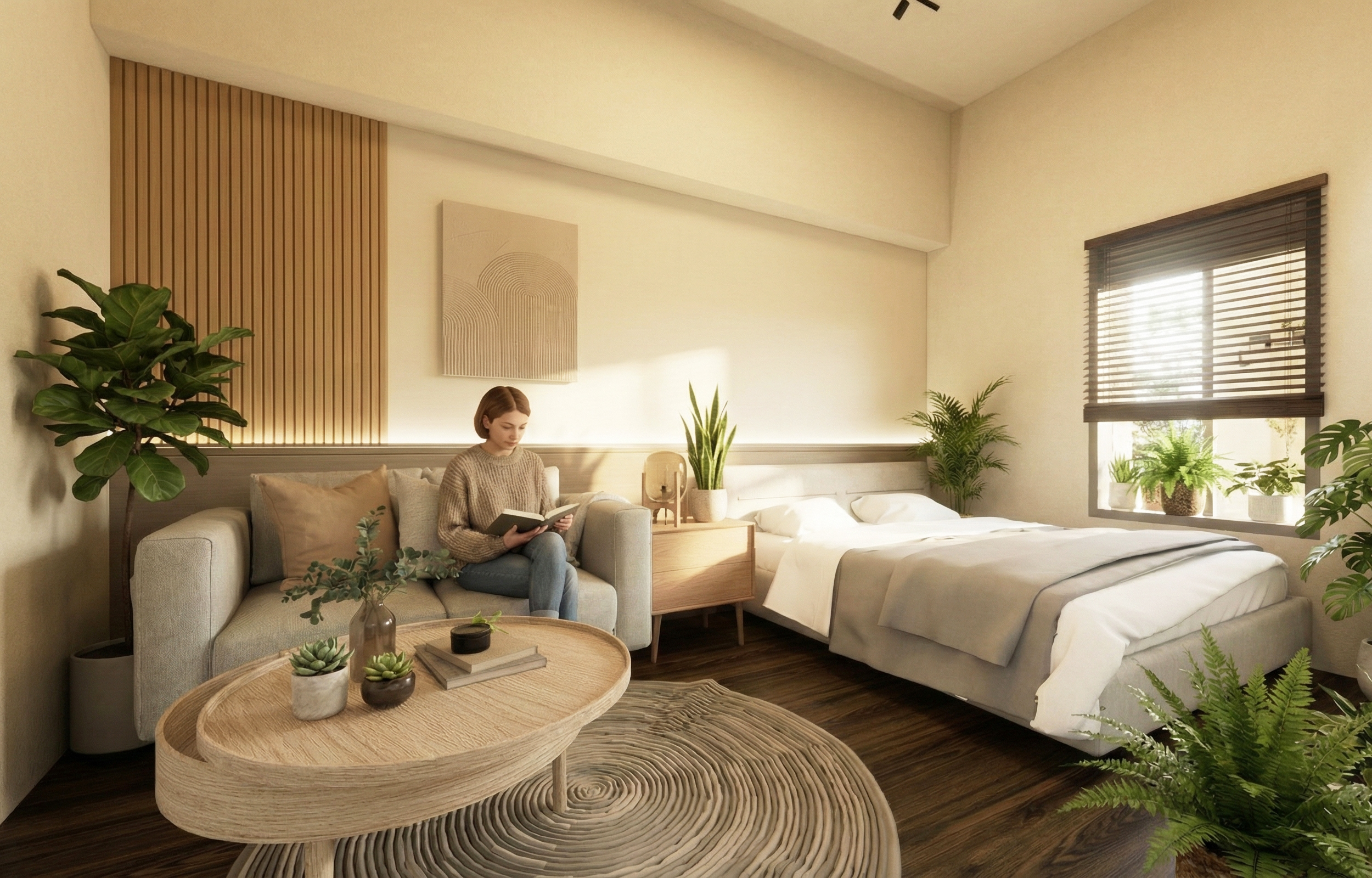 Daylight autonomy is maximized through strategic fenestration. A notable feature in studio units is the use of internal glazing (borrowed light) between bathrooms and living areas, ensuring natural light penetration deep into the interior. Finally, the project manifests as a "vertical forest," with landscaped balconies on every floor. Coupled with extensive vegetation on the ground level, podium deck, and rooftop, this biophilic approach fosters biodiversity and actively mitigates the Urban Heat Island (UHI) effect.