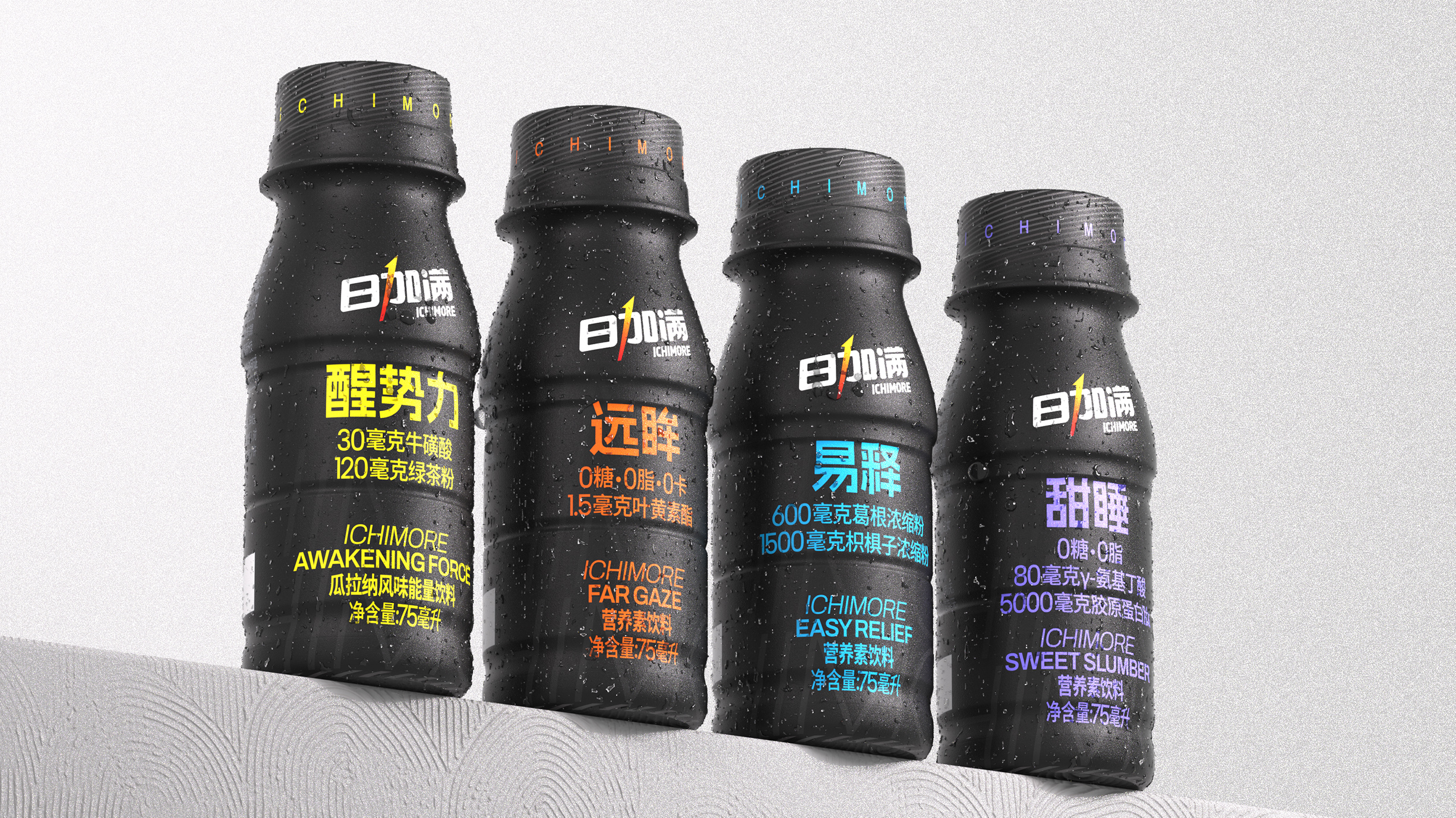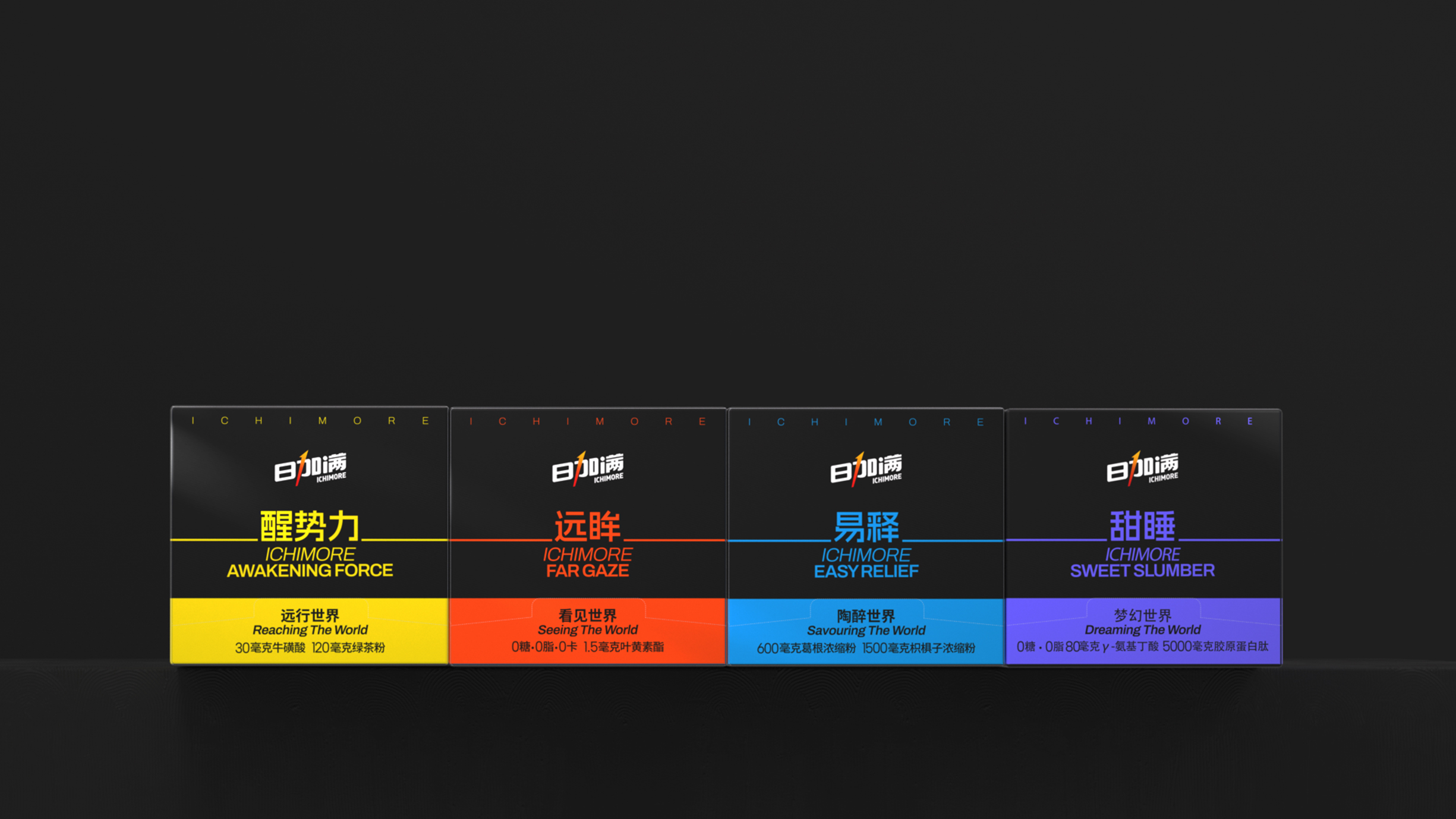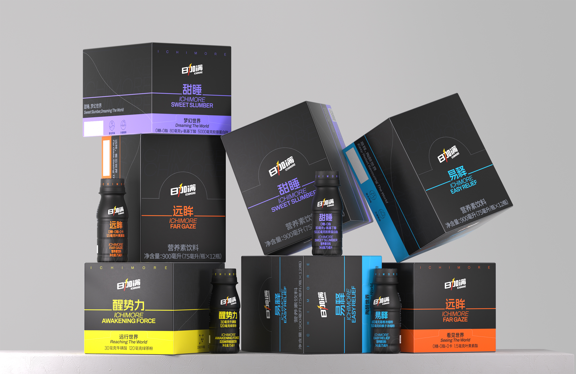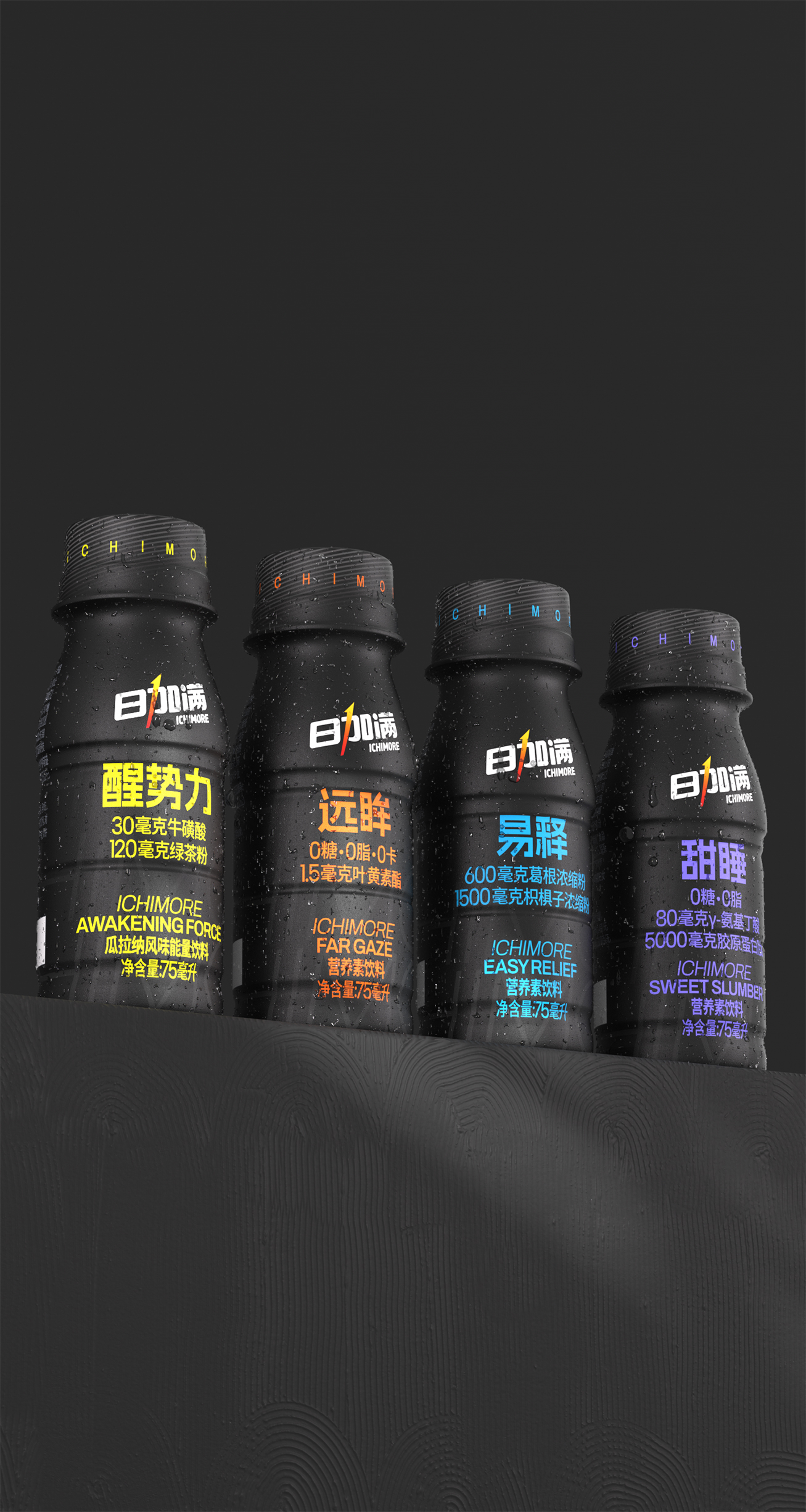 The packaging design for Ichimore 75ml Nutrition Series SHOTS caters to the fast-paced, health-conscious lifestyle of modern urban men who value efficient nutritional supplement solutions. The design includes four distinct variants, each visually coded to a core benefit—boosting energy, protecting eyesight, liver care & alcohol relief, and sleep aid—through bold color differentiation. The portable bottles deliver ready-to-drink nutrition in a sleek, compact form, meeting urban men’ demand for efficient nutritional supplementation. Additionally, the combination of premium texture and technological aesthetics creates a memorable, distinctive visual identity for the product, ensuring standout shelf appeal.