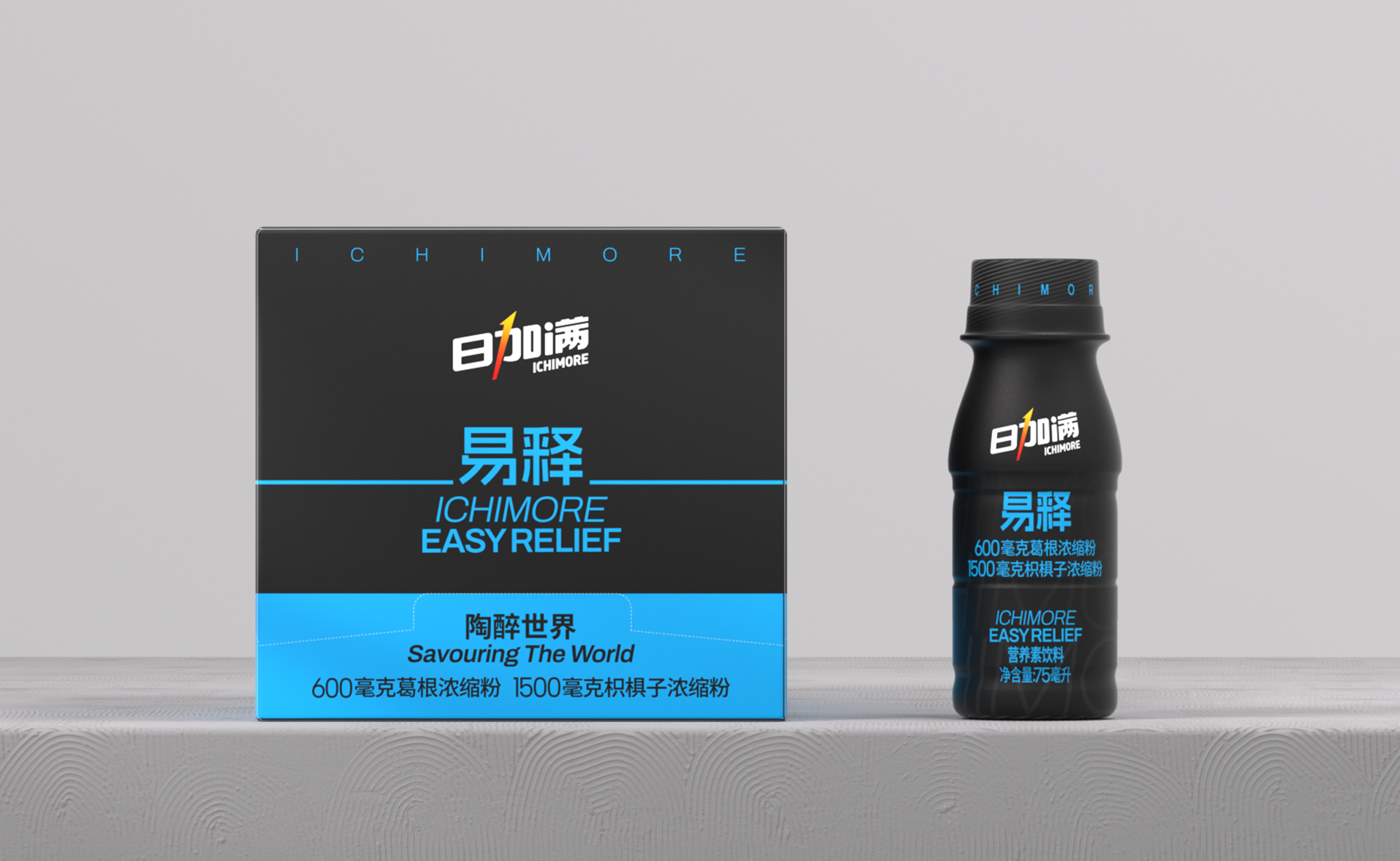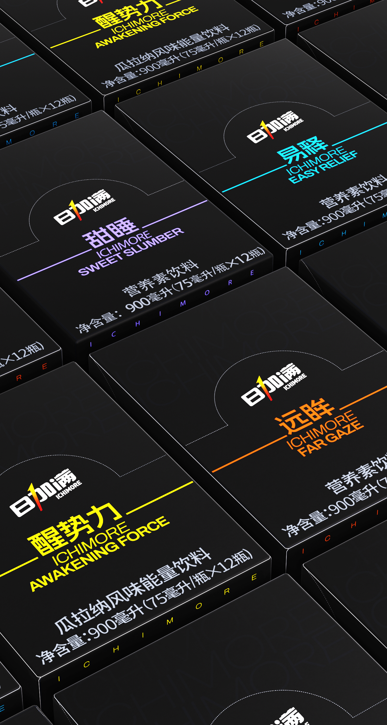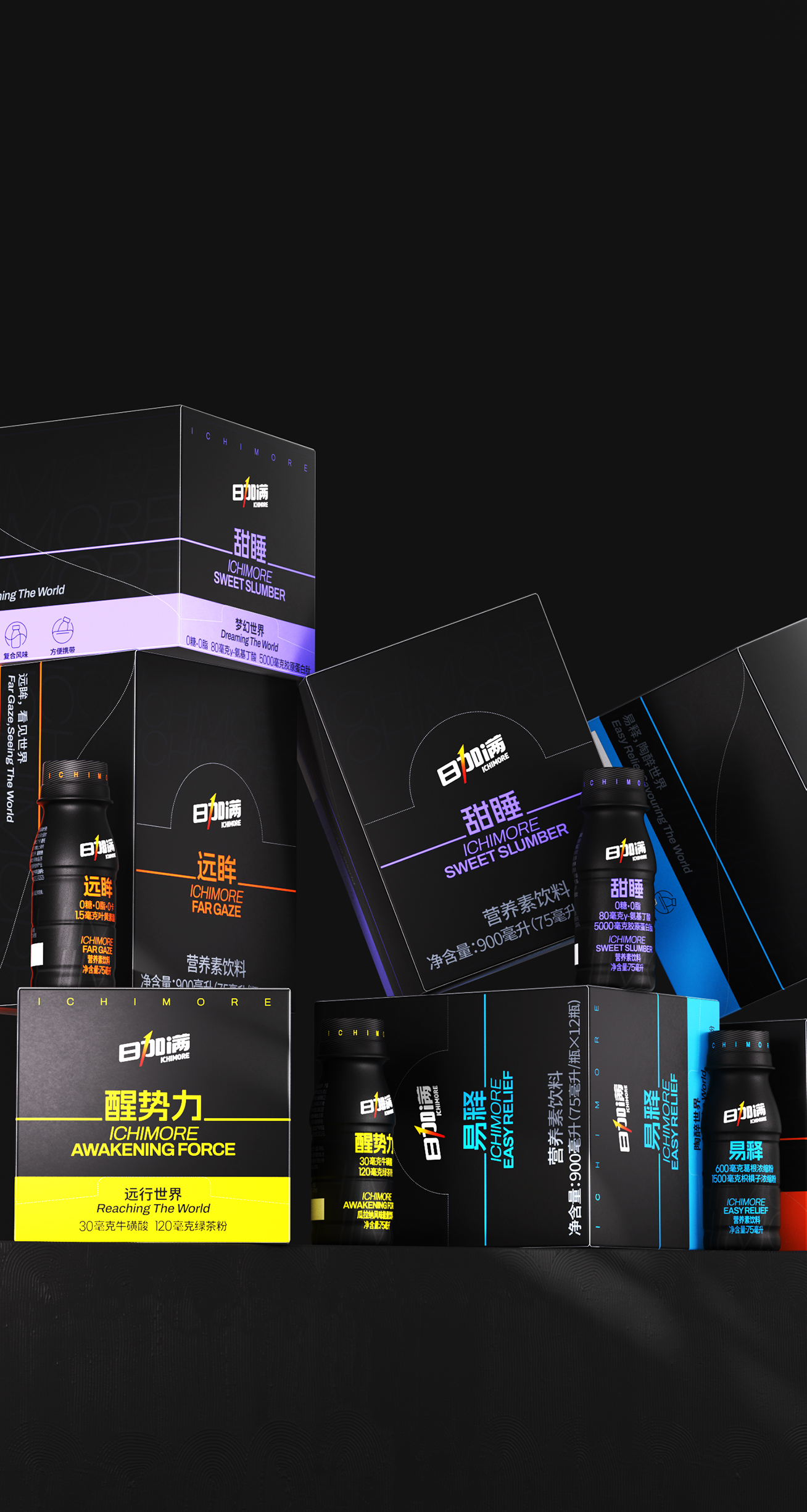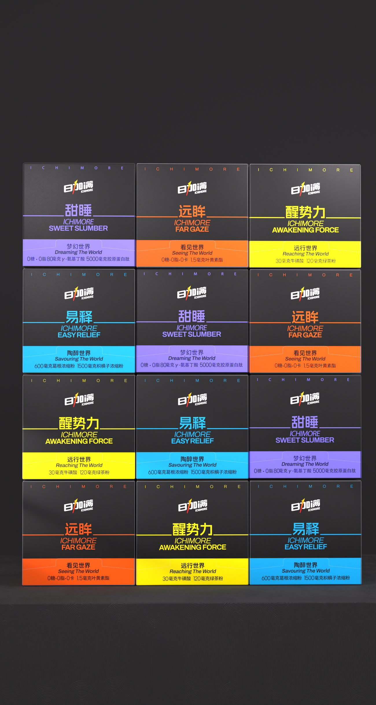The packaging design for Ichimore 75ml Nutrition Series SHOTS caters to the fast-paced, health-conscious lifestyle of modern urban men who value efficient nutritional supplement solutions. The design includes four distinct variants, each visually coded to a core benefit—boosting energy, protecting eyesight, liver care & alcohol relief, and sleep aid—through bold color differentiation. The portable bottles deliver ready-to-drink nutrition in a sleek, compact form, meeting urban men’ demand for efficient nutritional supplementation. Additionally, the combination of premium texture and technological aesthetics creates a memorable, distinctive visual identity for the product, ensuring standout shelf appeal.