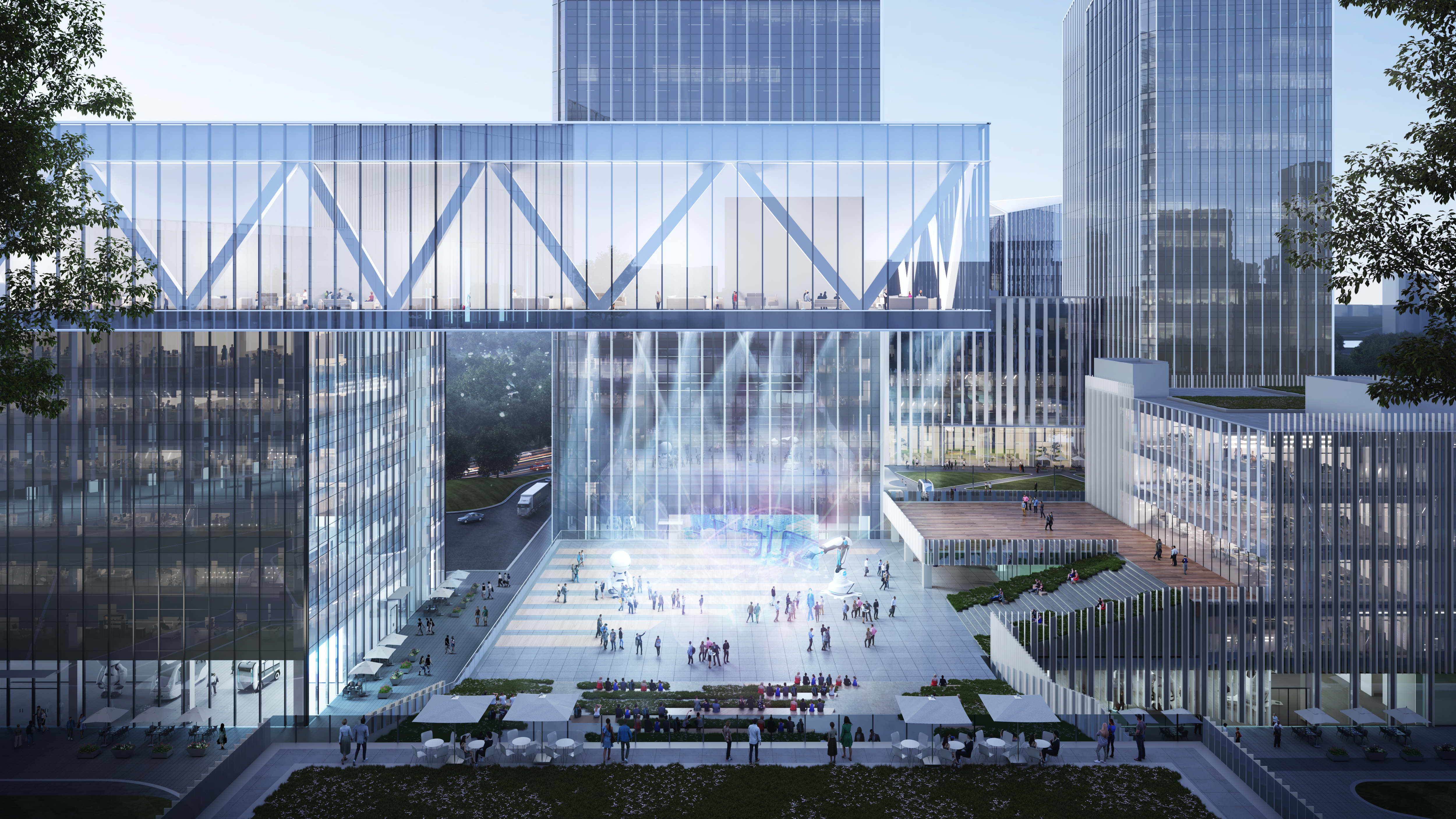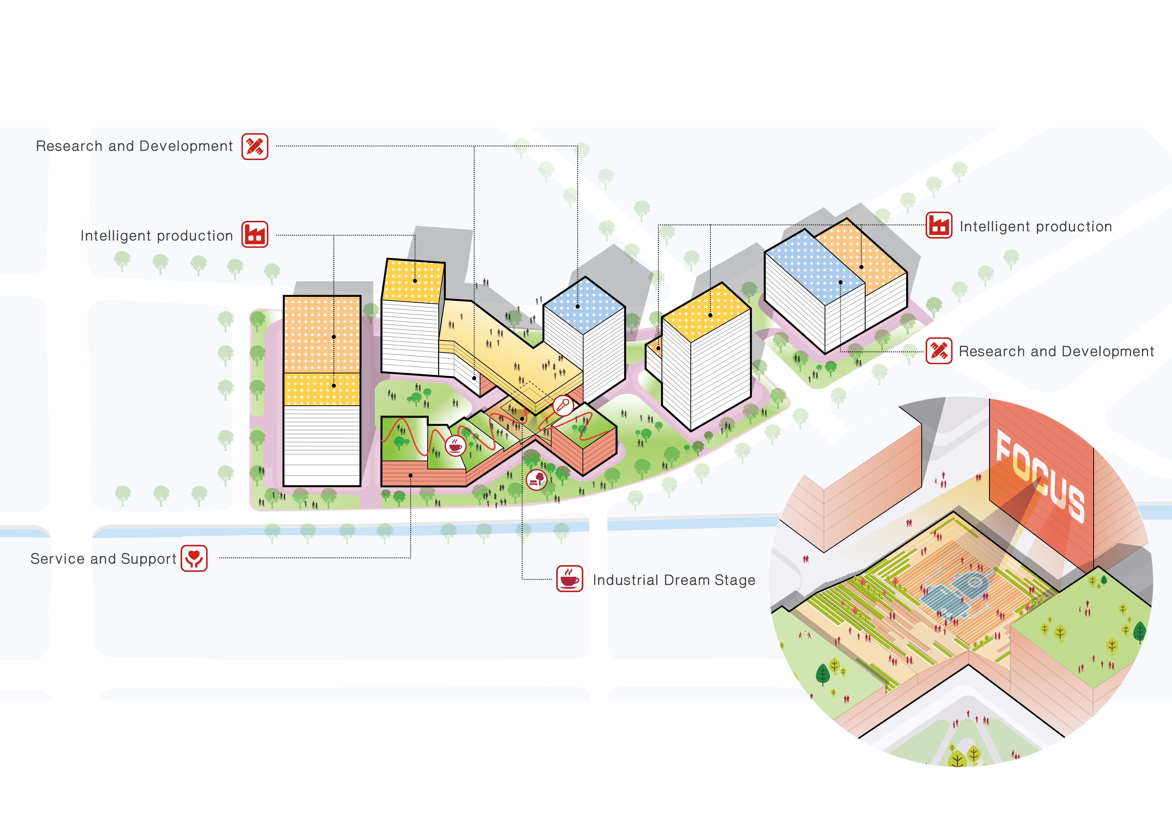 To accommodate the industrial upgrading, modern industrial parks are breaking geographical boundaries and creating open spaces to promote diverse business ecosystems and foster community engagement. At the heart of the park, we have planned the Innovation Lounge, equipped with facilities such as exhibition halls, business training centers, and leisure areas. Additionally, utilizing the cantilevered structures and open spaces of the tower buildings, we have created a core space called the "Dream Stage," an ideal venue for hosting events like press conferences, roadshows, and promotional activities. By providing open spaces, shared resources, and diverse social activities, we aim to build a sustainable, innovative, and free smart park.