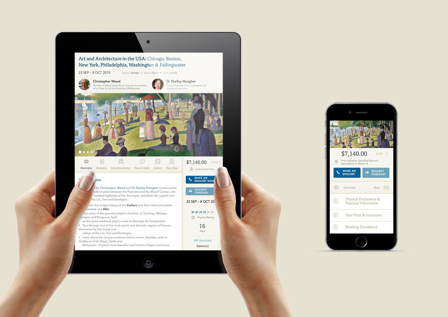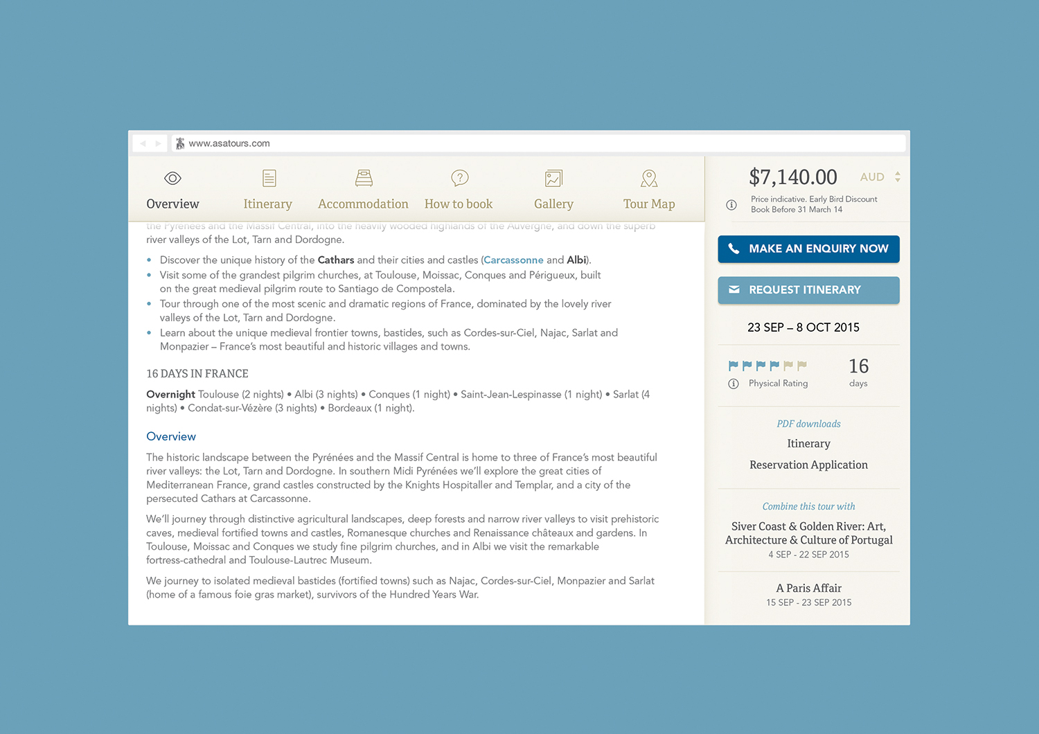 With a loyal and highly-engaged customer base and an older target demographic, the website needed to be engaging and easy to use but also provide users access to a wealth of content, imagery, maps, detailed itineraries and much more. Navigational tools and clever arrangement of content allows the user to browse and explore tours, or to delve into the detail, as they chose and with minimal cognitive load.