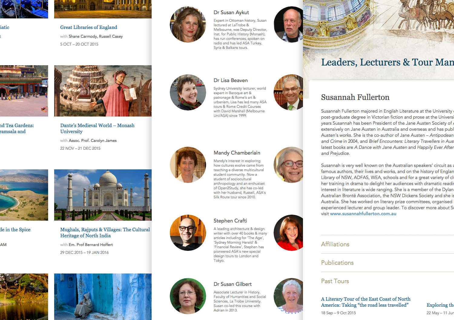 The resulting website is a vibrant and engaging fully responsive website that acts as a hub for information on upcoming cultural tours, events, lecturers and tour leaders. The user is instantly charmed with prominent and emotive visuals, capturing the essence of the tours provided by ASA.