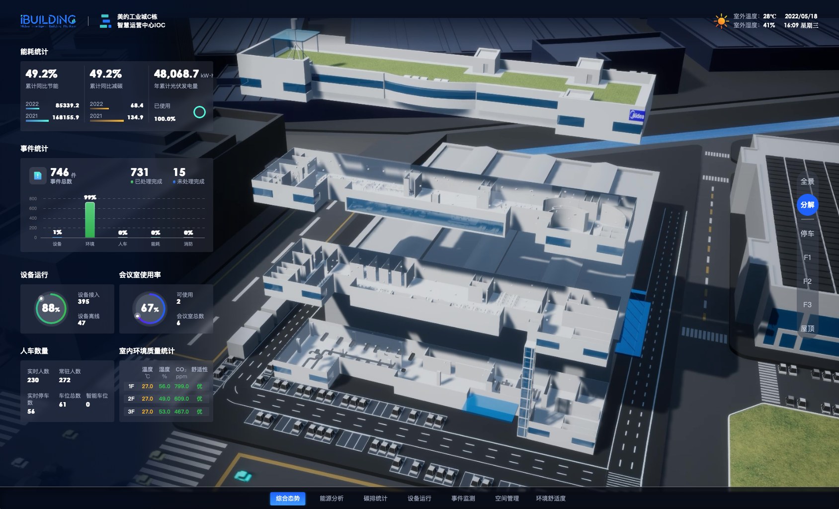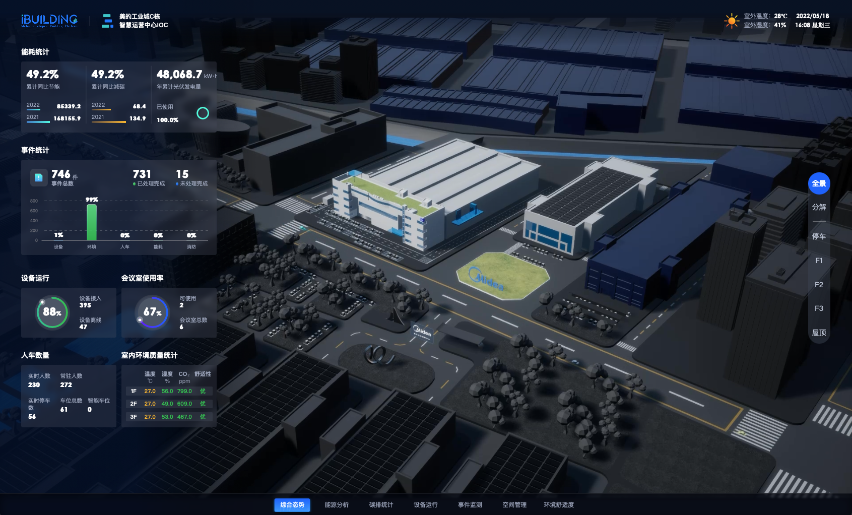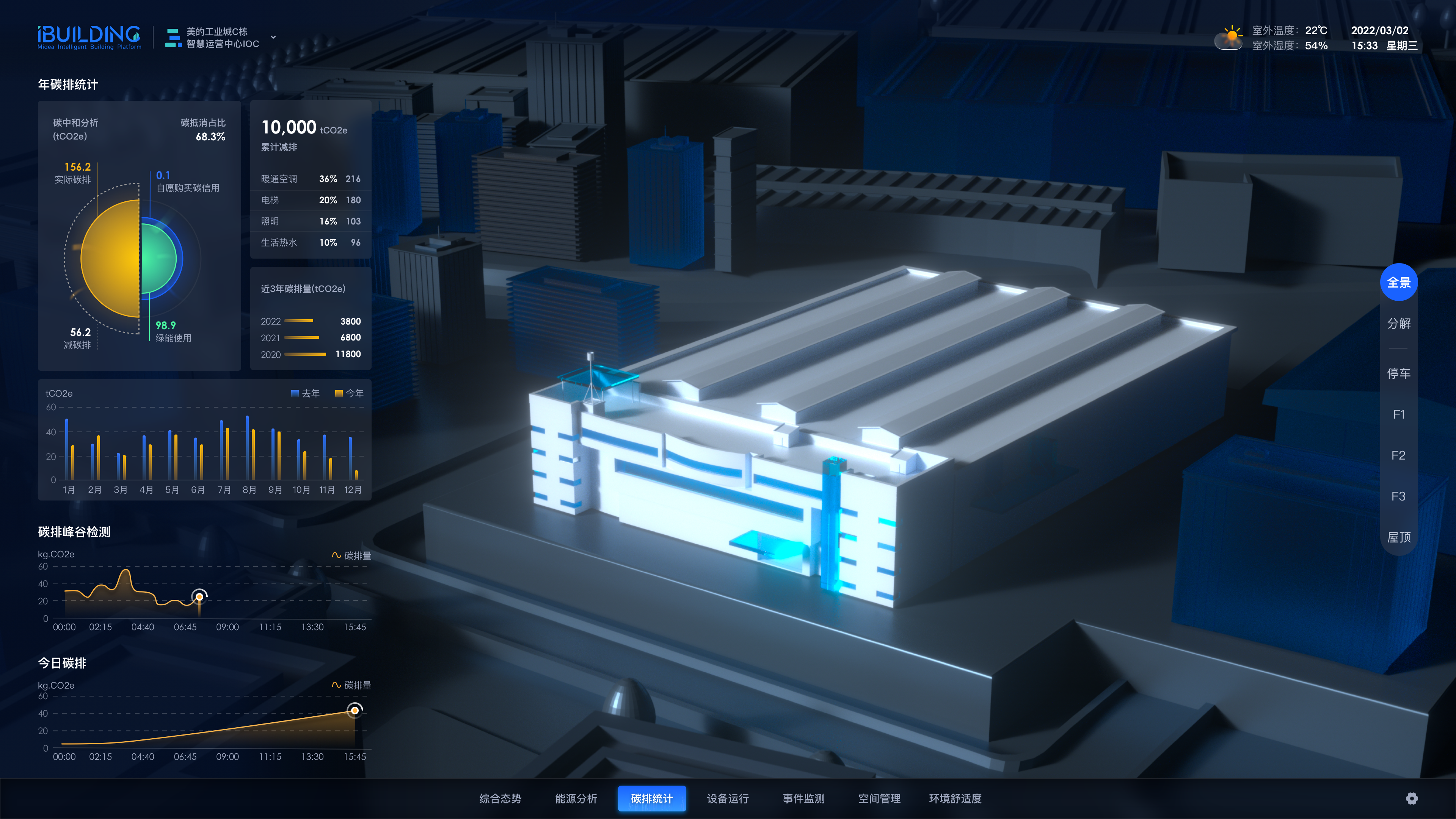 Since China put forward the goal of carbon peaking and carbon neutrality in September 2020, different sectors have responded with practical measures. Industrial parks, though a strong driver of urban economic growth, account for more than 31% of the country's carbon dioxide emissions, which hinders carbon control and reduction. Therefore a low-carbon transformation is urgent. Relying on the digital twin technology, Midea creates an IOC smart operation and maintenance center with massive amount of data. The system helps companies to manage equipment and reduce energy consumption through a standard process, thus promoting energy saving and emission cut and speeding up the realization of carbon peaking and carbon neutrality.