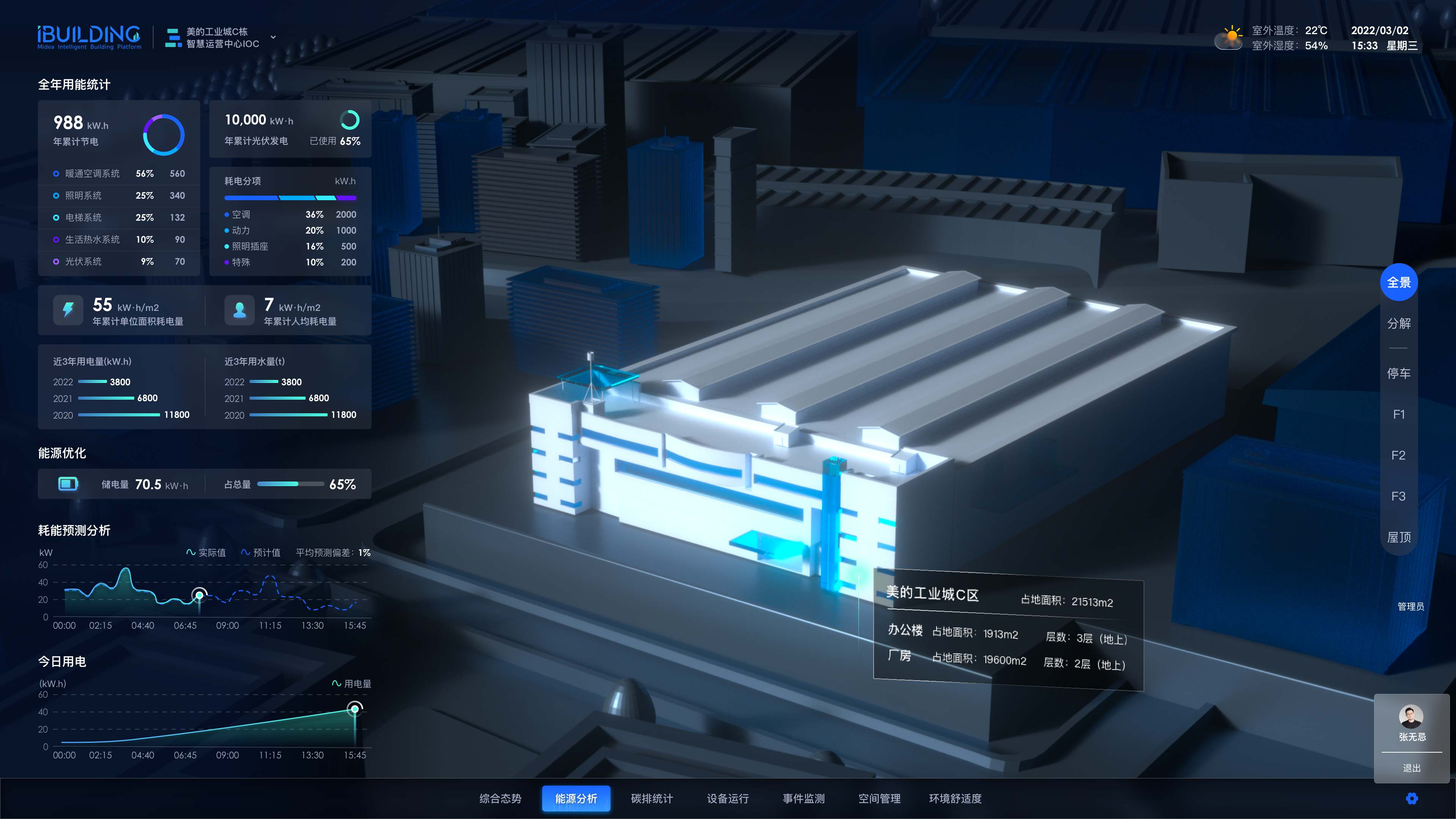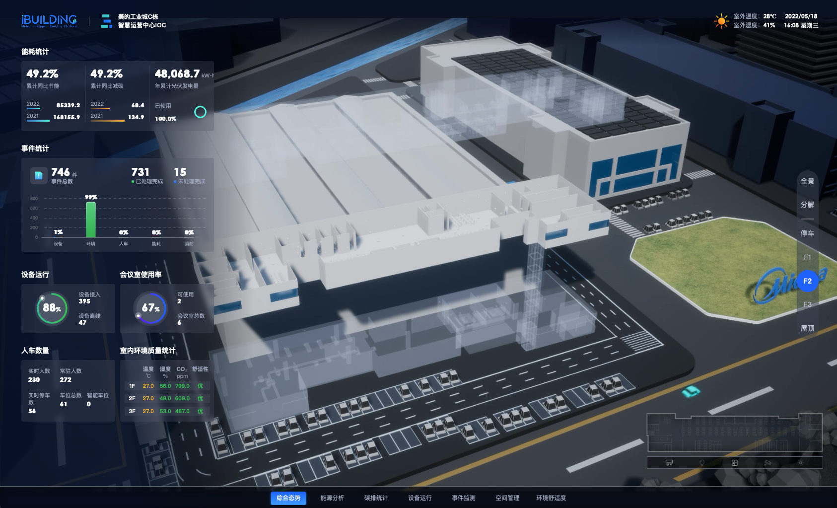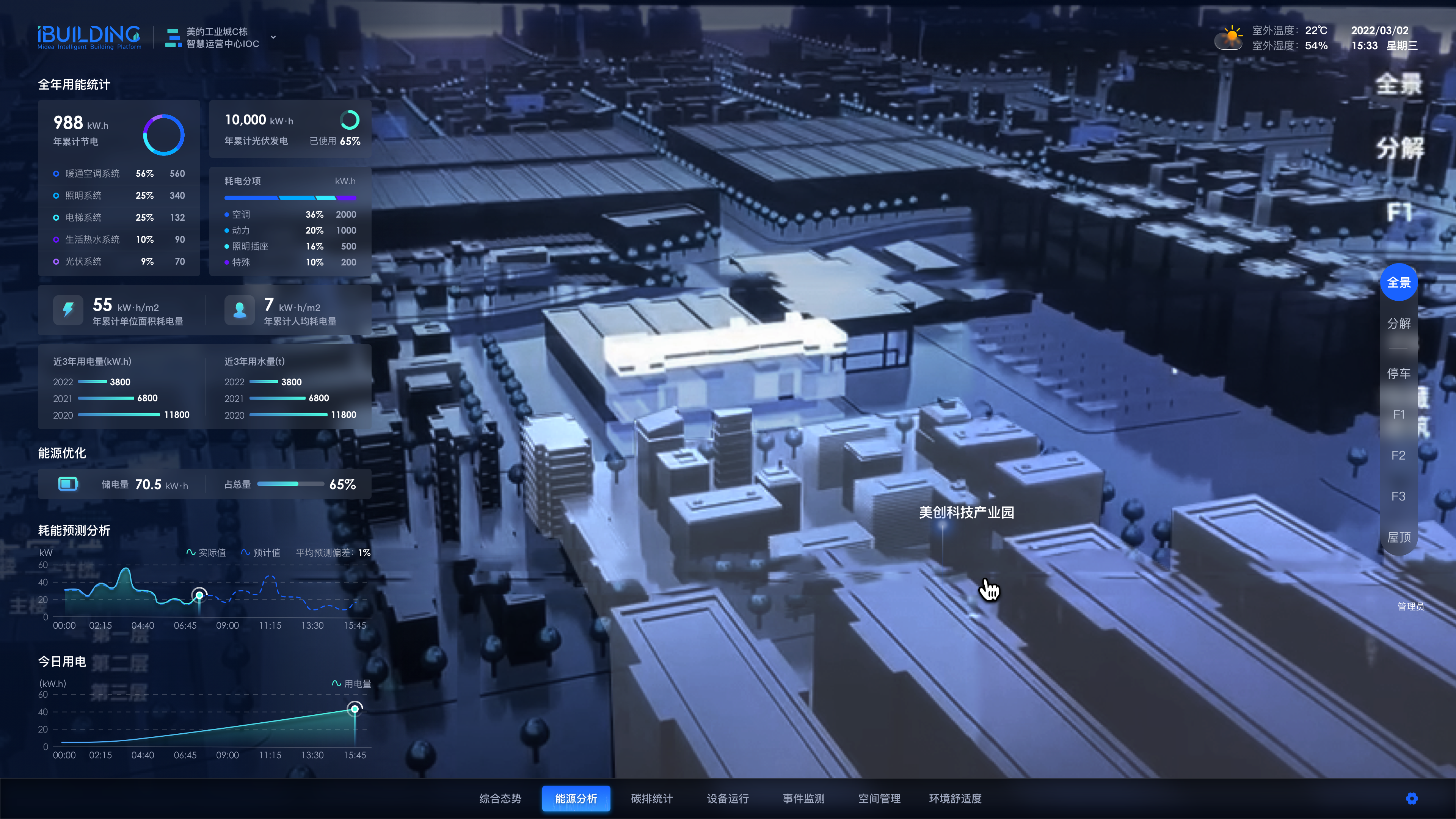 Since China put forward the goal of carbon peaking and carbon neutrality in September 2020, different sectors have responded with practical measures. Industrial parks, though a strong driver of urban economic growth, account for more than 31% of the country's carbon dioxide emissions, which hinders carbon control and reduction. Therefore a low-carbon transformation is urgent. Relying on the digital twin technology, Midea creates an IOC smart operation and maintenance center with massive amount of data. The system helps companies to manage equipment and reduce energy consumption through a standard process, thus promoting energy saving and emission cut and speeding up the realization of carbon peaking and carbon neutrality.