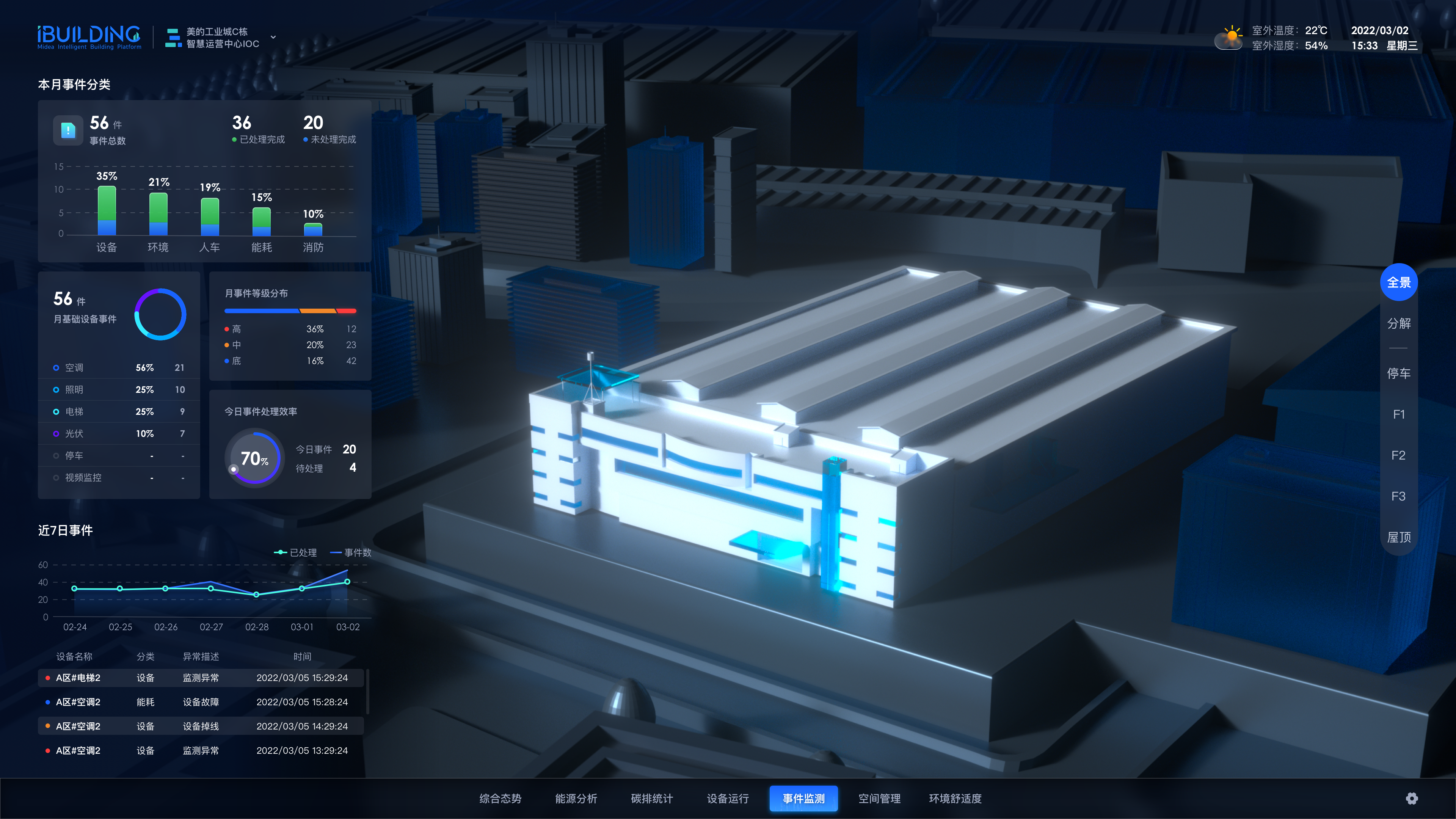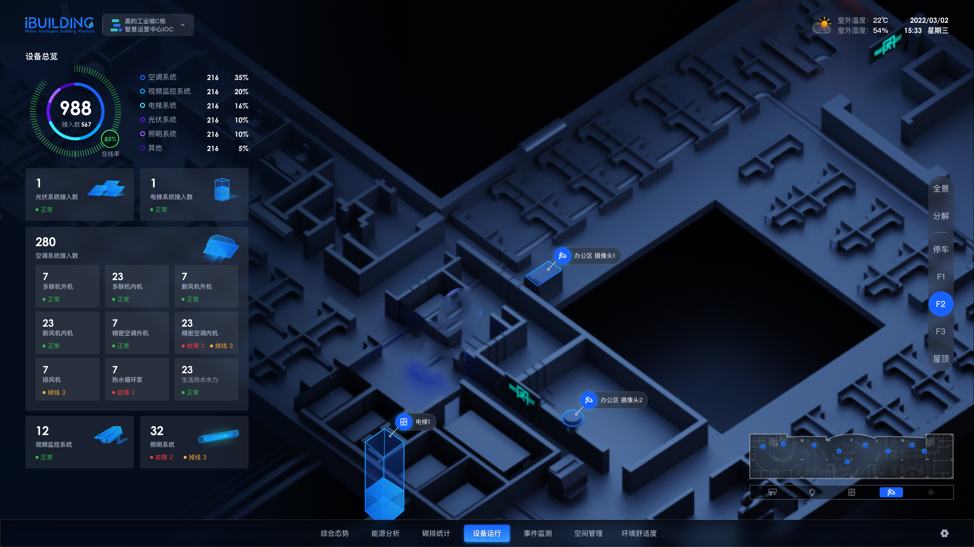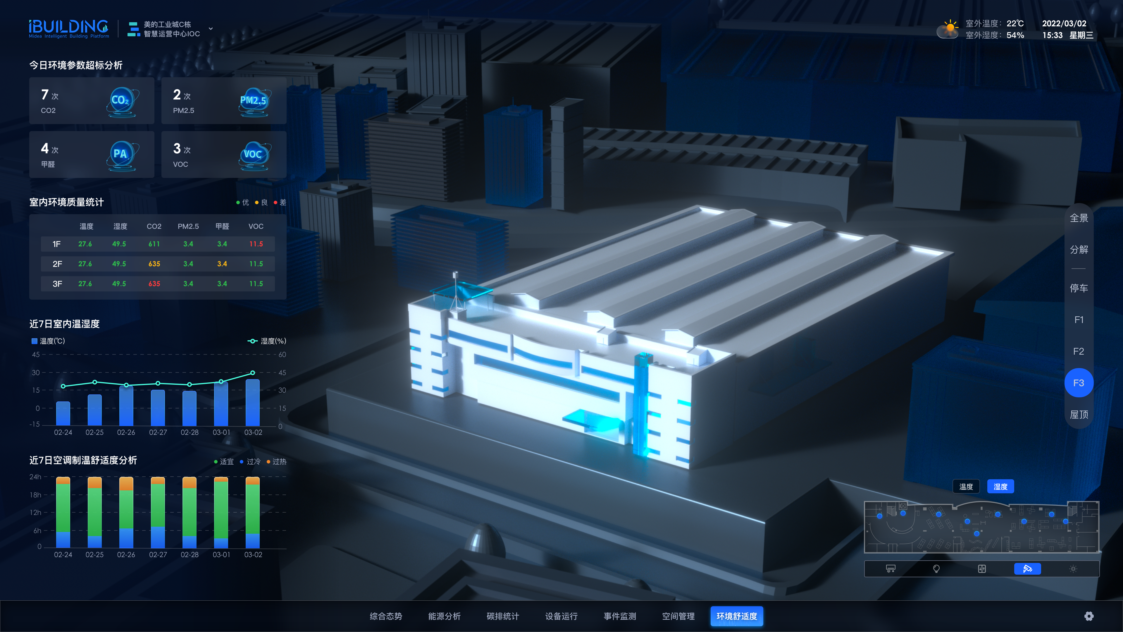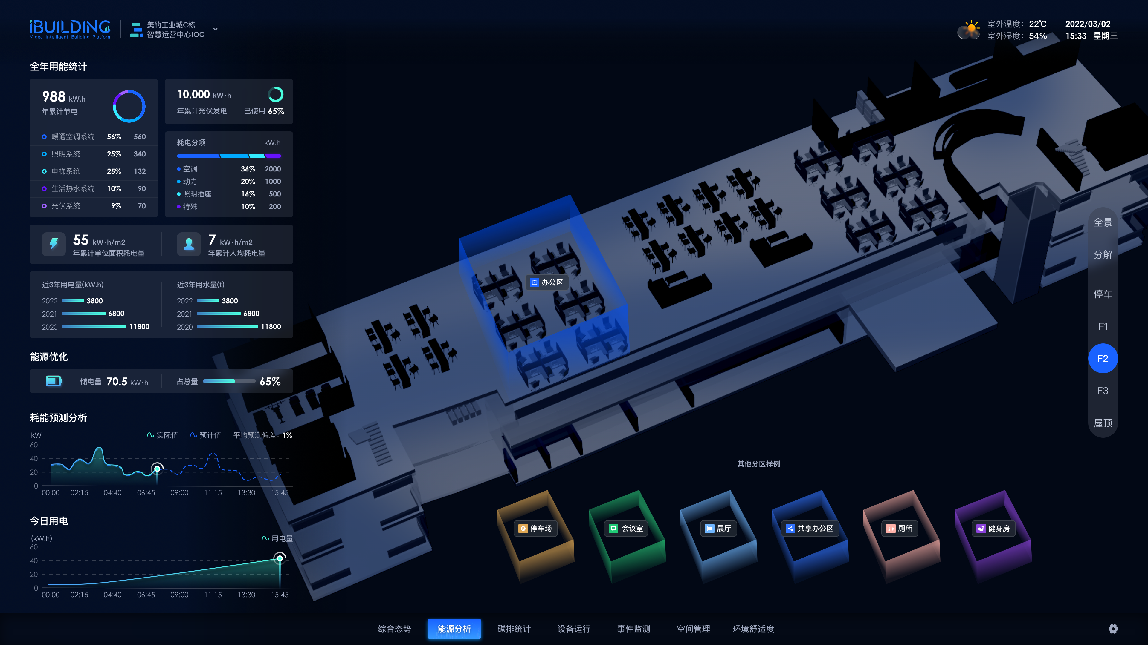 The system integrates system data of different businesses, links equipment, energy consumption and the environment, records energy consumption data in real time, customizes intelligent energy saving solutions through the supporting backstage management system, and formulates reasonable operational plans for different time periods. Also it can display integrated information such as real-time warnings of important events, multi-dimensional statistics of energy consumption and real-time analysis of the indoor environment, allowing park managers to gain three-dimensional insight into the building's situation.