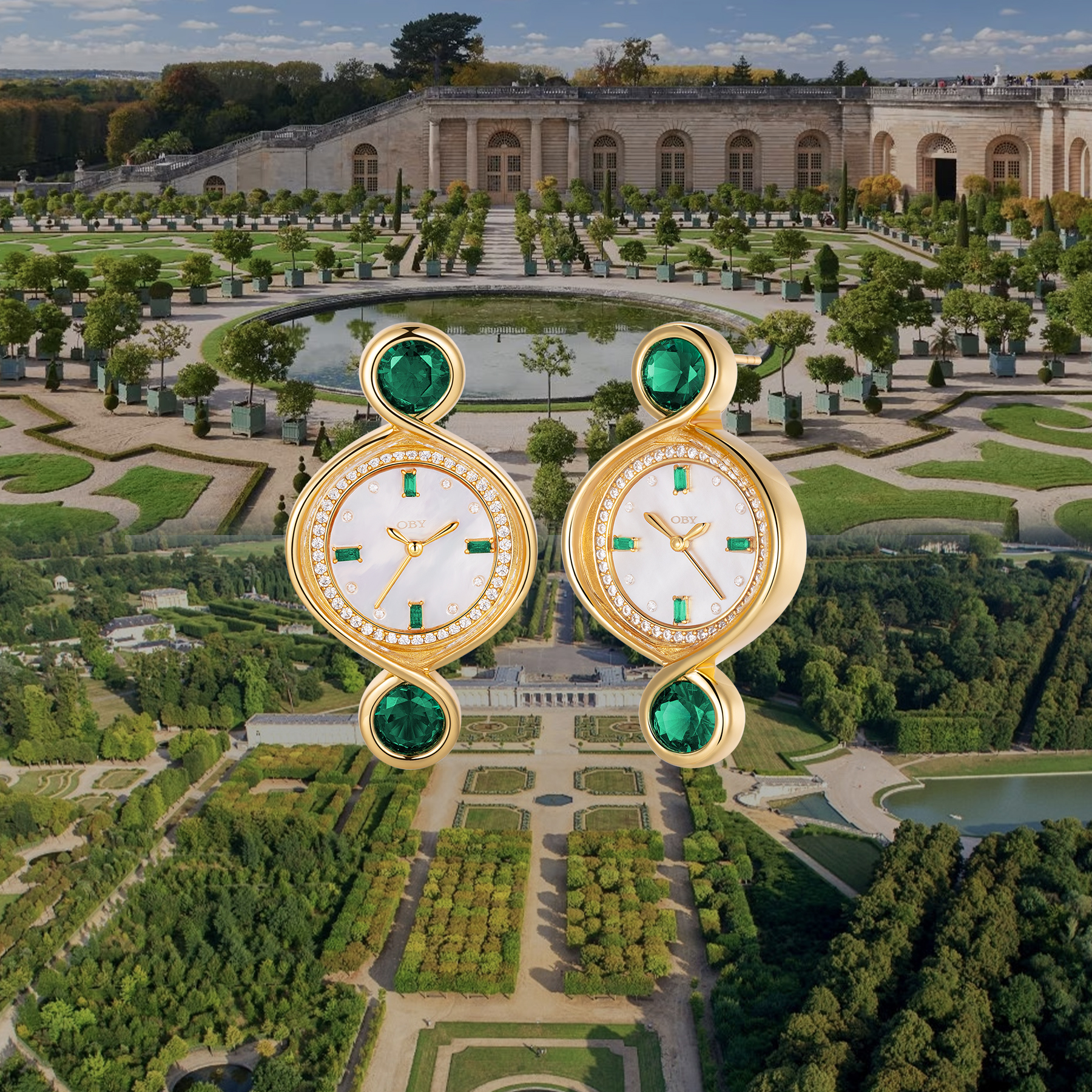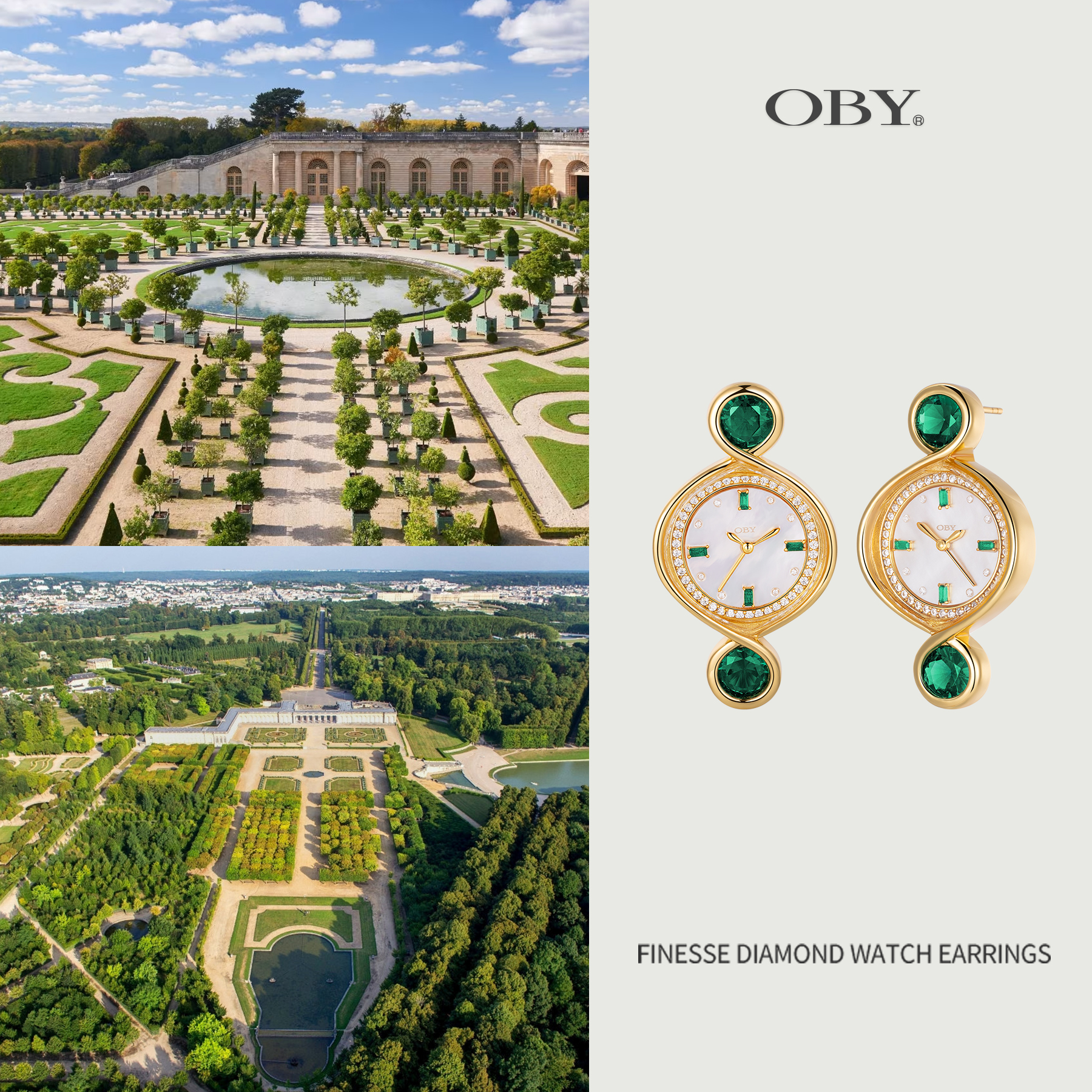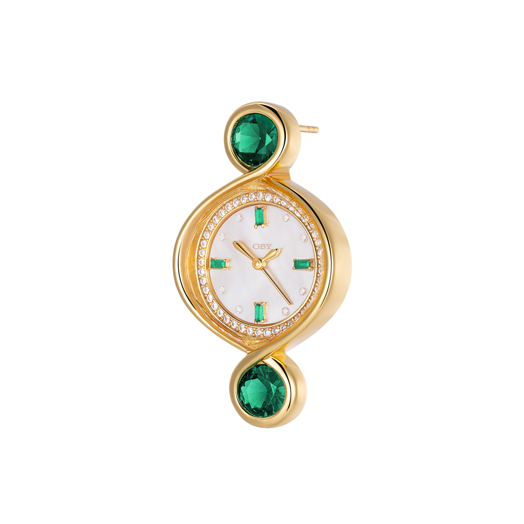 Inspired by the grandeur of Baroque architecture and the gardens of Versailles, this earring features graceful arcs and vibrant green emeralds reminiscent of lush greenery. At the center, an intricate clock face symbolizes the palace's precision, while lab-grown diamonds add luxury with sustainability. Blending French culture, history, and modern design, OBY creates eco-friendly jewelry celebrating nature and style, empowering women to express elegance and conscience.
