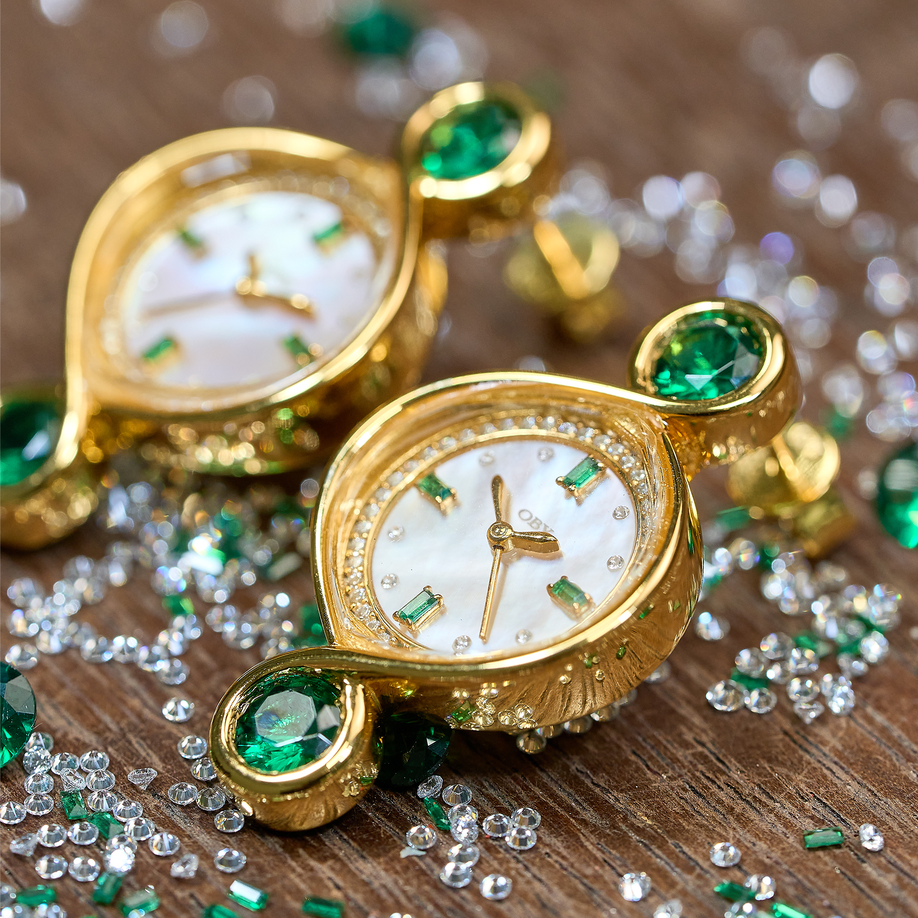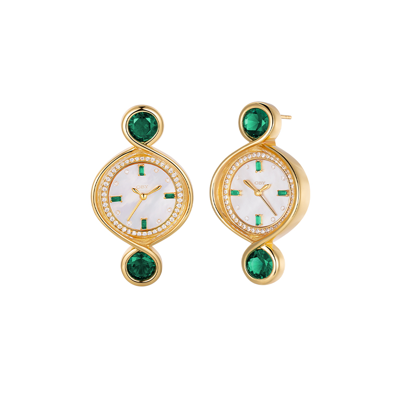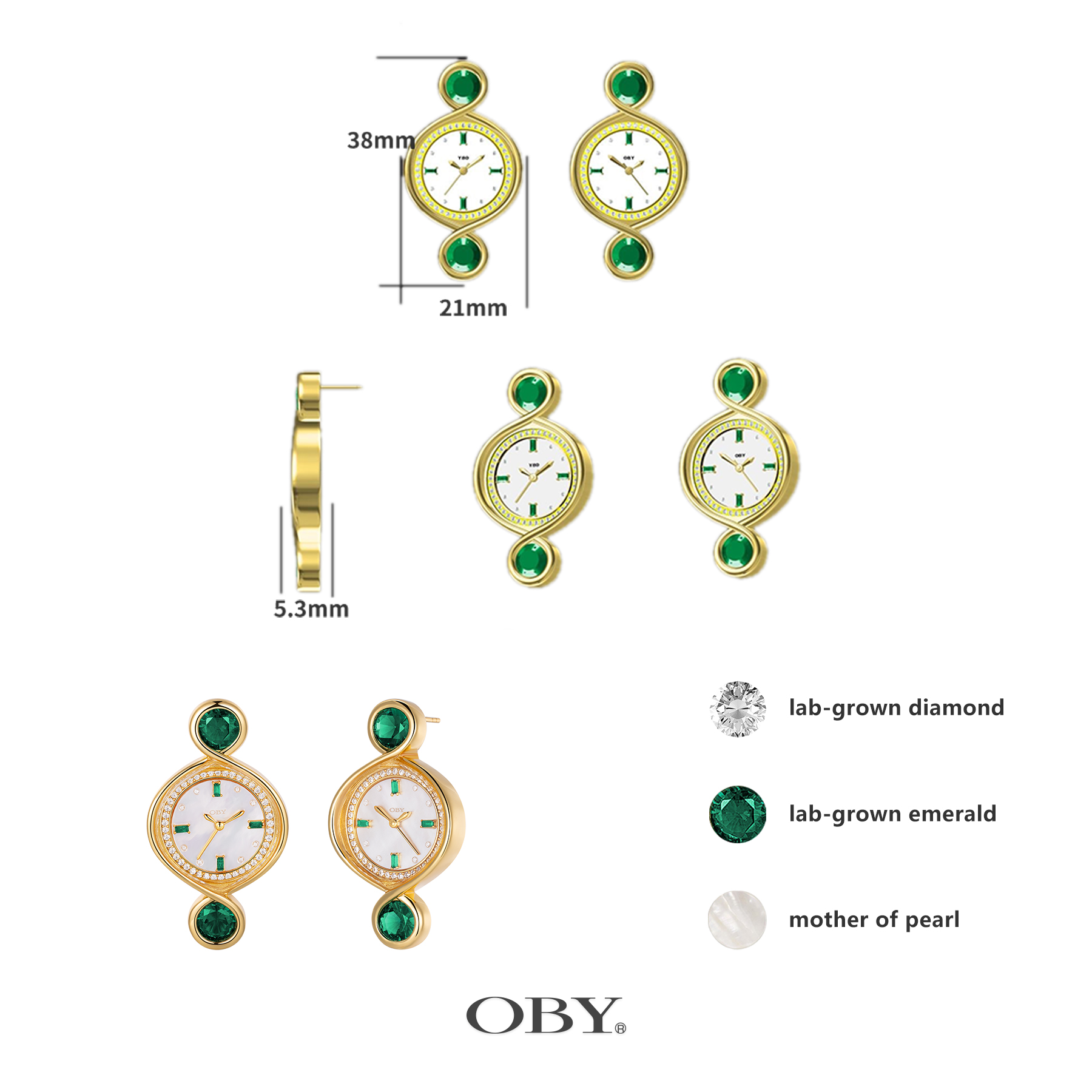 Inspired by the grandeur of Baroque architecture and the gardens of Versailles, this earring features graceful arcs and vibrant green emeralds reminiscent of lush greenery. At the center, an intricate clock face symbolizes the palace's precision, while lab-grown diamonds add luxury with sustainability. Blending French culture, history, and modern design, OBY creates eco-friendly jewelry celebrating nature and style, empowering women to express elegance and conscience.