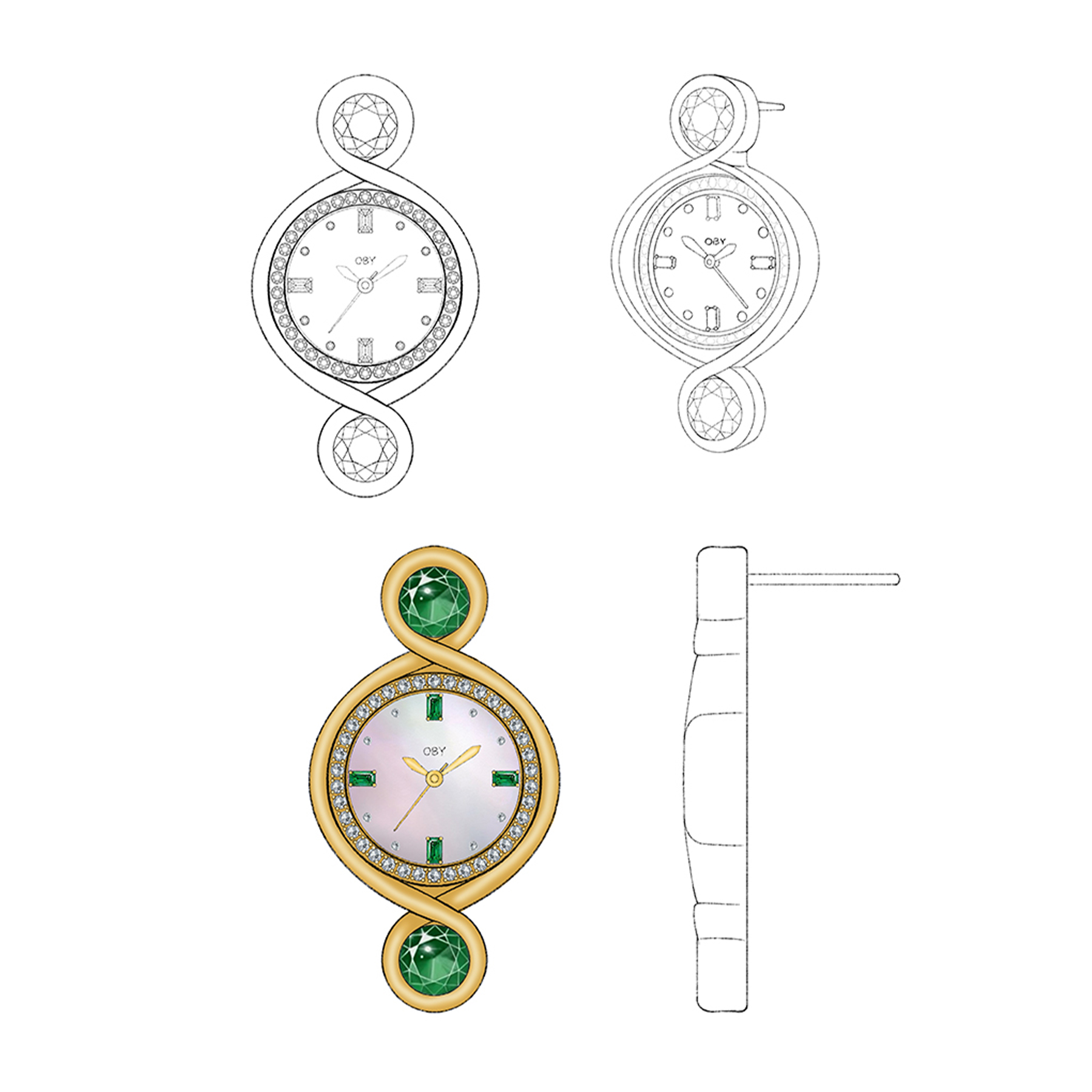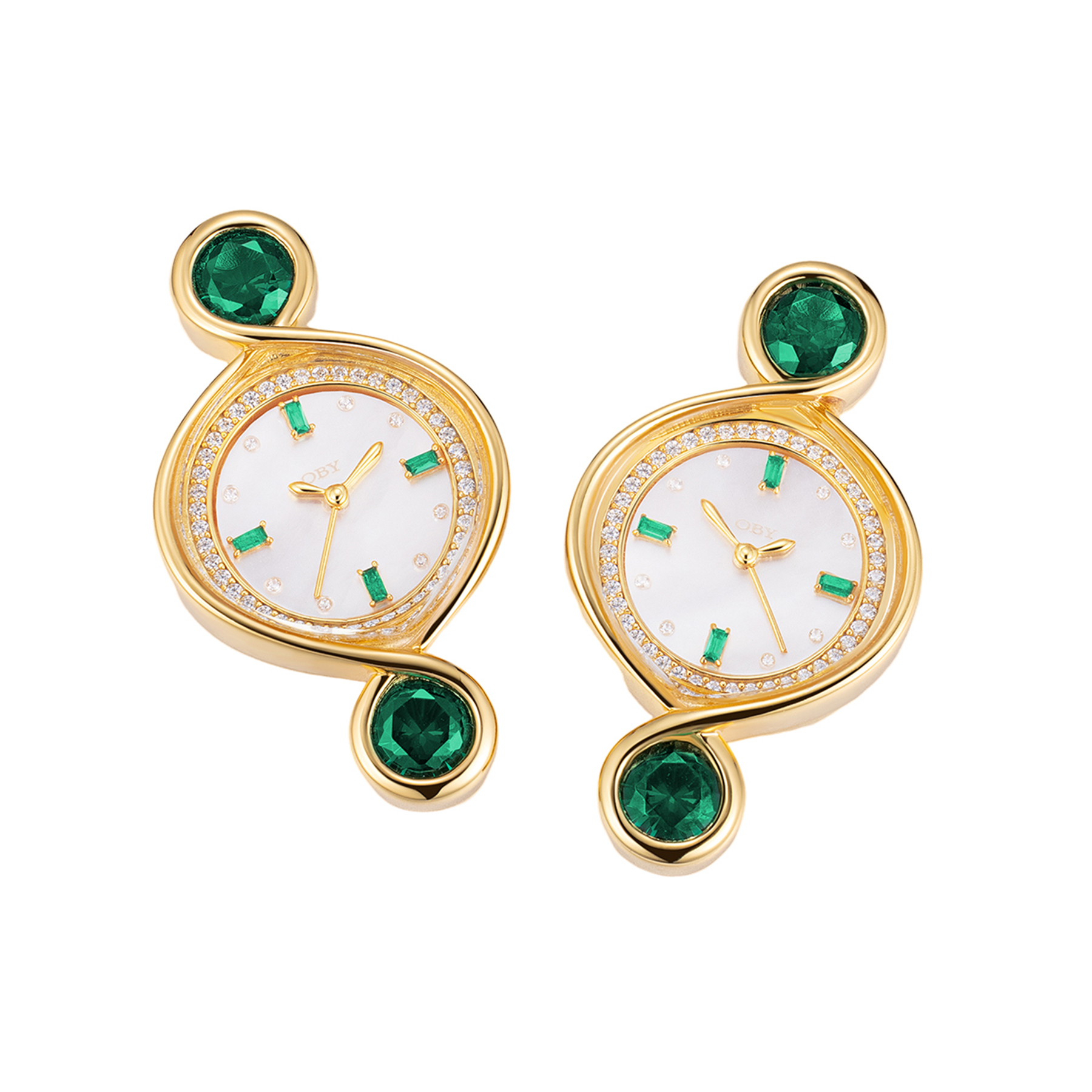 This earring design offers a blend of elegance and functionality with its unique clock face and sustainable materials. The key frames include the central clock face made of mother-of-pearl, flanked by lab-grown emeralds and diamonds. The design operates as a statement piece, offering versatility with its subtle elegance, while the lab-grown materials ensure eco-friendliness. The polished finish and precise craftsmanship elevate its aesthetic, providing both luxury and sustainability, delivering a superior result for conscious fashion.