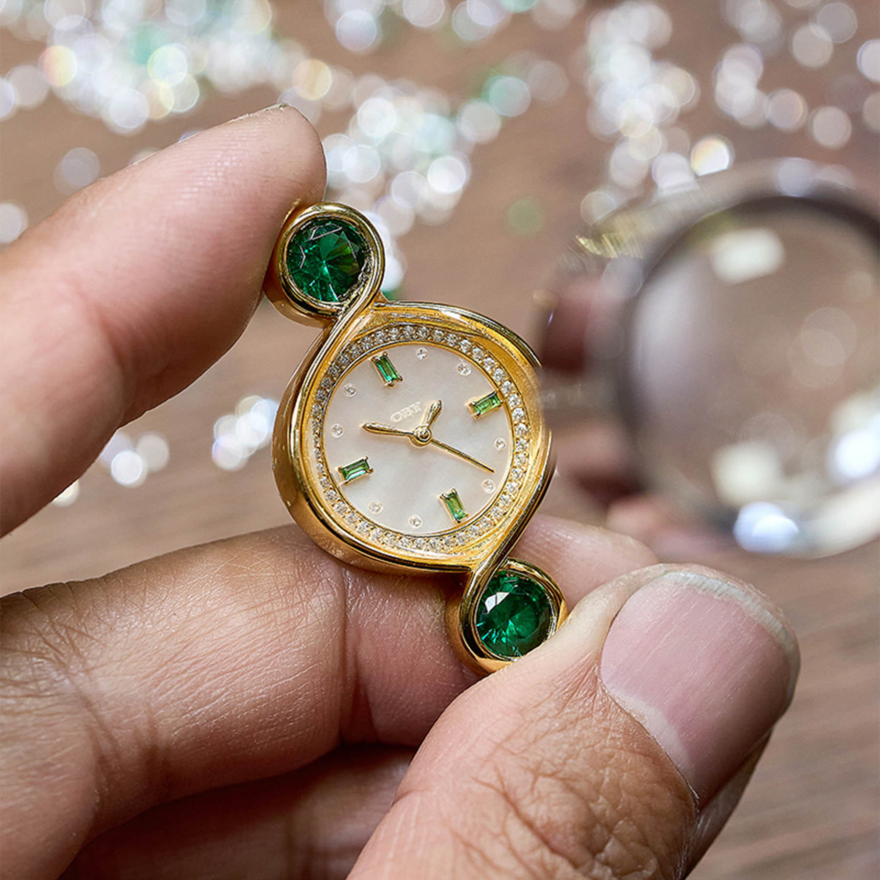 Finess Diamond Watch Earrings blend French history, nature, and modern craftsmanship. Inspired by Baroque elegance and Versailles' gardens, this earring combines graceful arcs, vibrant emeralds, symbolizing a lush garden, new life, and hope. A mother-of-pearl clock face represents the nurturing spirit of women. Lab-grown diamonds offer sustainable luxury, empowering women to express elegance and environmental consciousness through timeless, eco-friendly jewelry.