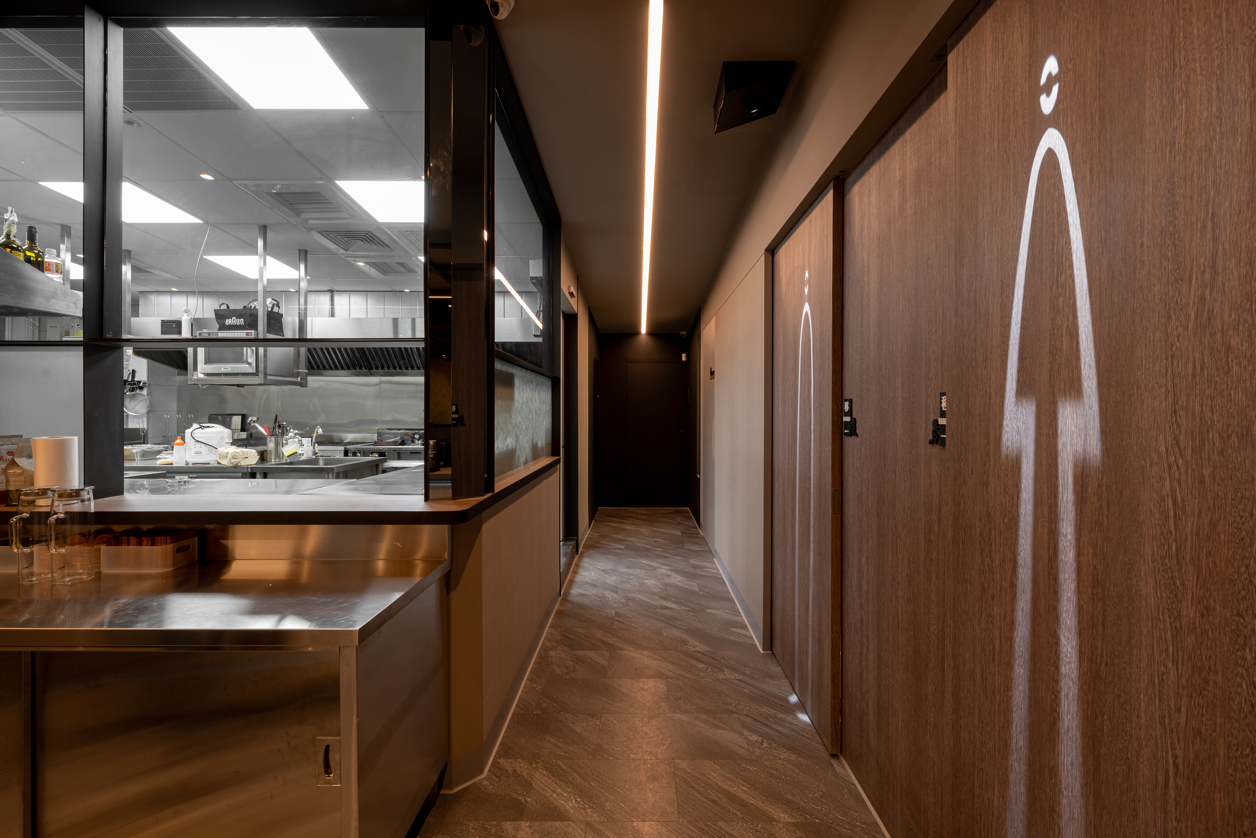 The café features flexible seating arrangements that cater to both individual and group gatherings. A semi-open kitchen, framed with black-edged glass and stainless steel countertops, provides transparency into the cooking process, fostering customer trust and serving as an engaging focal point. Restroom signage is creatively displayed through light projections, adding an element of whimsy to directional cues. Strategically located on a busy street corner, the café's design transforms it into an urban stage, inviting passersby to pause and enjoy the atmosphere.