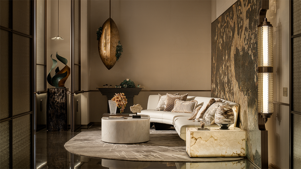 Material Combination: Materials such as wood veneer, stone, marble onyx, metal, leather, and fiberglass are selected to balance the warm and natural texture with the exquisite and high-end style. Examples include the metal + sandstone wall lamp in the front hall and the metal and scroll-shaped artworks in the sand table area.