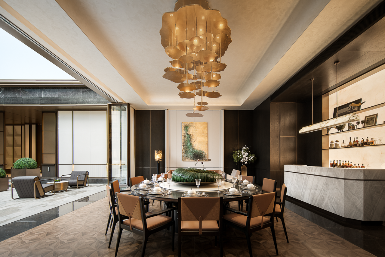 Intangible Cultural Heritage (ICH) Integration into Soft Decoration: ICH crafts such as Shu brocade, silver filigree, lacquerware, and mother-of-pearl inlay are incorporated into soft decoration. For instance, the patterns of Shu brocade are continued on furniture screens, artworks adopt the lacquerware and silver filigree craftsmanship, and mother-of-pearl inlay is used for the decoration of private banquet halls.