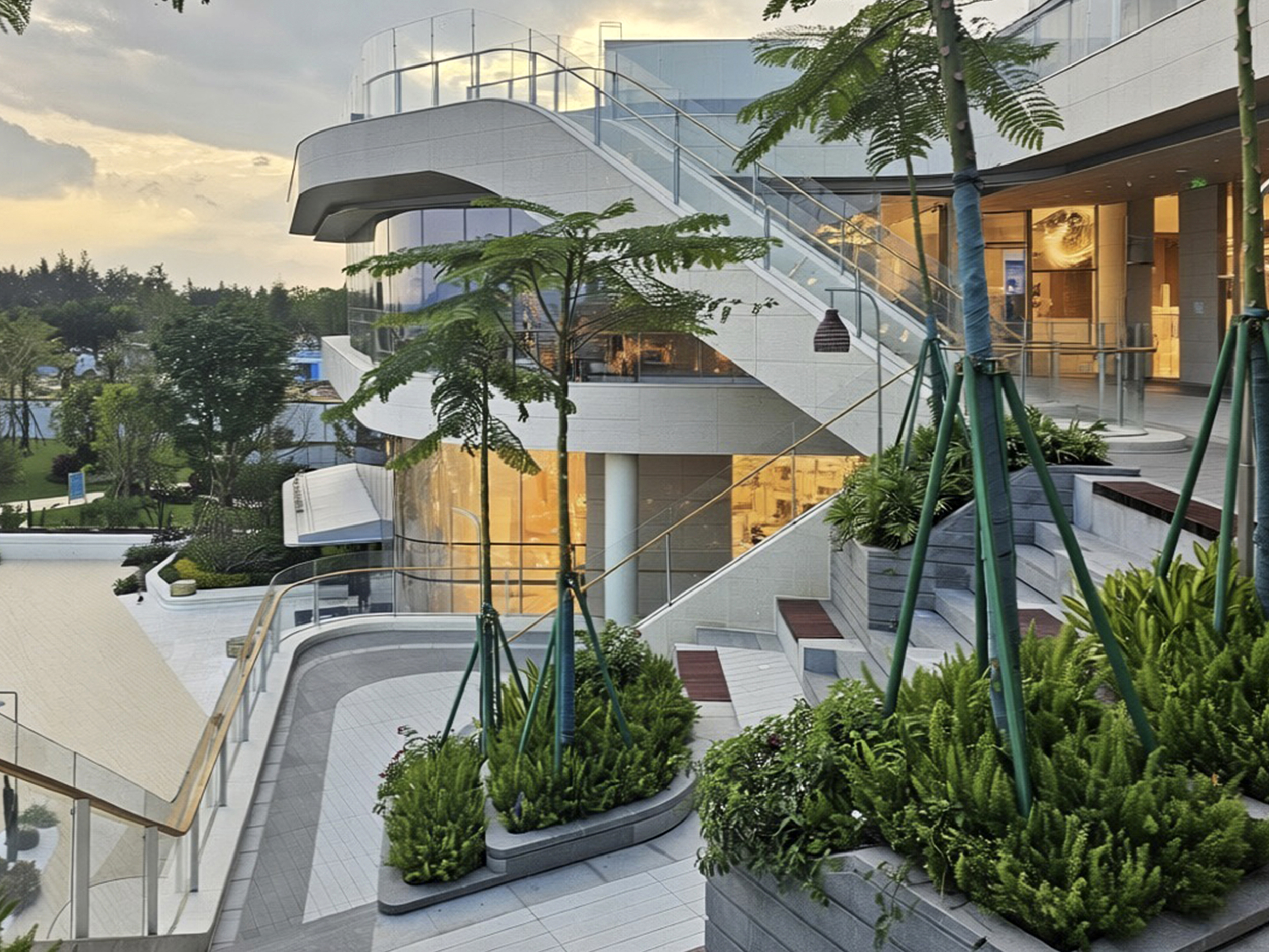 The staggered building volumes create multiple semi-outdoor spaces on the ground floor and the upper floors, which are interconnected, creating a continuous and dynamic spatial flow. Escalators, steps and green slopes break the boundaries between floors. People wander among various platforms, just like strolling through three-dimensional streets.
