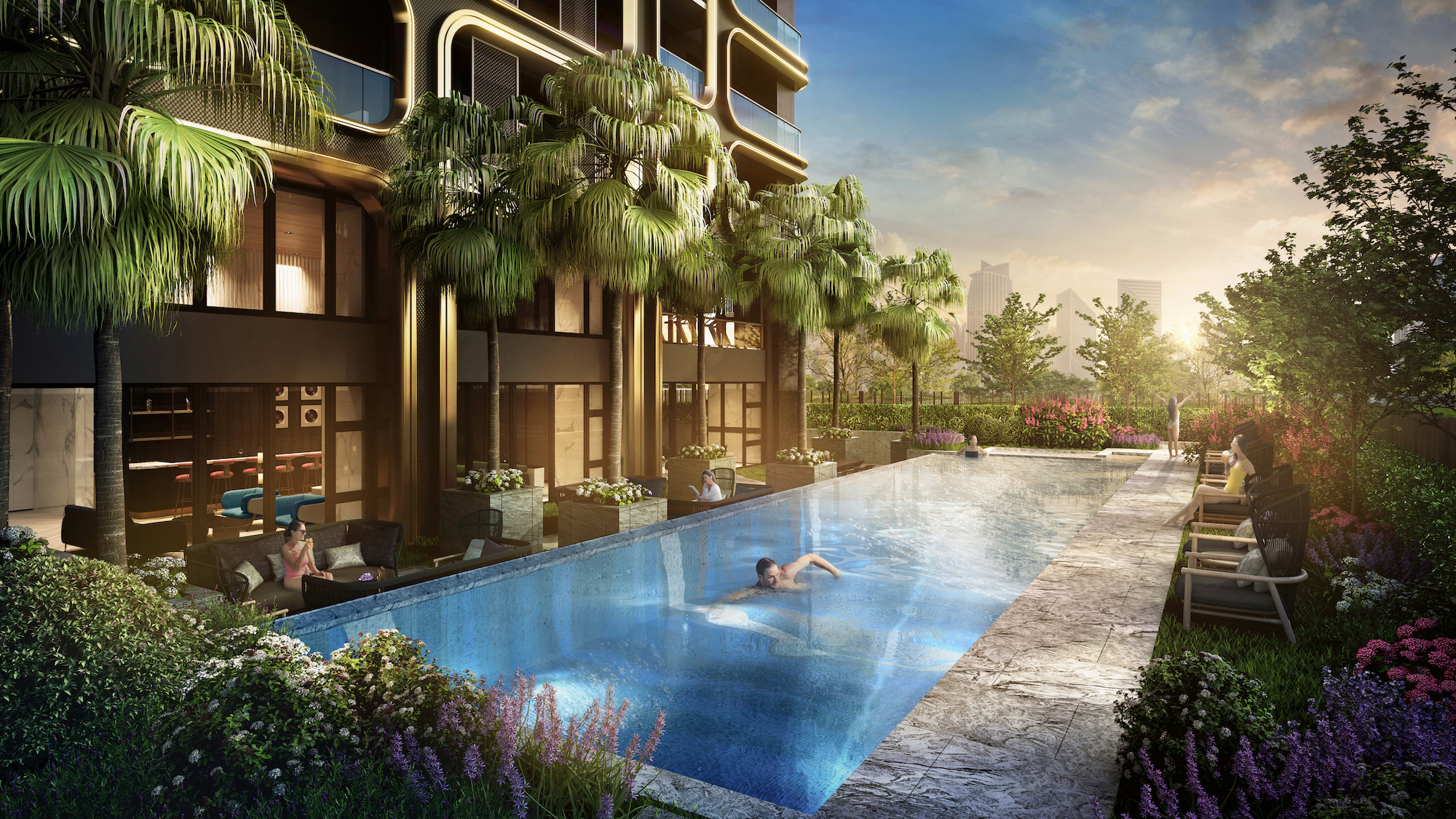 Located in Taichung City, the region of magnificent mountains, winding rivers, and numerous art venues - we employ the image of bamboo on the facade to echo the city’s extraordinary environmental features. Two towers were built on the site with detailed structure and proportions to create a lofty appearance. The protruding structure on the roof resembles bamboo growing high into the clouds, virtually extending the buildings, and proclaiming magnificence. With an outdoor pool surrounded by greenery and a fashionable gallery, public amenity areas with harmonious indoor and outdoor boundaries are created in this luxurious residential project. A hidden urban oasis rooted in a glamorous city. As residents’ experiences of strolling in the bamboo forest. The proportions of the balcony resemble a theater box seat, while the working balcony behind the expended metal mesh panel. Inspired by bonsai art, the public areas start from the lobby, embellished with tree silhouettes and a reception desk made of stone slate, and a backdrop made of artistic glass with water reflection patterns, to the Art Plaza equipped with a Jazz Bar, and to the outdoor pool surrounded by greenery.