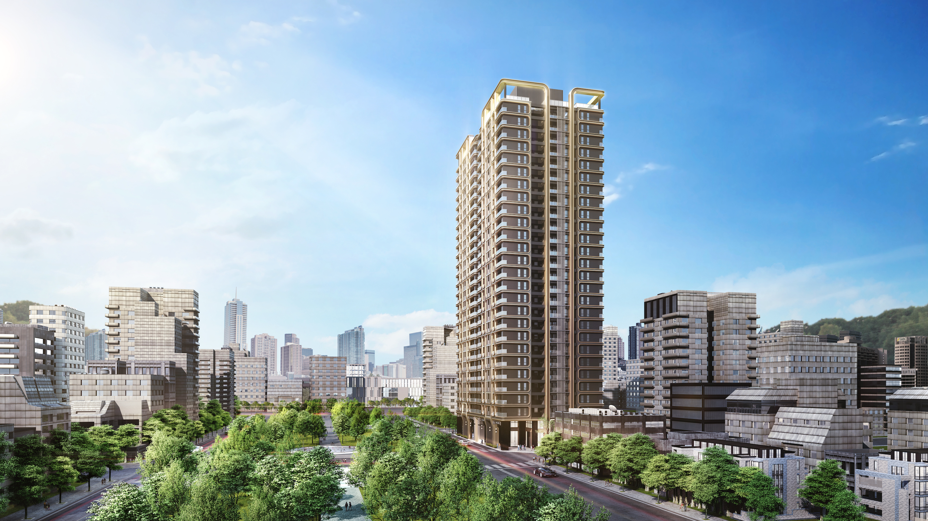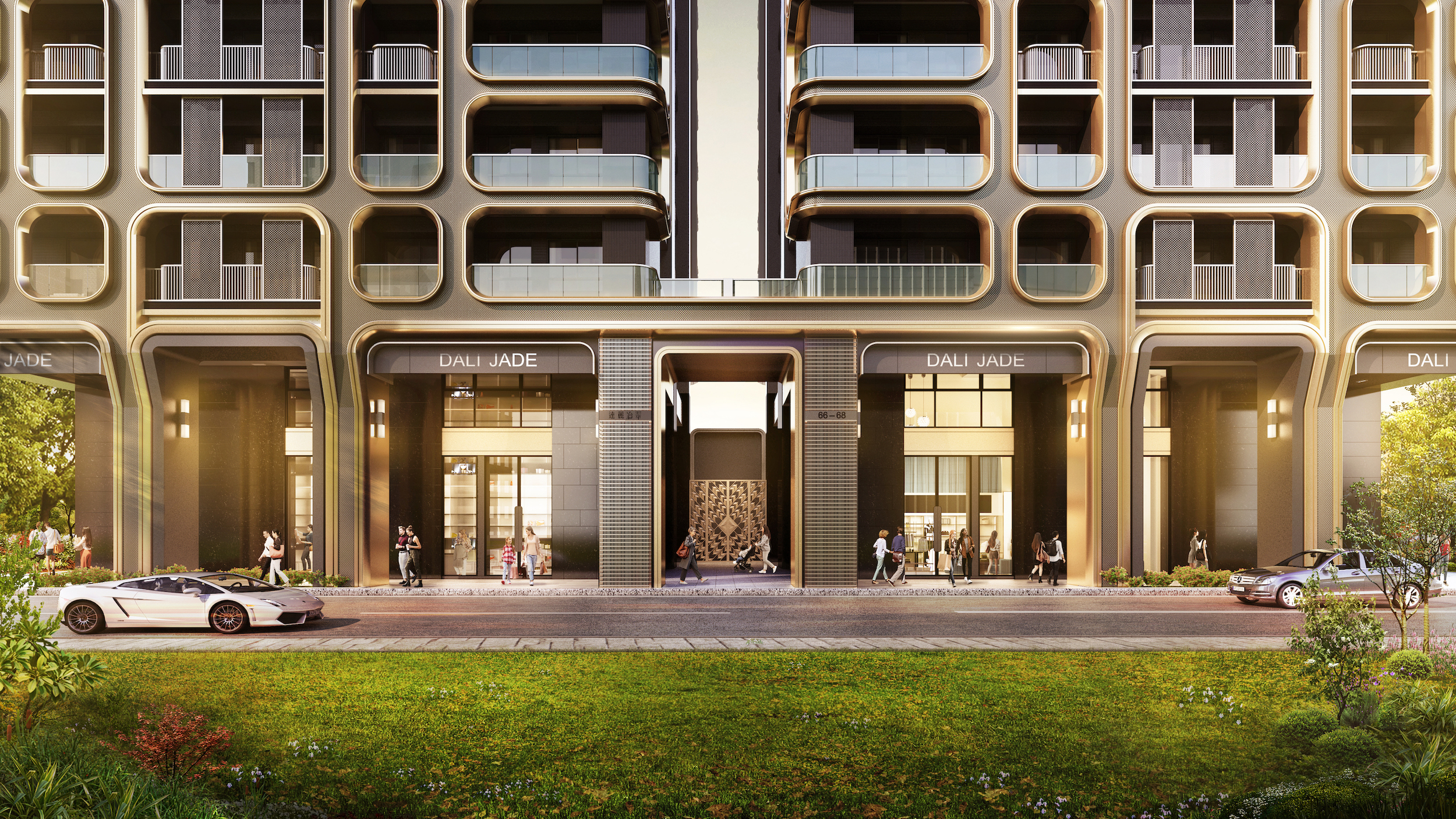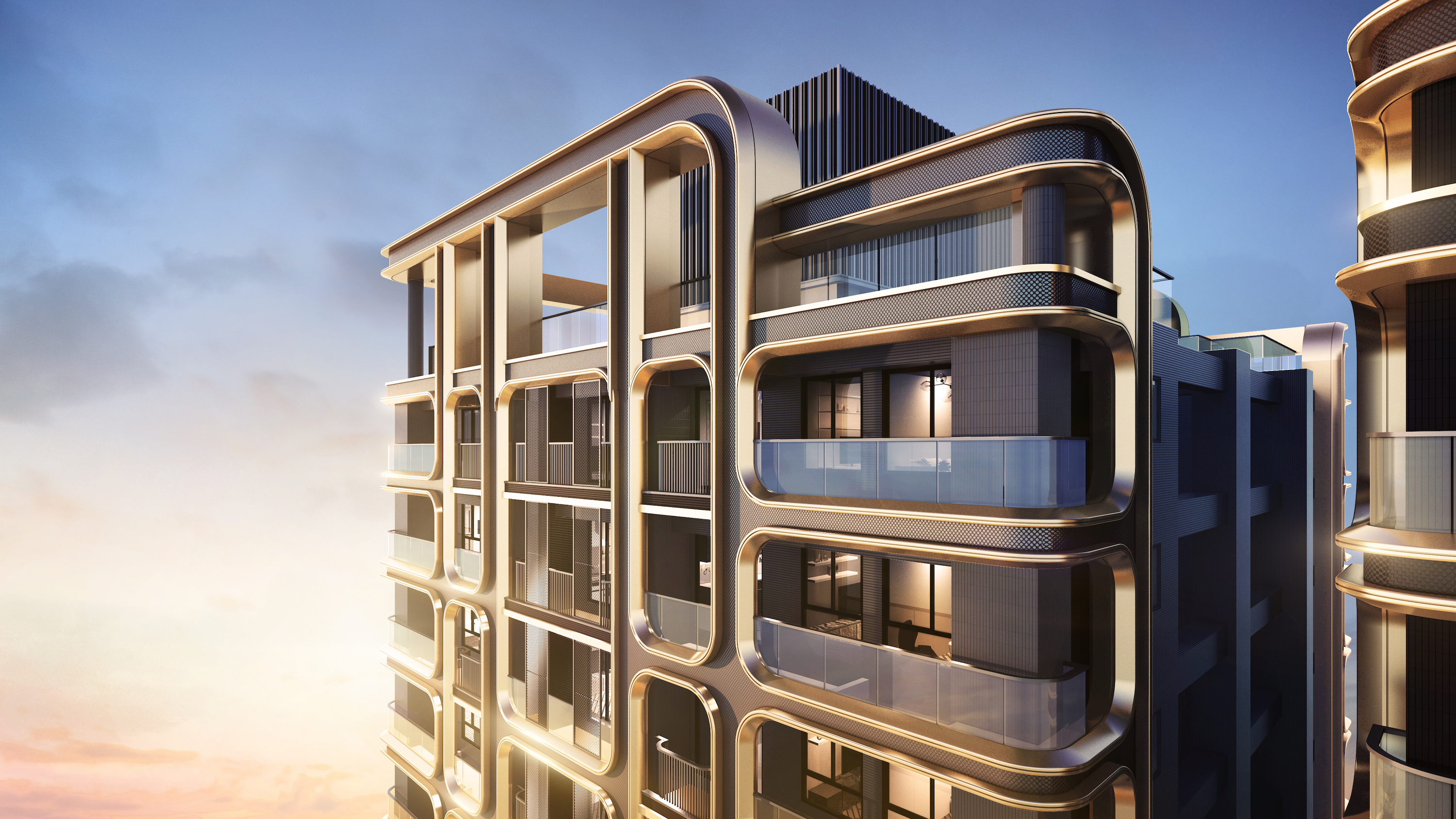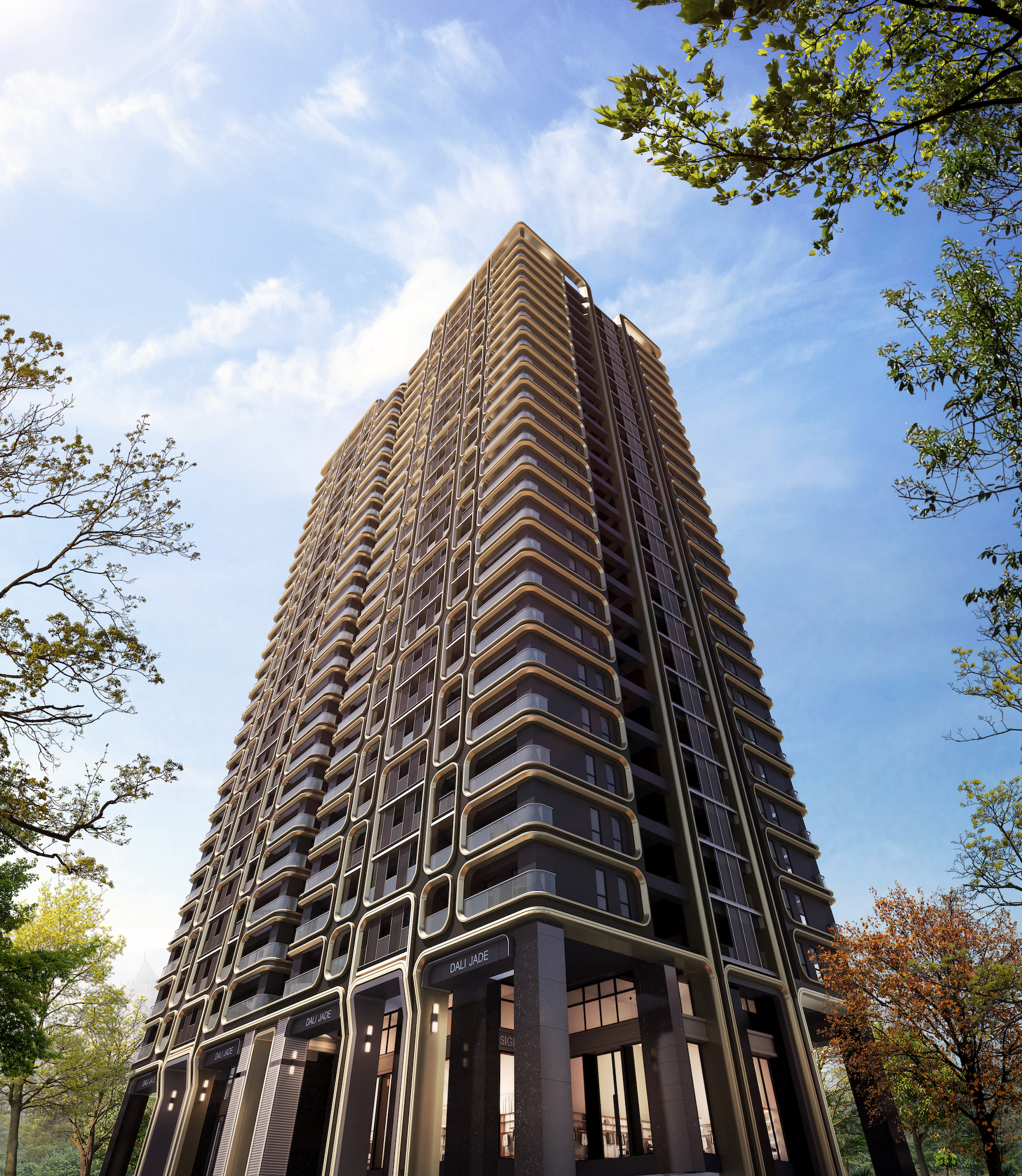 Considering the building overall form with balanced proportions, we first divide the building into two massing and introduce the shared linear base for the podium. The façade has employed the 3:2:1 rhythm for the overall main frames to give the sense of classical calms, meanwhile we introduce the horizontally layers from the slabs’ edges, representing bamboo nodes. This is to craft the repetitive yet vibrate details. The texture and material application are the key to success for the sense of delicacy. The metal panels resemble the cold, smooth skin of bamboo, the champagne gold metal frames paired with metallic espresso brushed mosaics is to resemble delicate plant cells, creating the image of hollow bamboo culms with nodes. In contrast to the frameless glass balcony railings, the expended metal mesh has incorporated into the design for the function of working balcony also the filter sunlight while provide the privacy which covers the exposed pipelines and incorporate the cleanliness of the exterior wall, serves as both aesthetic and functional. The lush treelined boulevard adjacent to the project site is recreated as vibrant organic curves on the facade, to experience the resilient bamboo leaves swaying in the wind. This approach has brought successfully a unique and irregular visual sense while kept musical rhythms in architectural design.