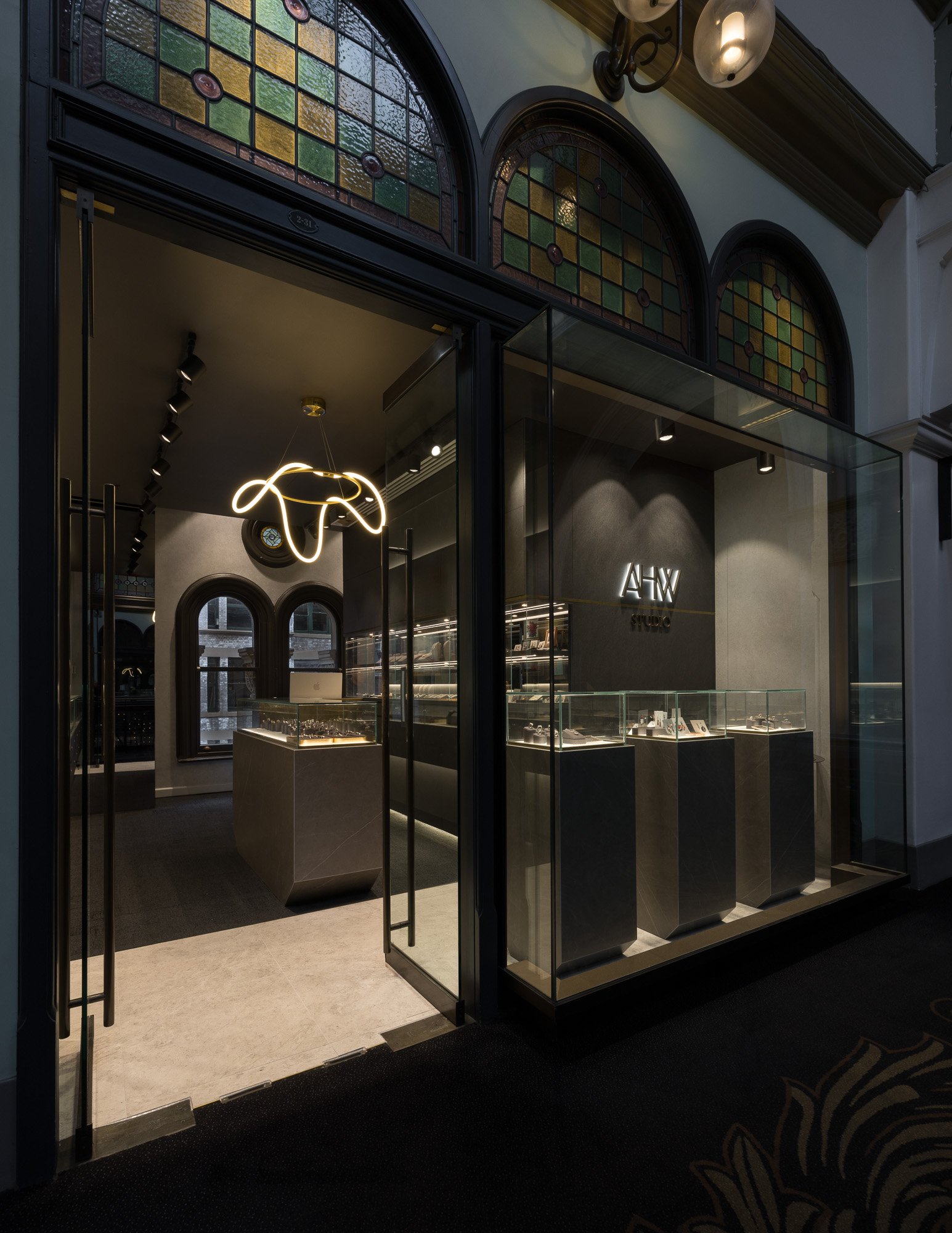 Located in QVB, the new store for AHW Studio needed to balance respect for a heritage setting with the ambition to deliver a bold, contemporary retail experience. The challenge was to honour the brand’s legacy, particularly its signature circular pieces crafted from recycled watches, while introducing a fresh design language that reflected its evolution.