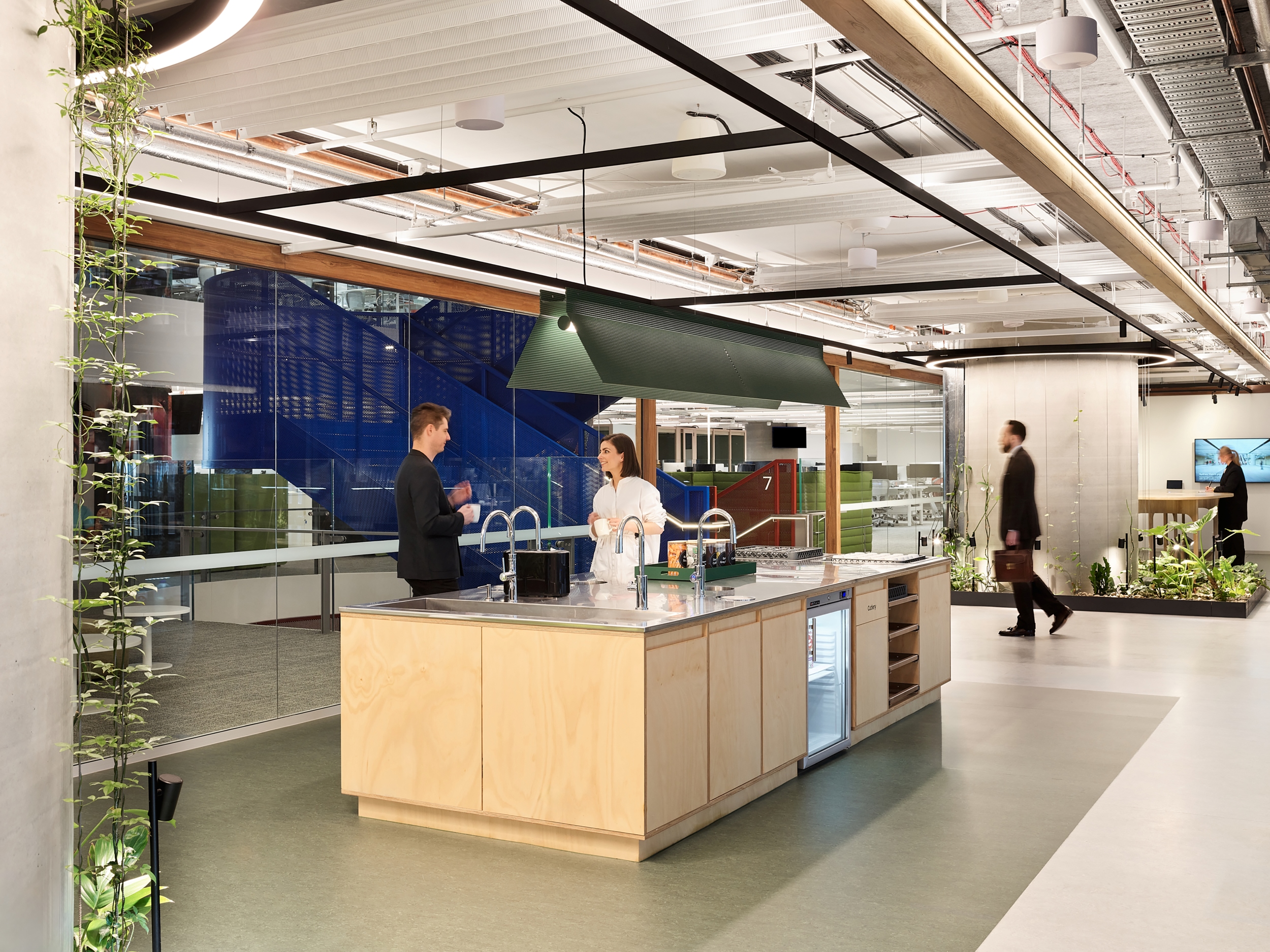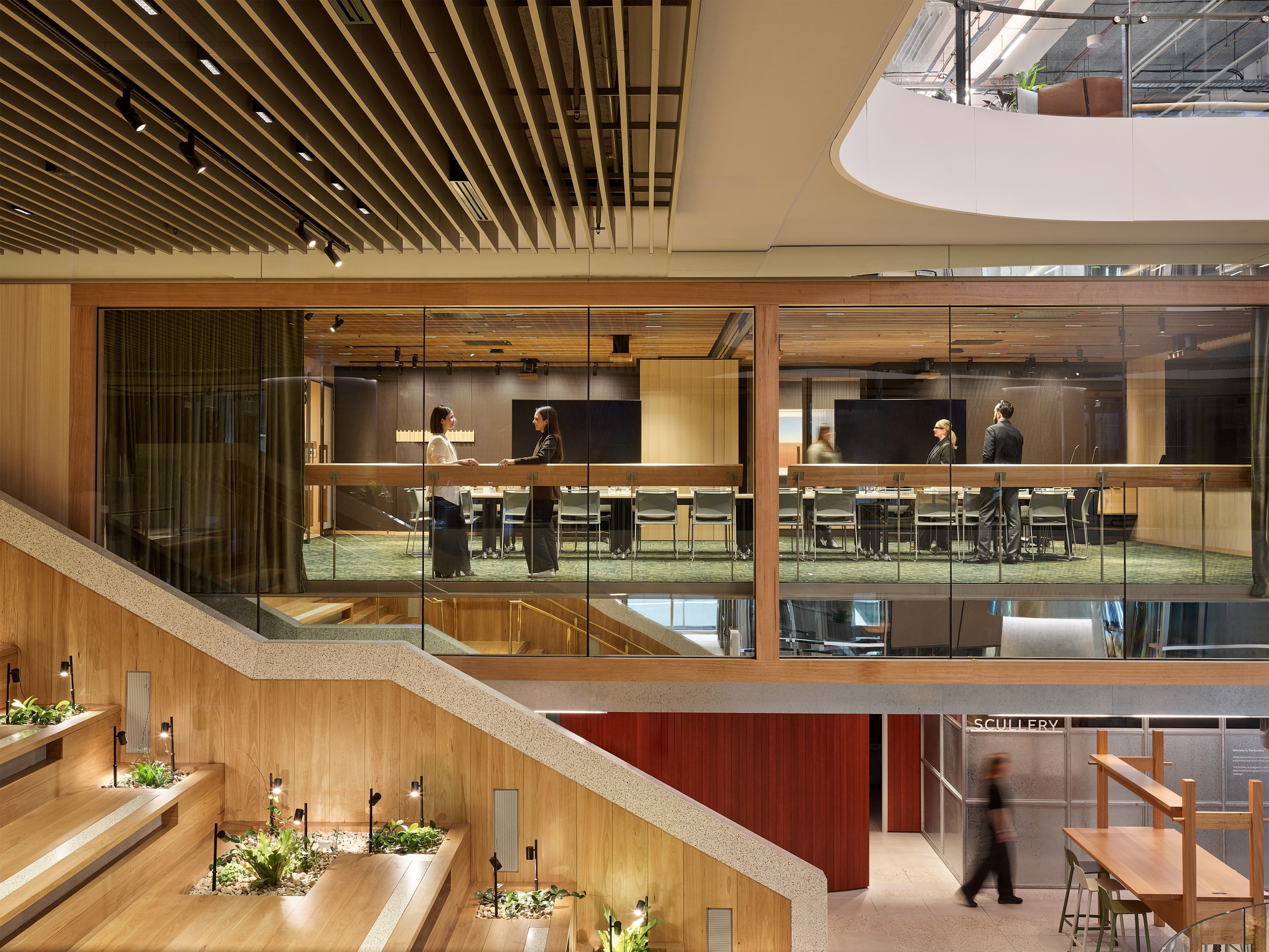 Sustainability was a core tenet of the project, which achieved a 6 Star Green Star Design rating and targets net-zero emissions in normal operations. Design decisions reflect a commitment to sustainability, focusing on energy and material efficiency with a limited materials palette. Sustainable procurement principles were adopted for furniture, including significant reuse from previous sites. The design approach also sought to minimise use of internal fit out materials, such as the absence of internal ceilings within the workplace. The use of locally sourced, recycled materials reduced embodied carbon within the fit out, while providing potential for disassembly and material reuse. Use of modular joinery for kitchen zones for all typical floors, as well as the use of demountable meeting pod systems, supports ongoing flexibility and sustainability. The building features a 100% electric design in normal operations, automated resource-efficient systems, and extensive biophilic elements, showcasing a comprehensive approach to environmental stewardship.