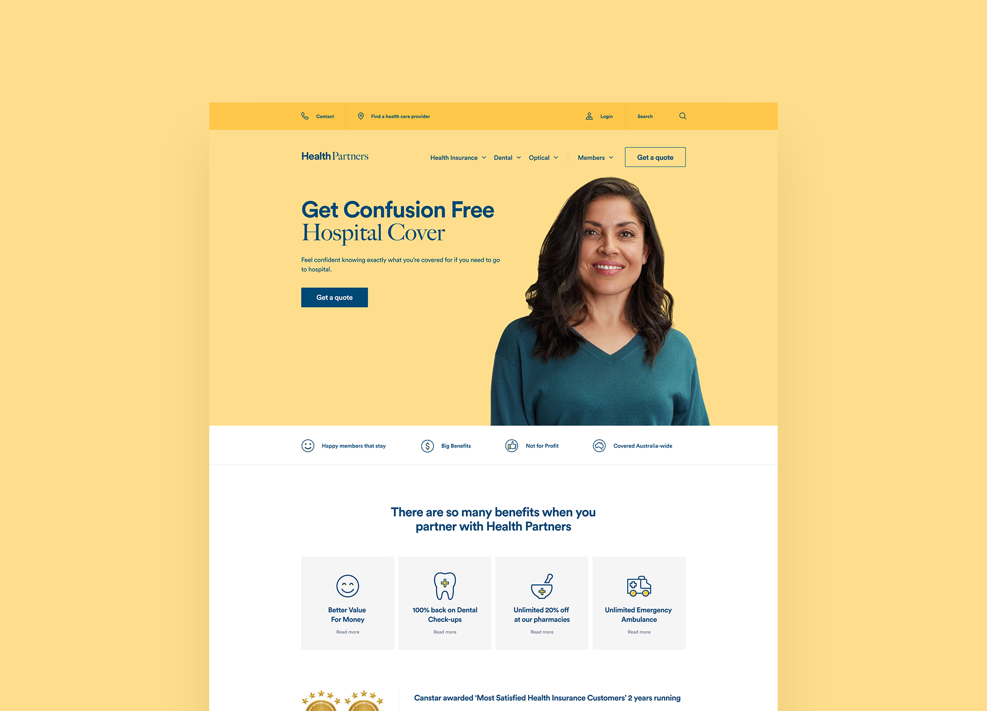As soon as we began working, we quickly established that Health Partners were facing a number of different challenges associated with their current marketing website. So we sat down together to determine the main goals of the project. First on that list was to redevelop the current site to enable members better access to self-serve information, primarily in a task-oriented manner such as booking a dental or optical appointment online.