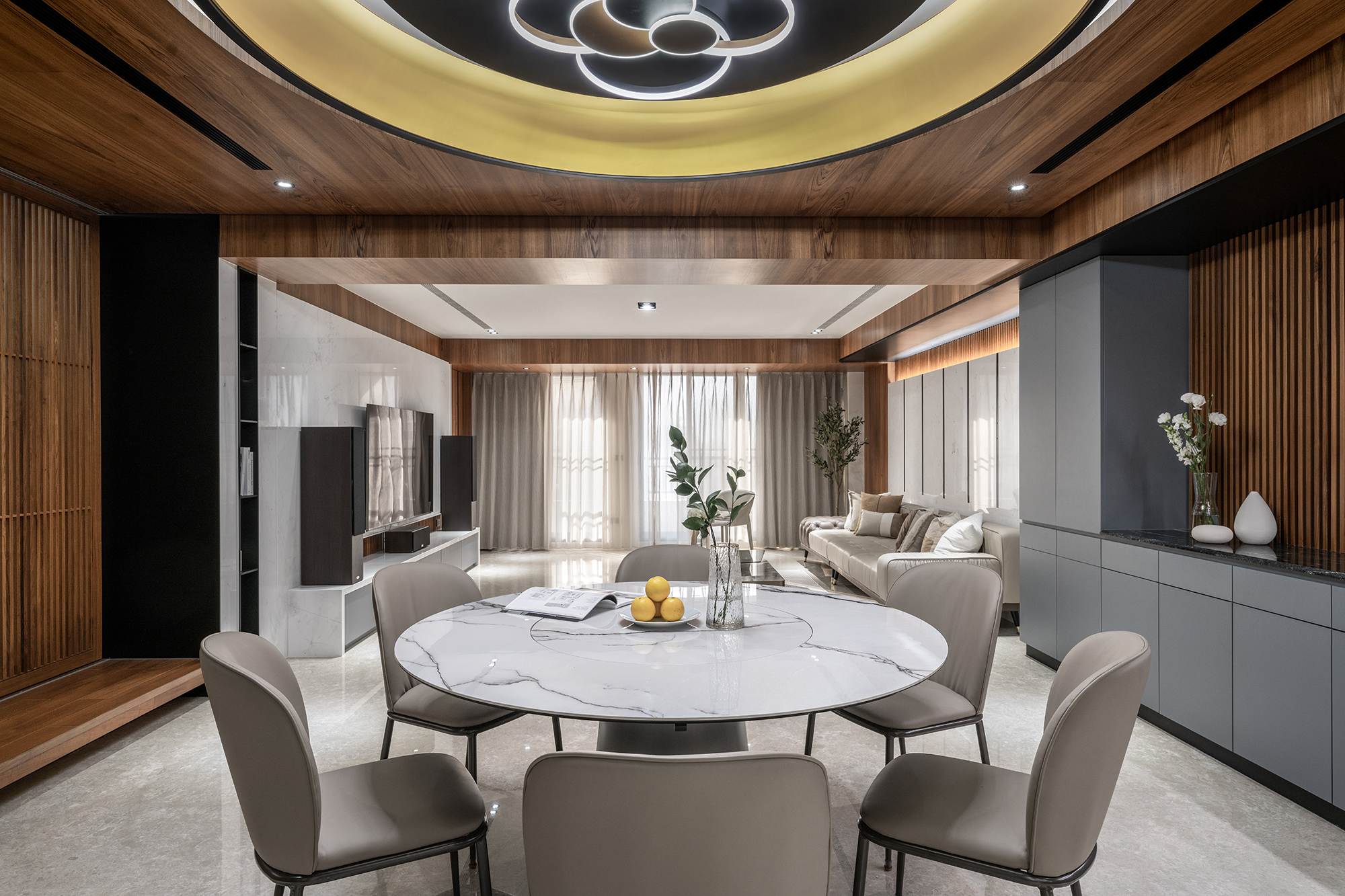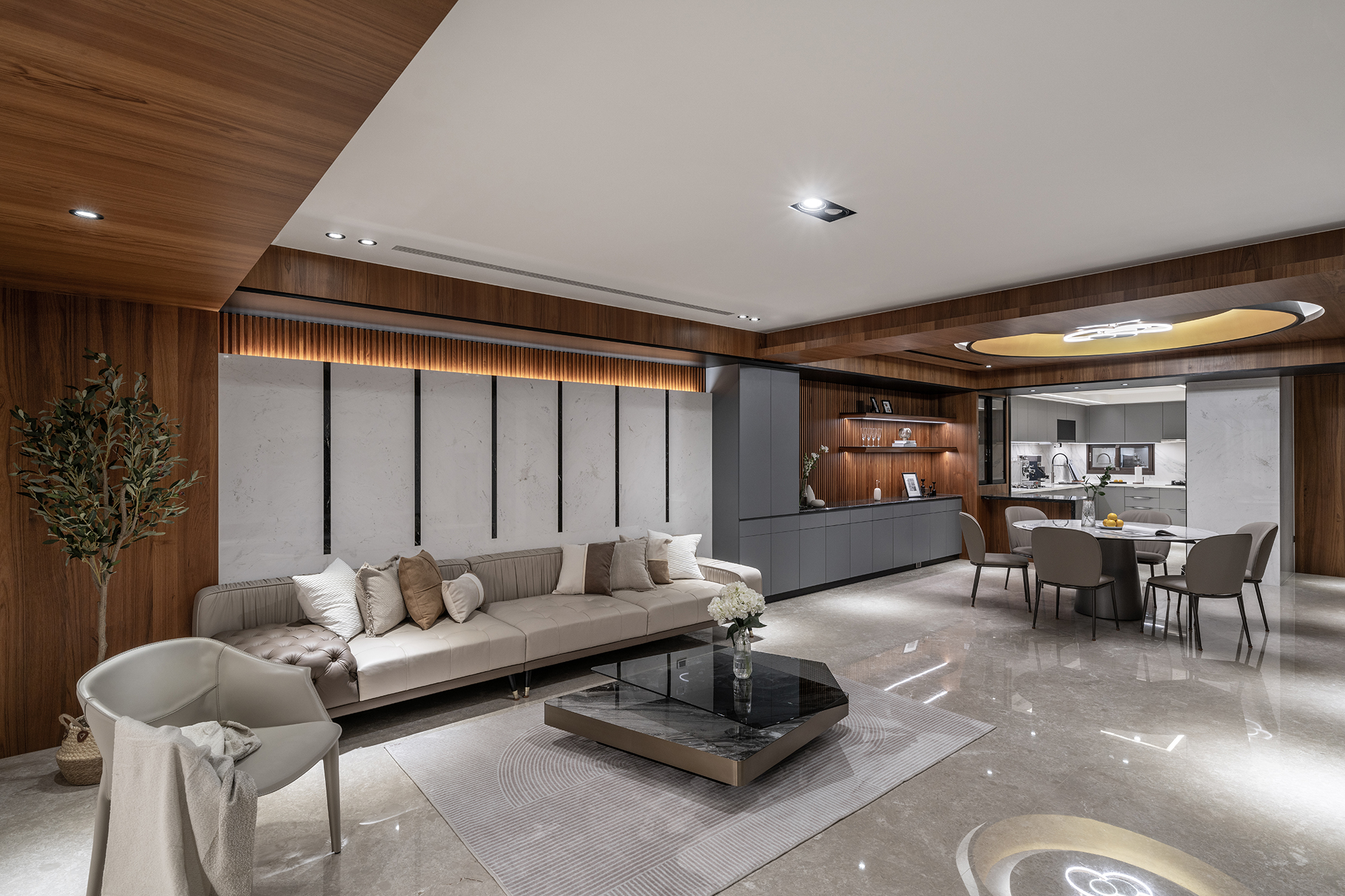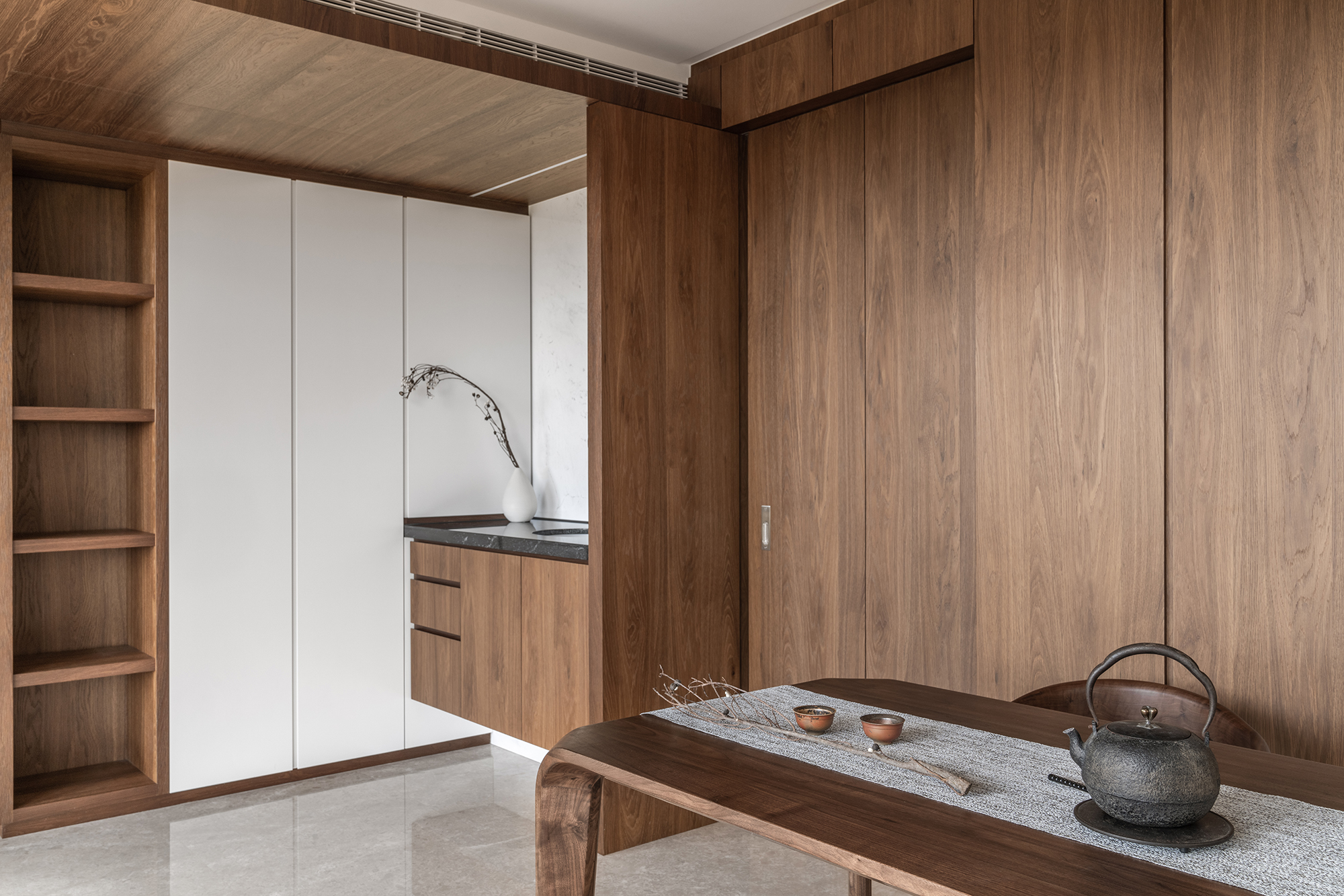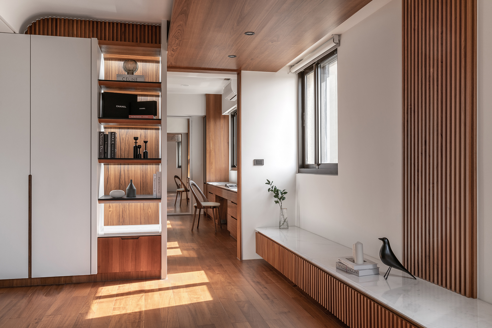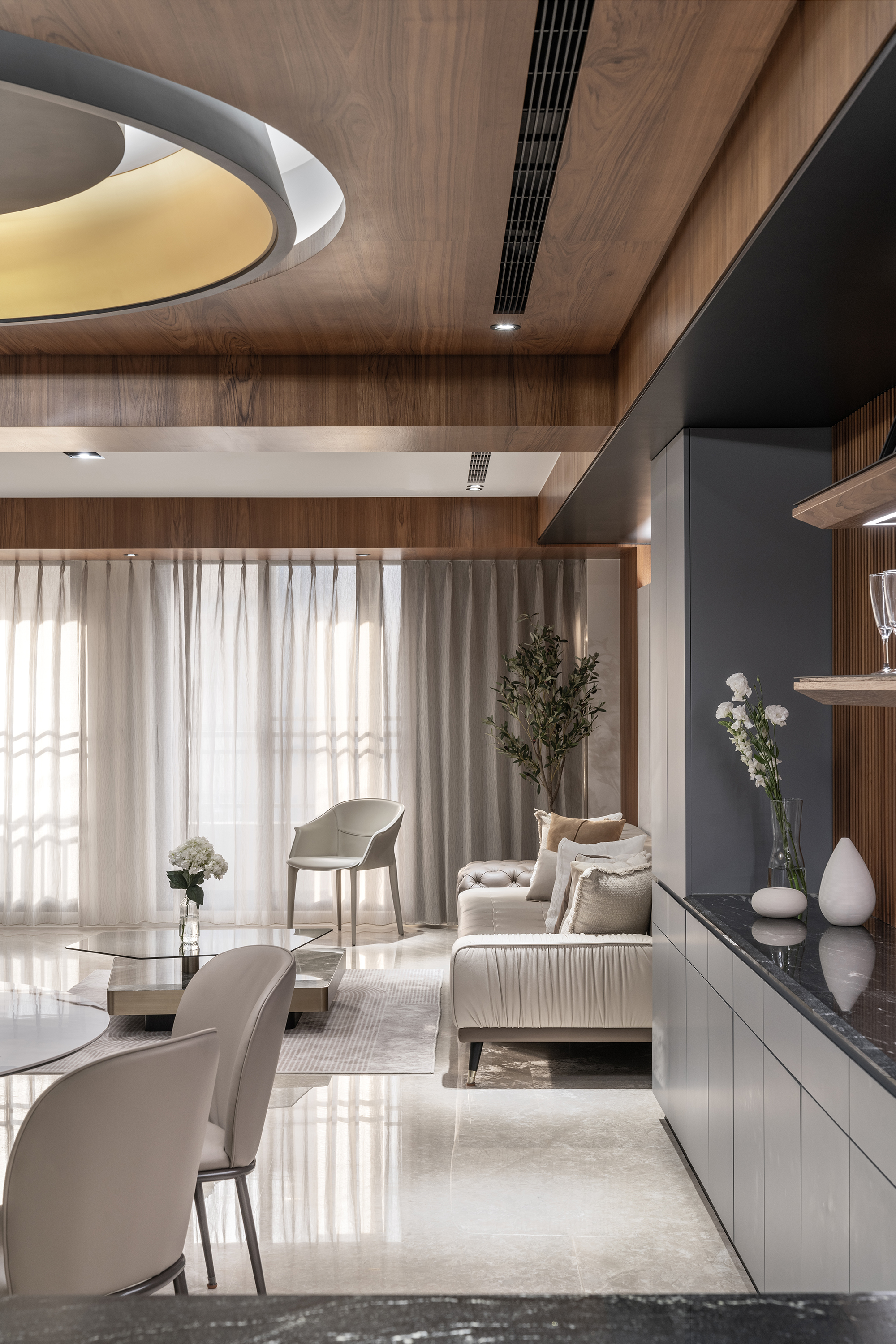 In the communal areas, integrated cabinetry merges storage and flow, maintaining an organised and open layout. The living and dining spaces are subtly defined by grilles and concealed doors, allowing light and views to flow through while adding spatial rhythm and layered transparency. These design motifs extend across the ceiling and vertical surfaces, where lighting and material textures are orchestrated to create a tranquil yet dynamically expressive atmosphere. The colour palette is centred on warm wood tones, complemented by soft greys and whites, evoking a refined domestic setting that embodies both aesthetic taste and functional clarity.