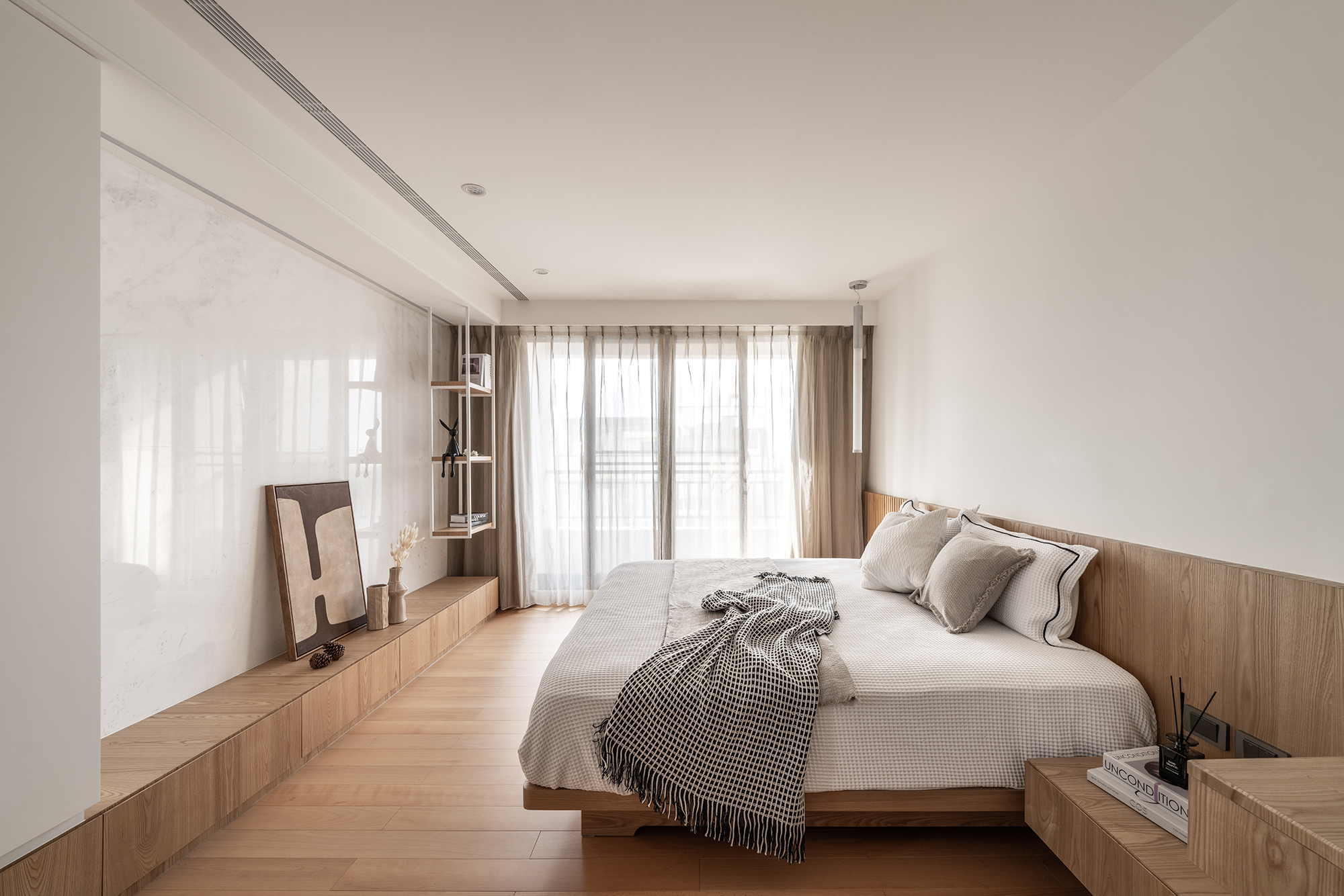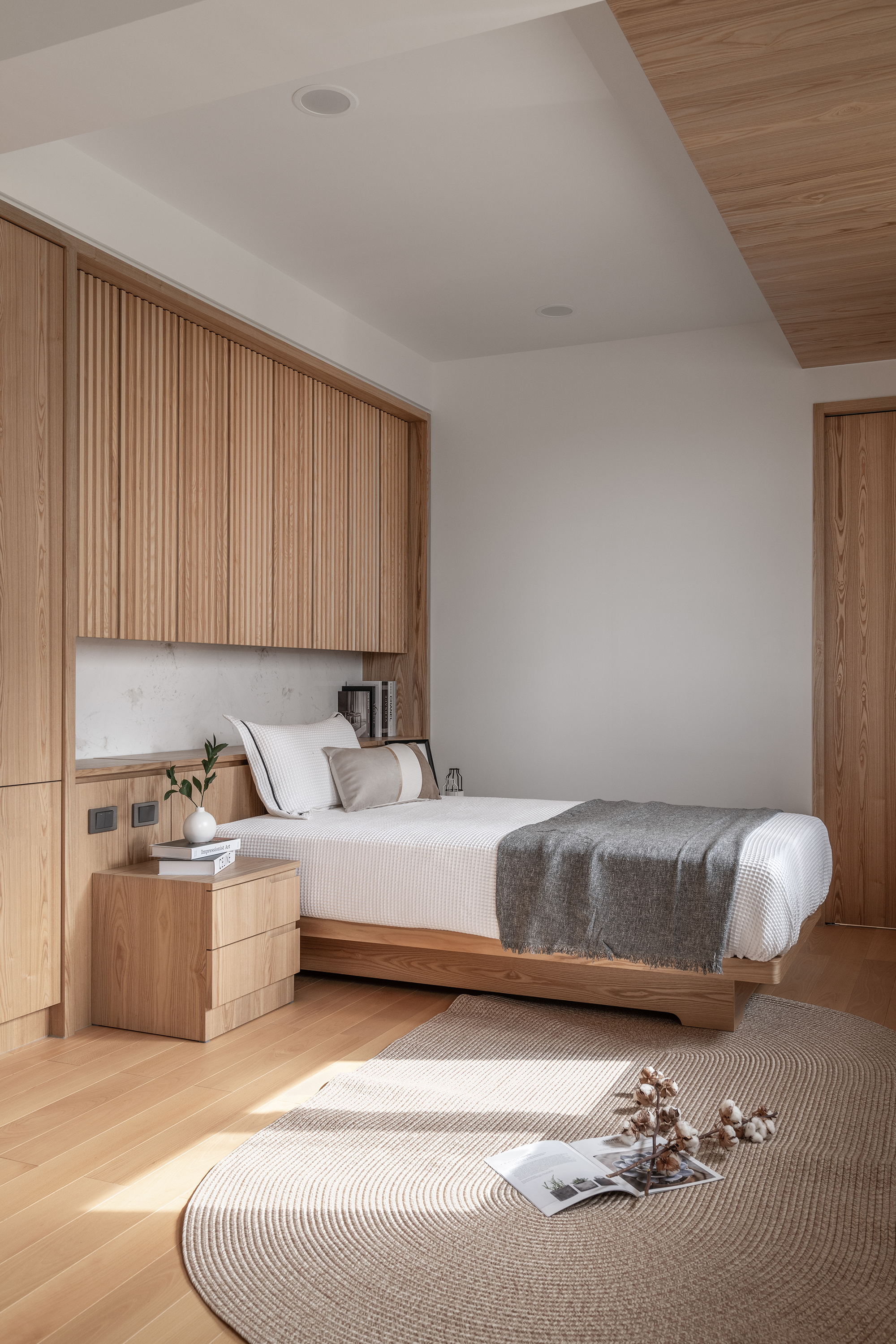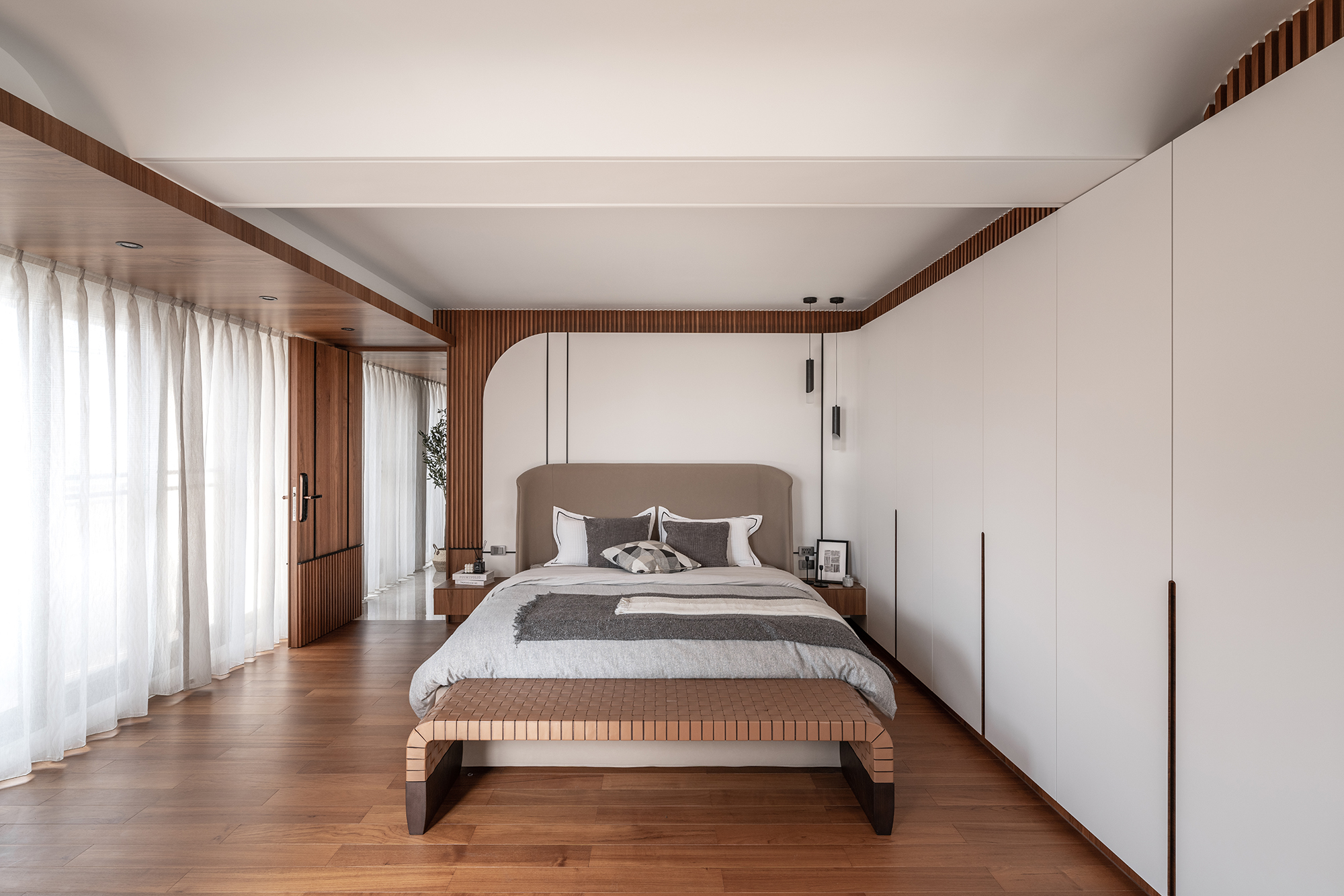 In the private quarters, the design returns to the essence of dwelling. The primary bedroom is equipped with acoustic insulation, ensuring peace and privacy for restful sleep. The parental suite reflects thoughtful caregiving considerations, with a pre-reserved bed space and a barrier-free bathroom, embodying a human-centered design approach.