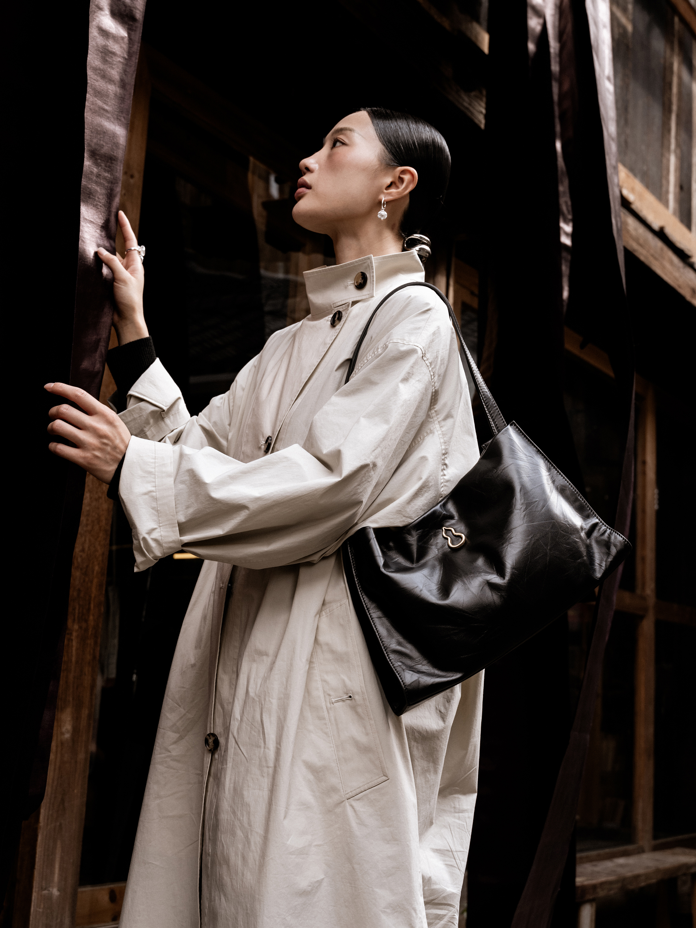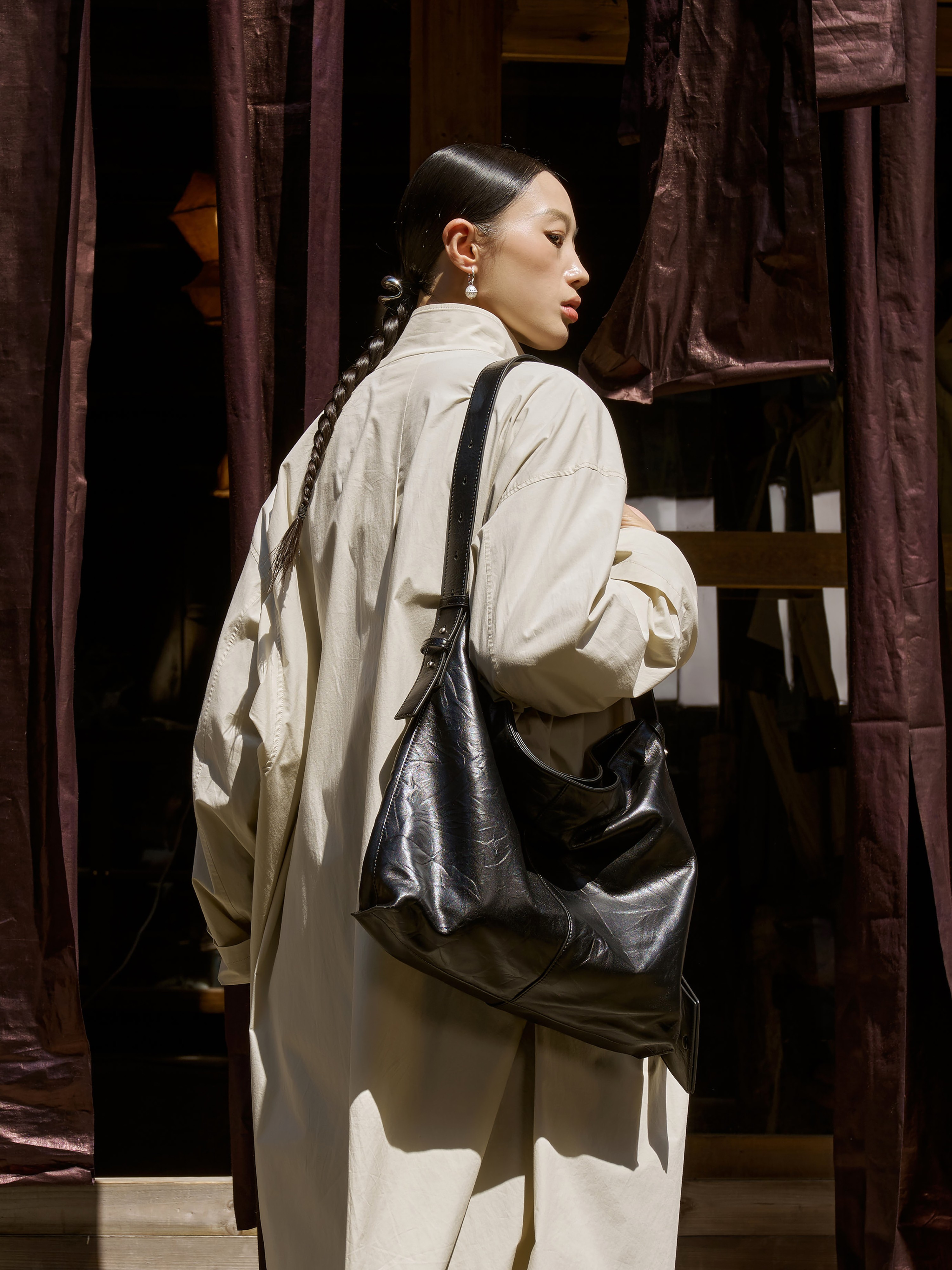 The fundamental differences between Dong Cloth and leather made it almost impossible to apply the craft directly. So the challenge was to replicate the cloth’s natural grain. Through in-depth study, the R&D team translated the essence of “ten dyeings, ten bleachings, and ten hammerings” into hand-crumpling techniques, enabling leather to present a grain similar to that of Dong Cloth. Another challenge was balancing lightness and softness with firm silhouette: the bag is made from premium full-grain Irish calf grain leather, using asymmetrical curves to create a unique draped elegance. It leverages leather’s inherent resilience and structural integrity to maintain the shape.