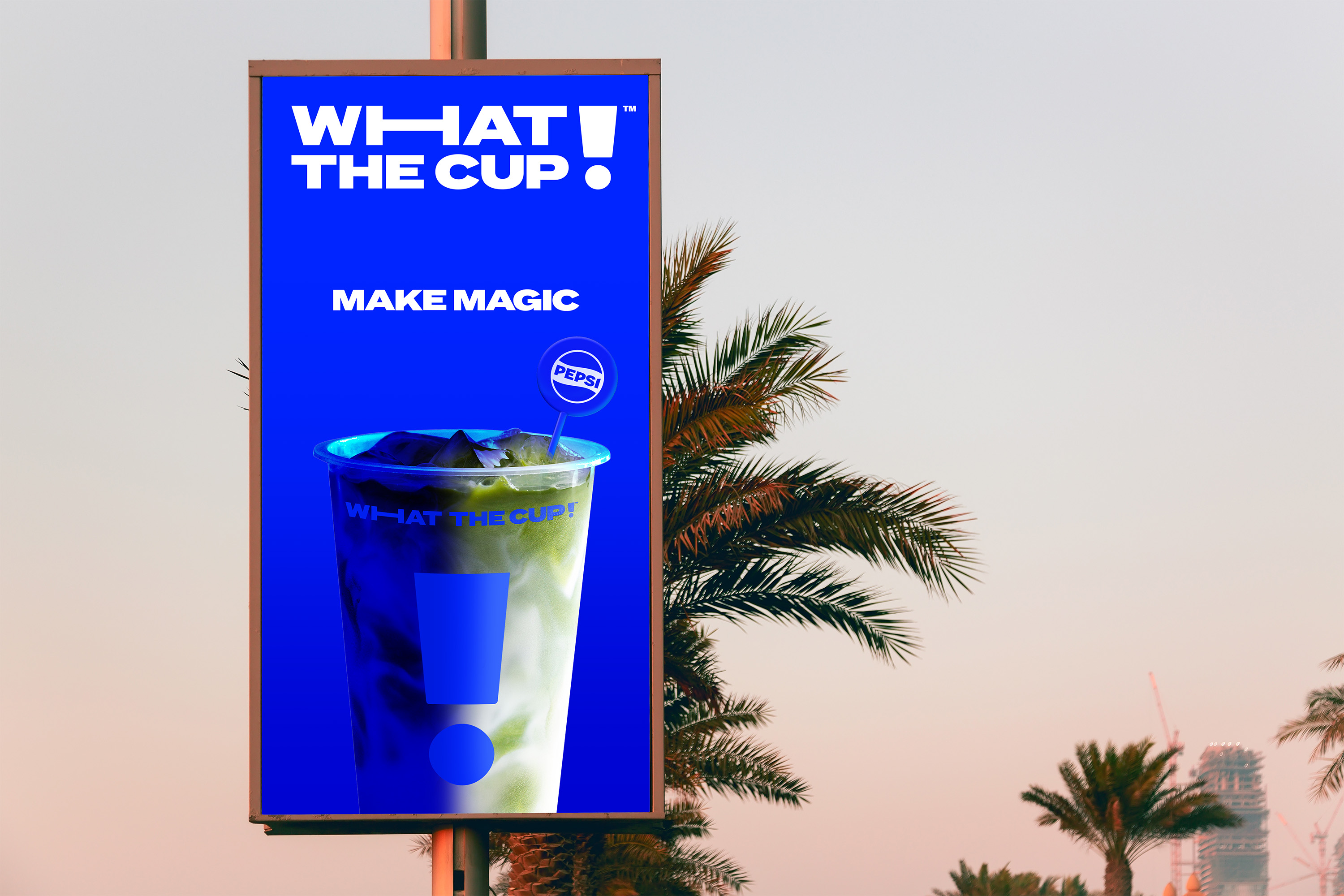 WHATTHECUP! is playful, radical, and built to shake up everything you think you know about vending. From the exclamation mark that doubles as a cup to the Pepsi electric blue, every inch of WHATTHECUP! is designed to turn heads. The clean, high-contrast two-color system makes the brand instantly recognizable, setting it apart from traditional vending. The power of motion design takes the brand experience to the next level. We developed fluid animations that morph between drinks, showcasing the nearly endless variety. From product design to visual identity, WHATTHECUP! is simple, bold, and impossible to ignore.