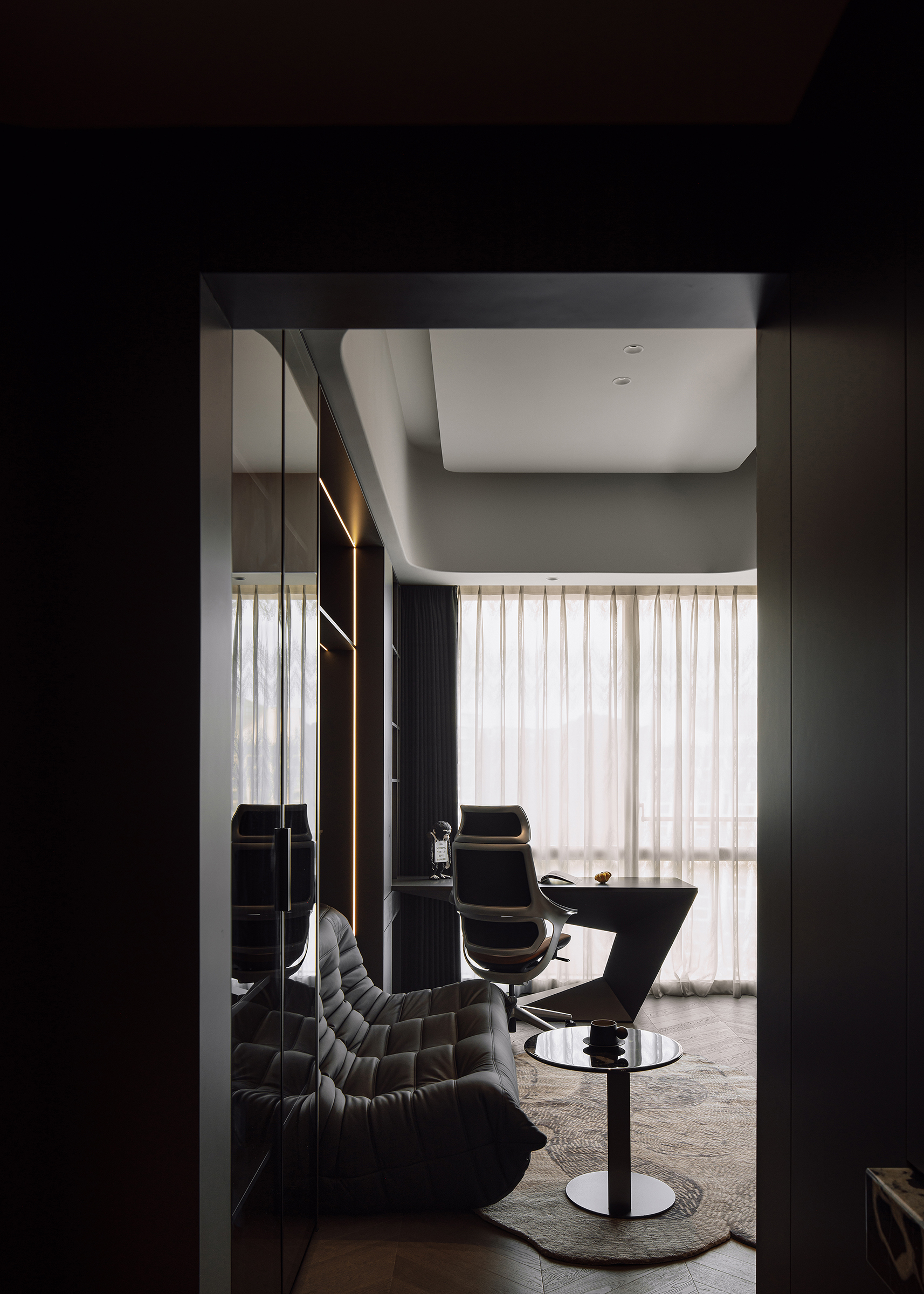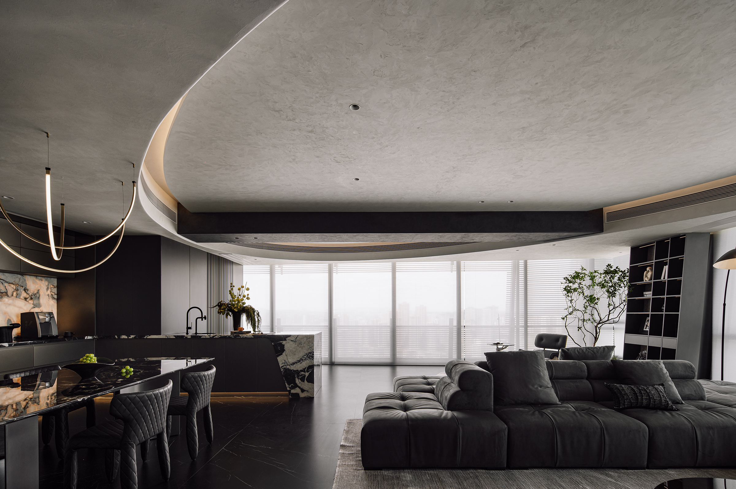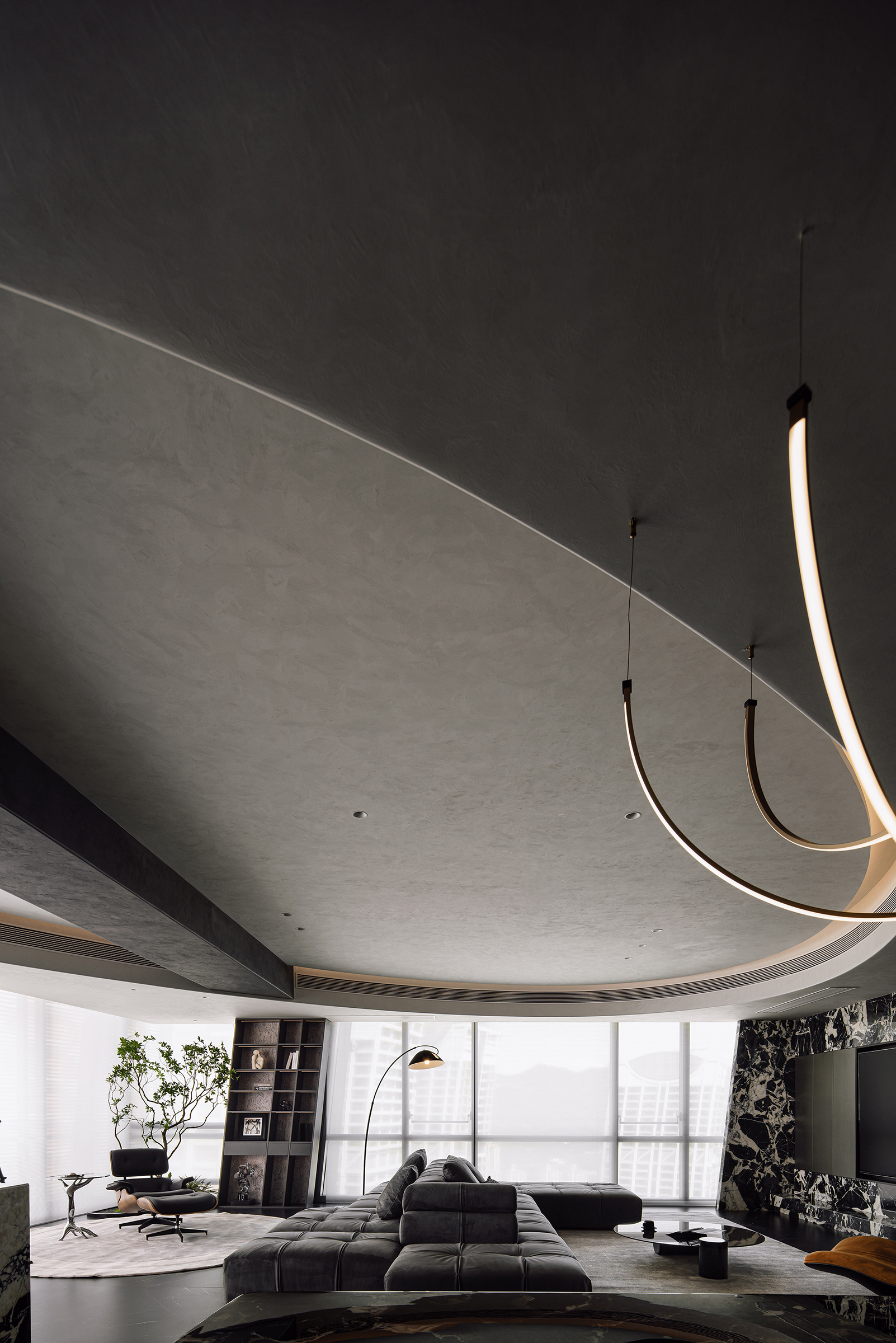 The project aims to reinterpret the concept of a refined masculine home, combining functional precision with emotional depth. The client, a disciplined entrepreneur with a love for sports and social gatherings, inspired a space that adapts to both dynamic activity and quiet retreat. The living area serves as the home’s social core, featuring an “island” sofa and a panoramic layout that merges indoor and outdoor views. The reading nook and custom-angled bookcase bring rhythm and spatial balance, while the master suite integrates leisure, wardrobe, and bathing zones for seamless living. Each private space—whether for the daughter or the elderly—translates care and personality through tone and texture. The overall design celebrates harmony between function, atmosphere, and individuality.