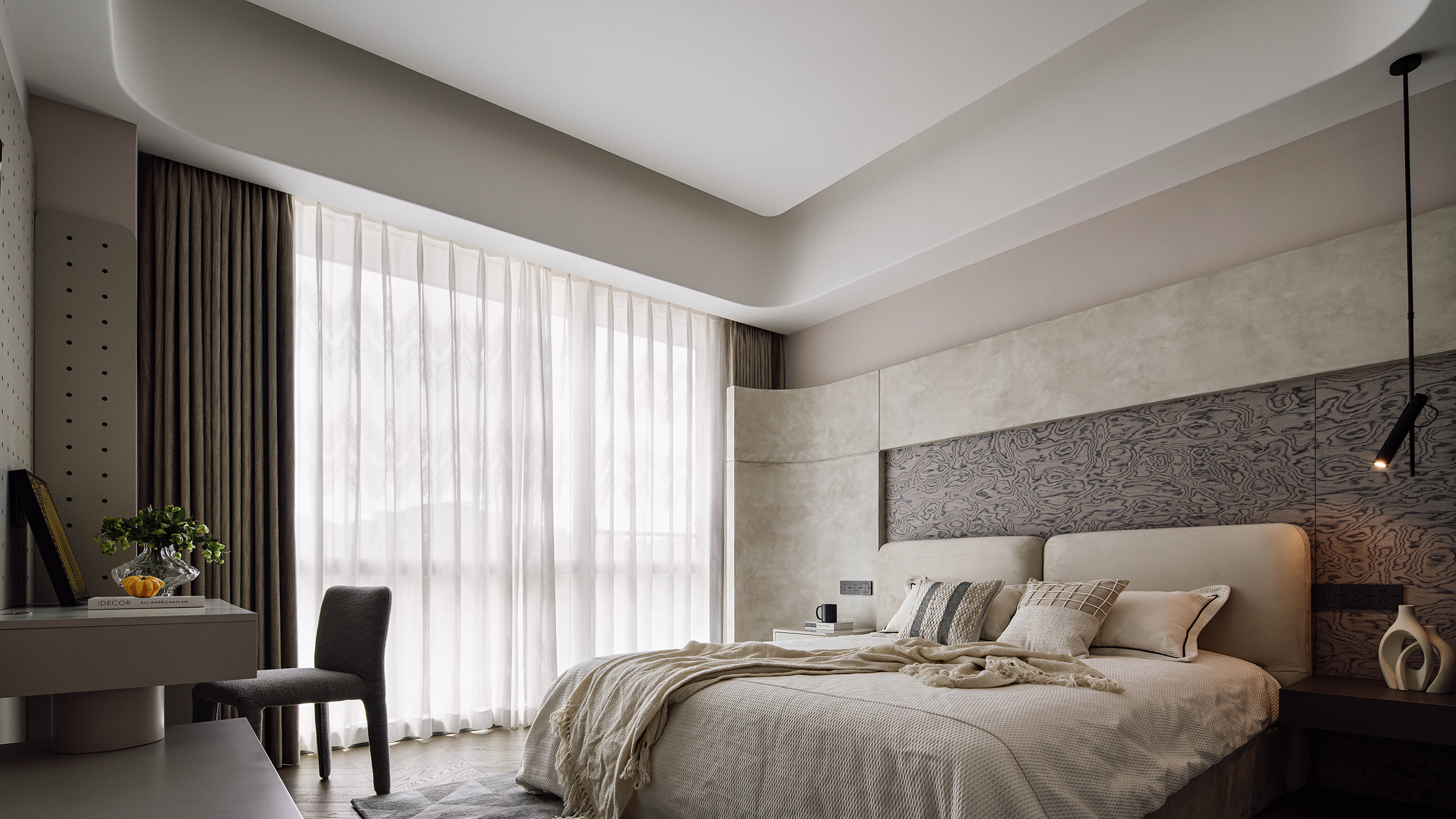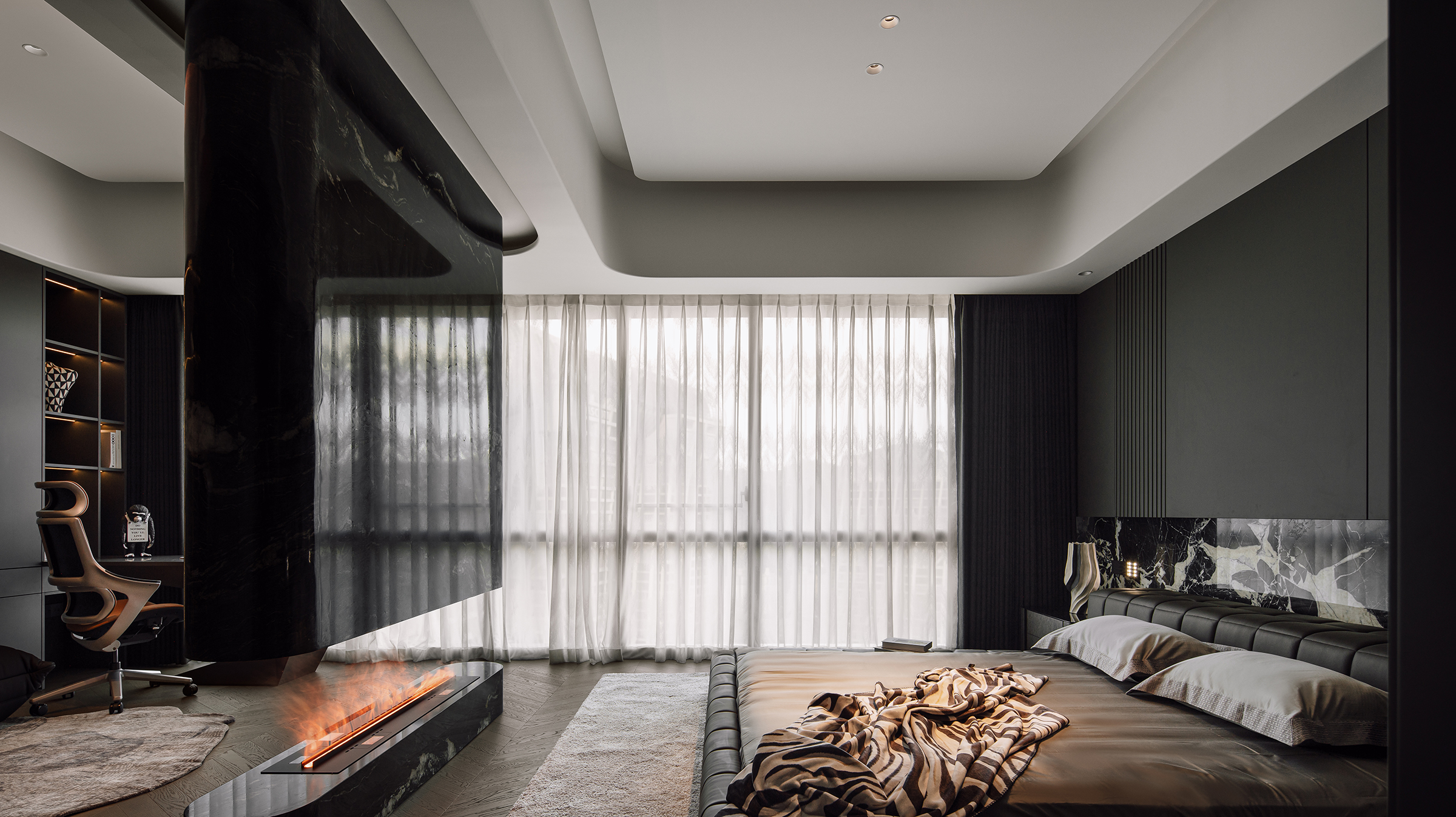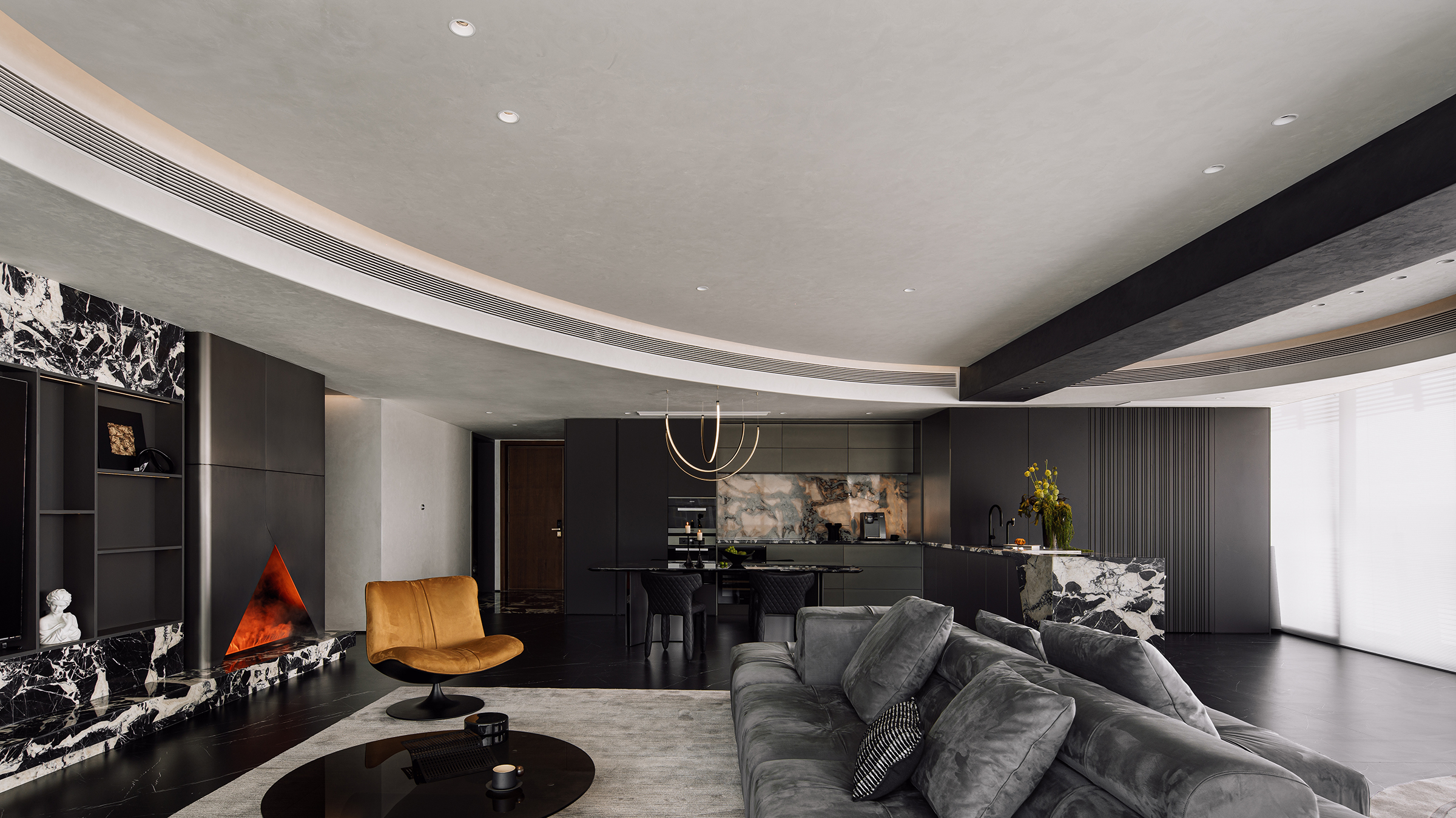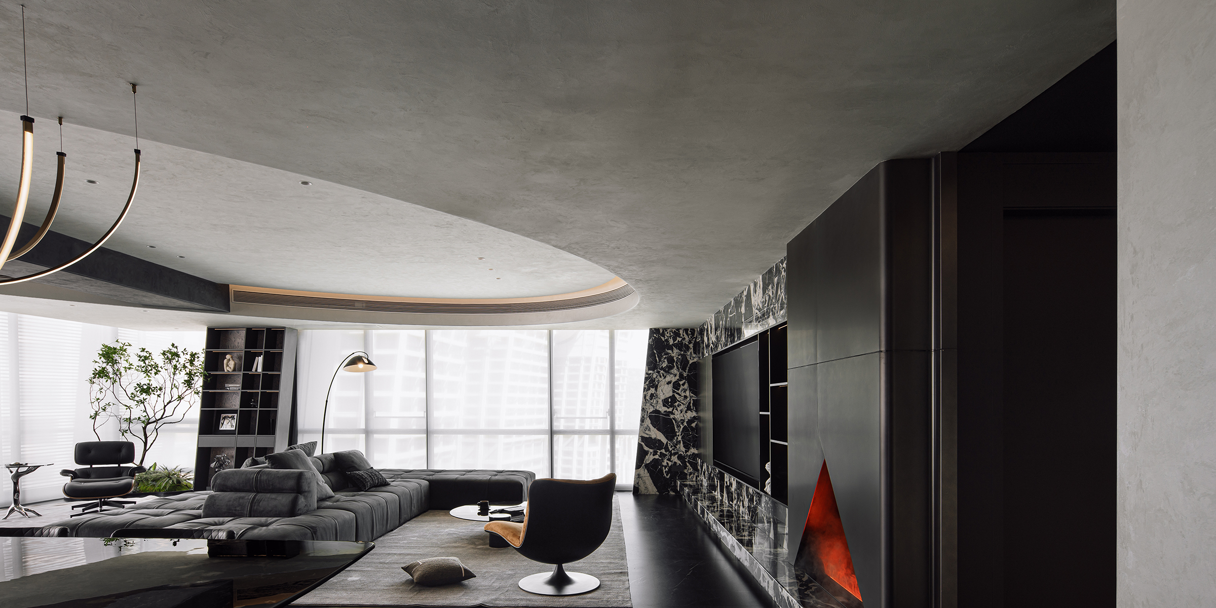 The project aims to reinterpret the concept of a refined masculine home, combining functional precision with emotional depth. The client, a disciplined entrepreneur with a love for sports and social gatherings, inspired a space that adapts to both dynamic activity and quiet retreat. The living area serves as the home’s social core, featuring an “island” sofa and a panoramic layout that merges indoor and outdoor views. The reading nook and custom-angled bookcase bring rhythm and spatial balance, while the master suite integrates leisure, wardrobe, and bathing zones for seamless living. Each private space—whether for the daughter or the elderly—translates care and personality through tone and texture. The overall design celebrates harmony between function, atmosphere, and individuality.