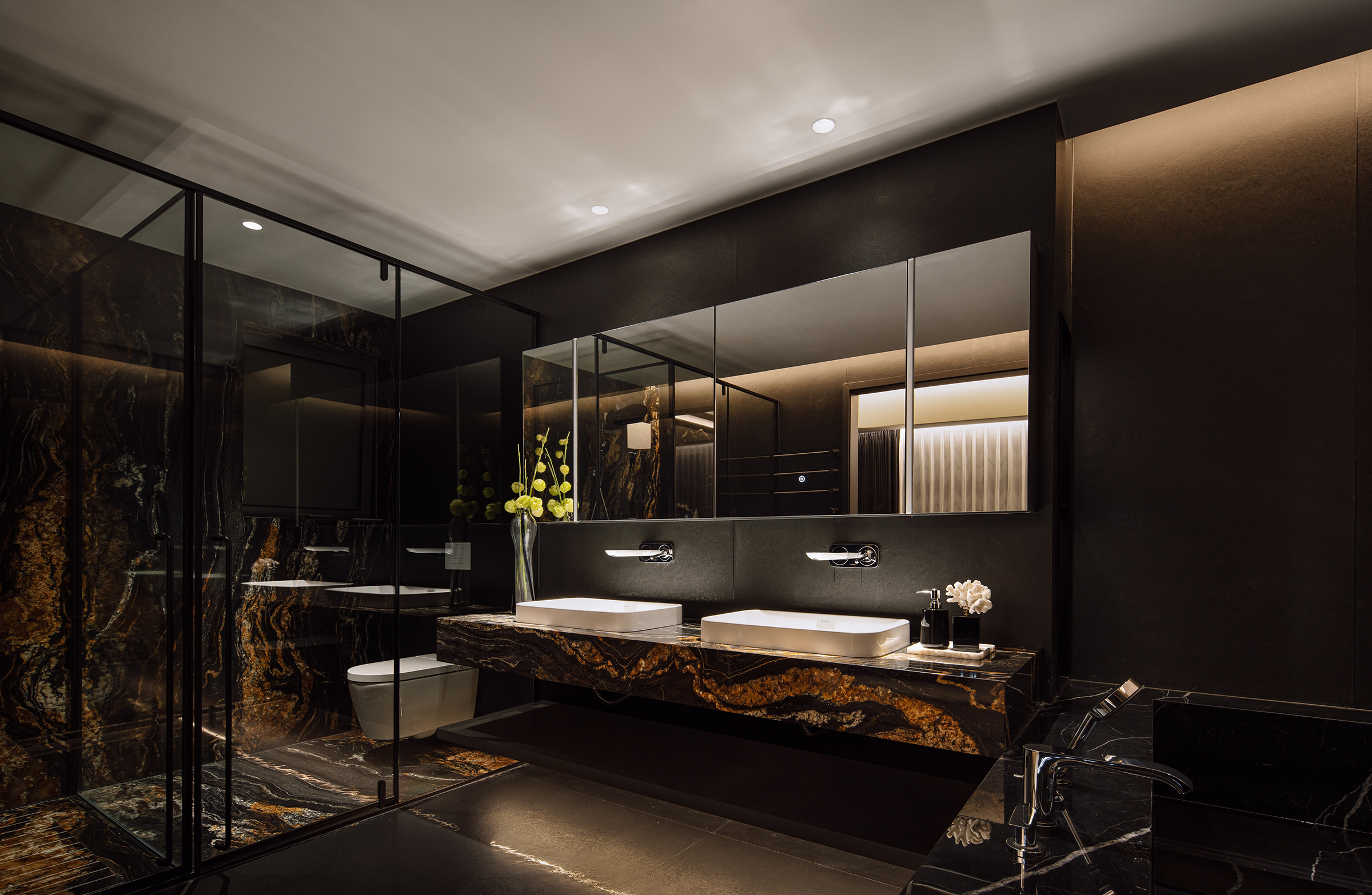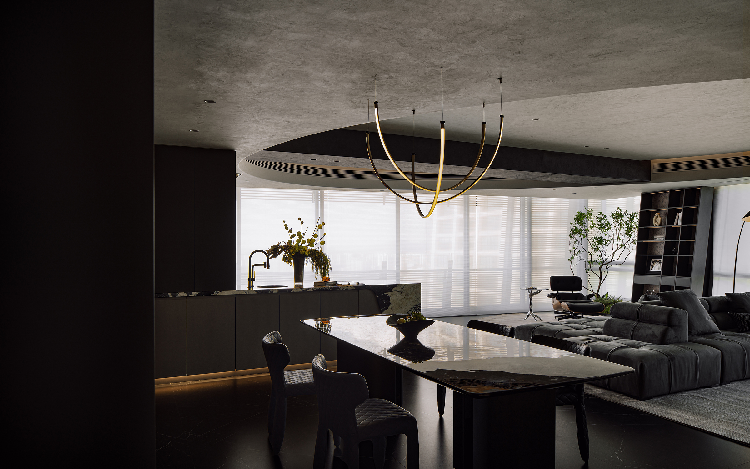 This 245-square-meter residence was designed for a successful businessman who leads a disciplined yet dynamic life. The project explores the balance between warmth and masculine restraint—creating a calm yet vibrant living environment. The design challenges the traditional LDK (Living–Dining–Kitchen) model by introducing a parallel and vertical spatial layout, achieving seamless interaction between spaces while preserving flexibility and individuality. Each area is crafted with meticulous attention to proportion, material, and light, reflecting the client’s understated sophistication and pursuit of quality living. The result is a modern urban home that embodies both strength and warmth, redefining contemporary residential comfort through spatial openness and emotional subtlety.