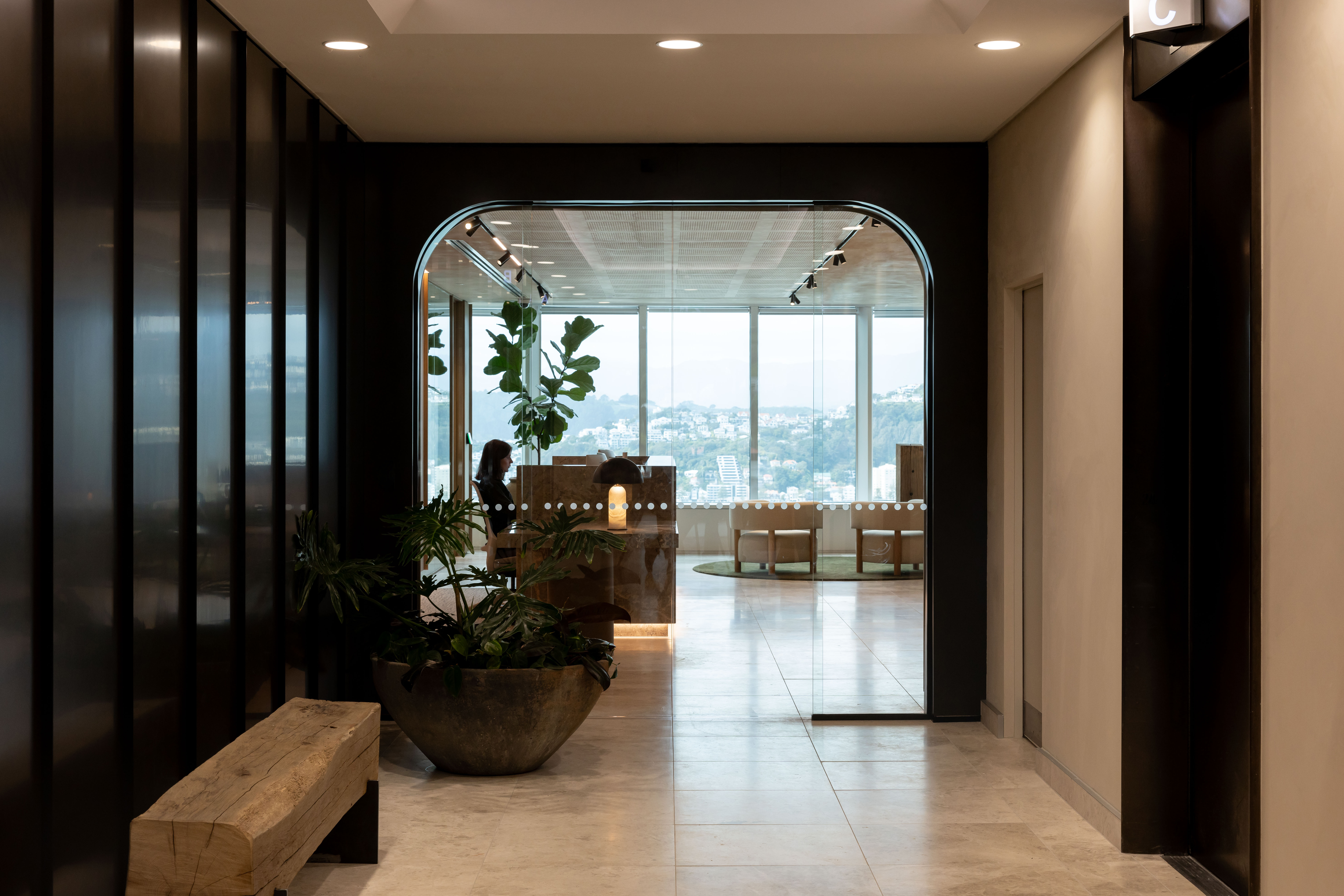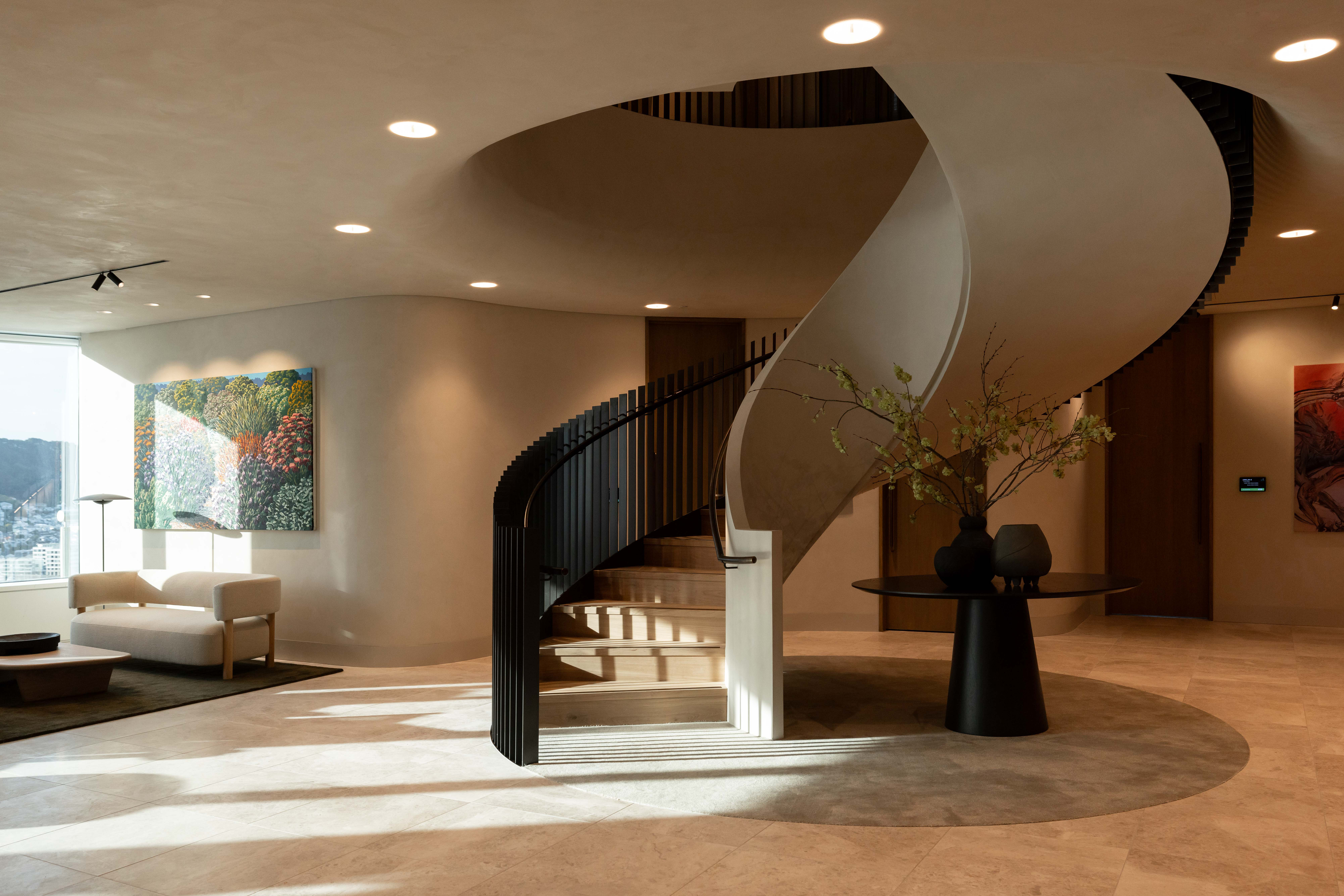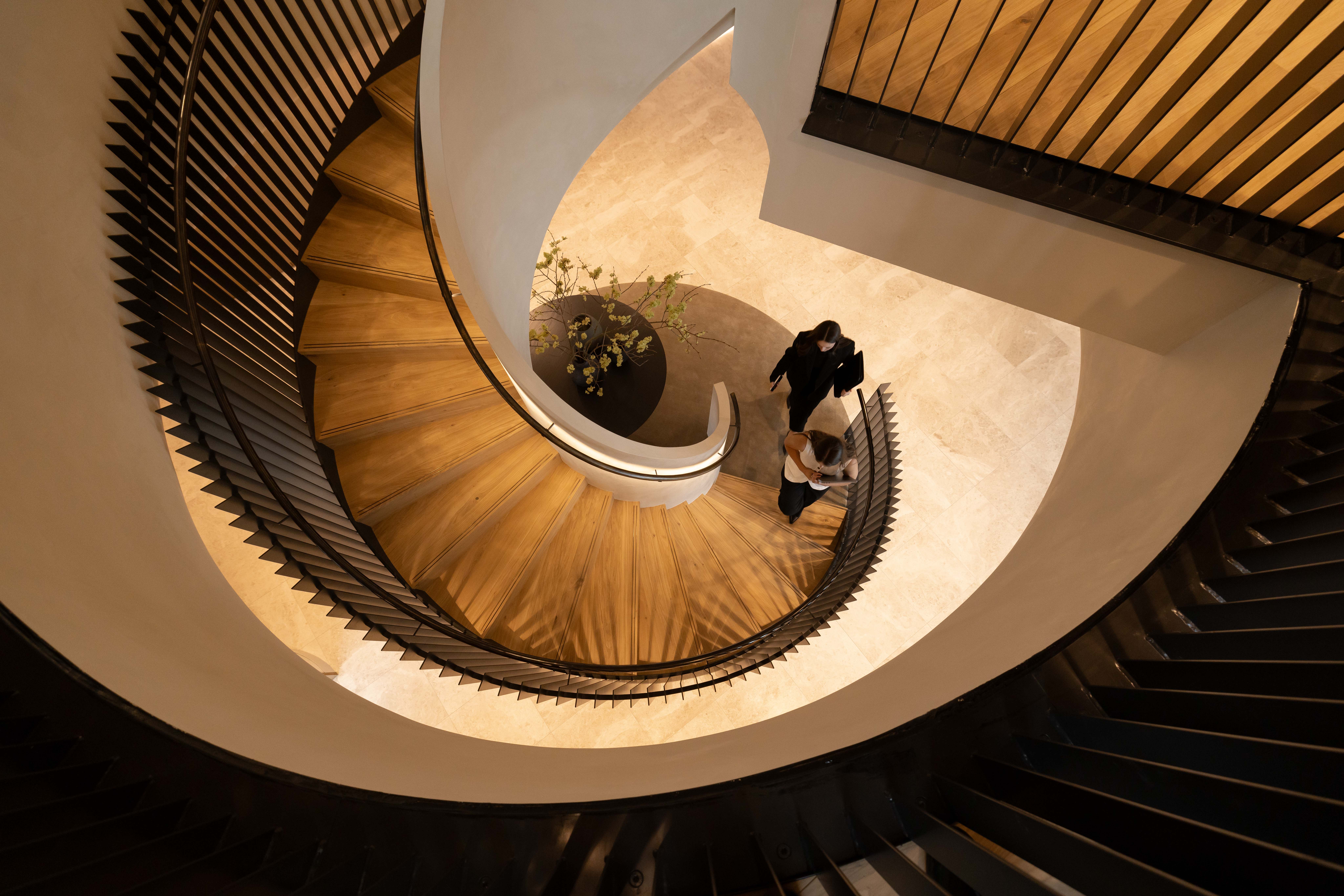 The interior design is a true showcase of quality and craftmanship. The bespoke helictical staircase, crafted from timber, polished plaster and rolled aged-brass is the central feature of the interior. It provides ease of circulation between floors, supporting the equality of access to spaces between partners, staff and clients.
