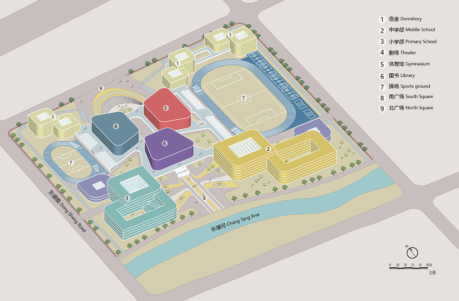 The "Leaf-Shaped Clusters" provide relatively independent spaces for the middle and primary school sections, as well as library and sports facilities that can be opened to the community, maximizing the use of resources.