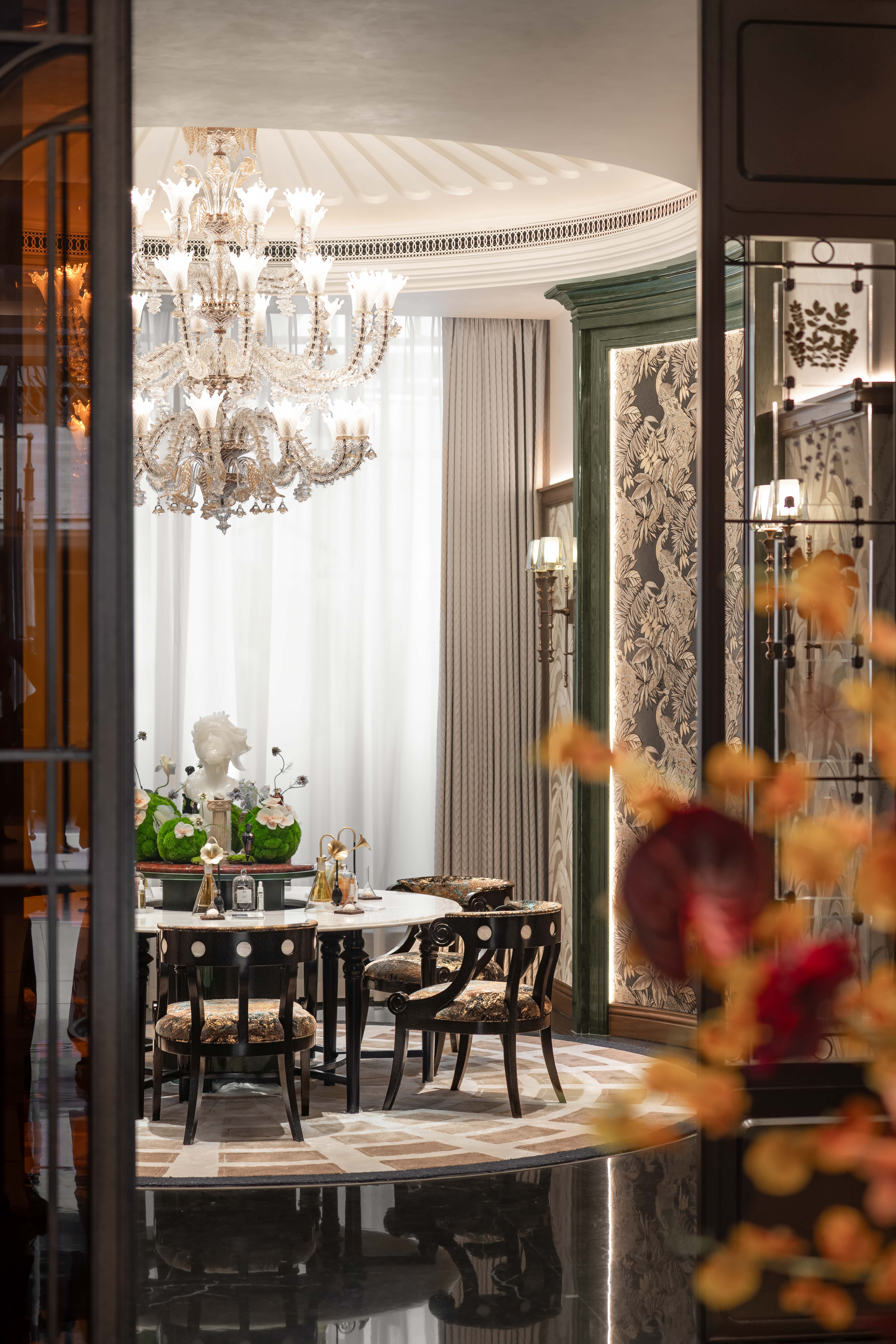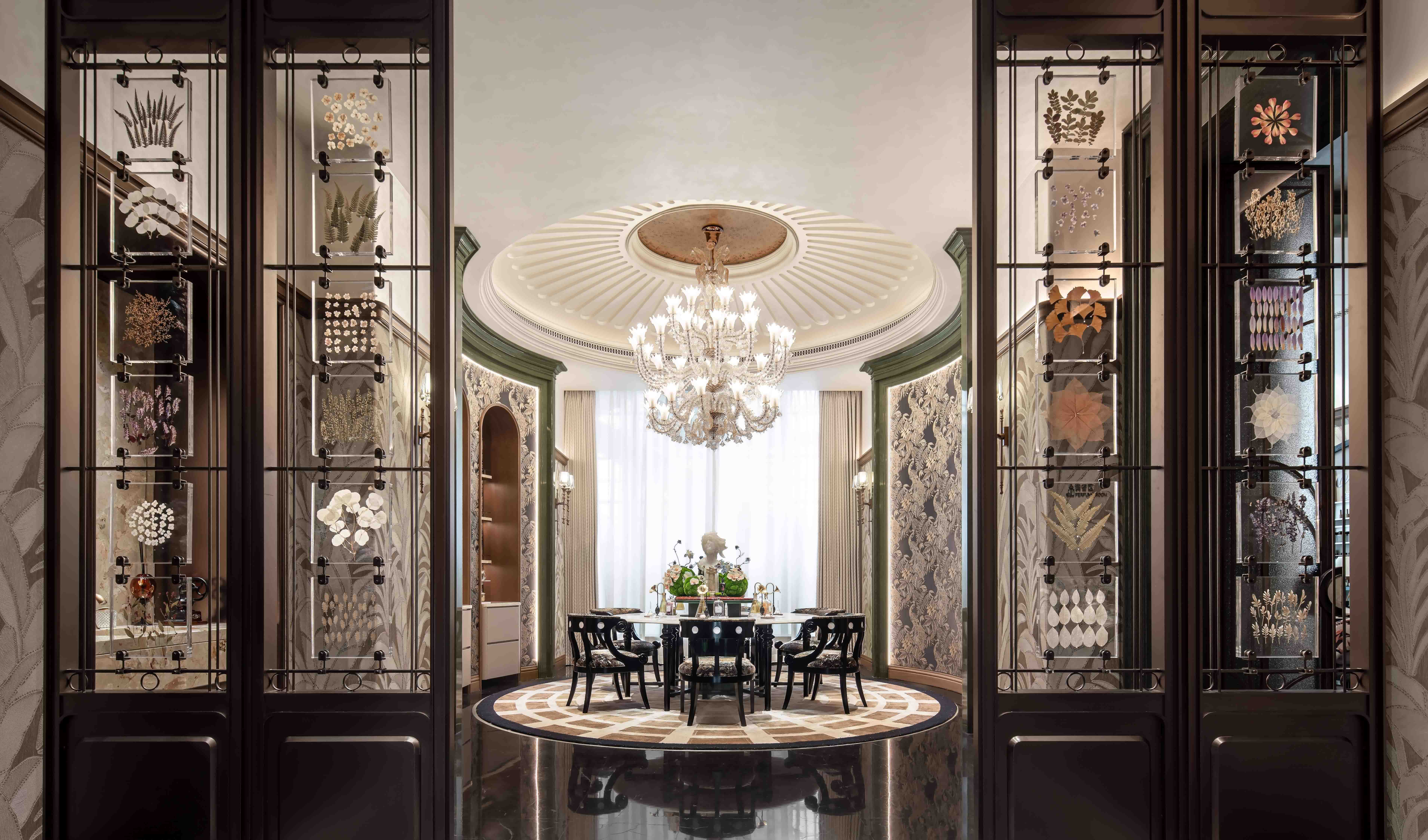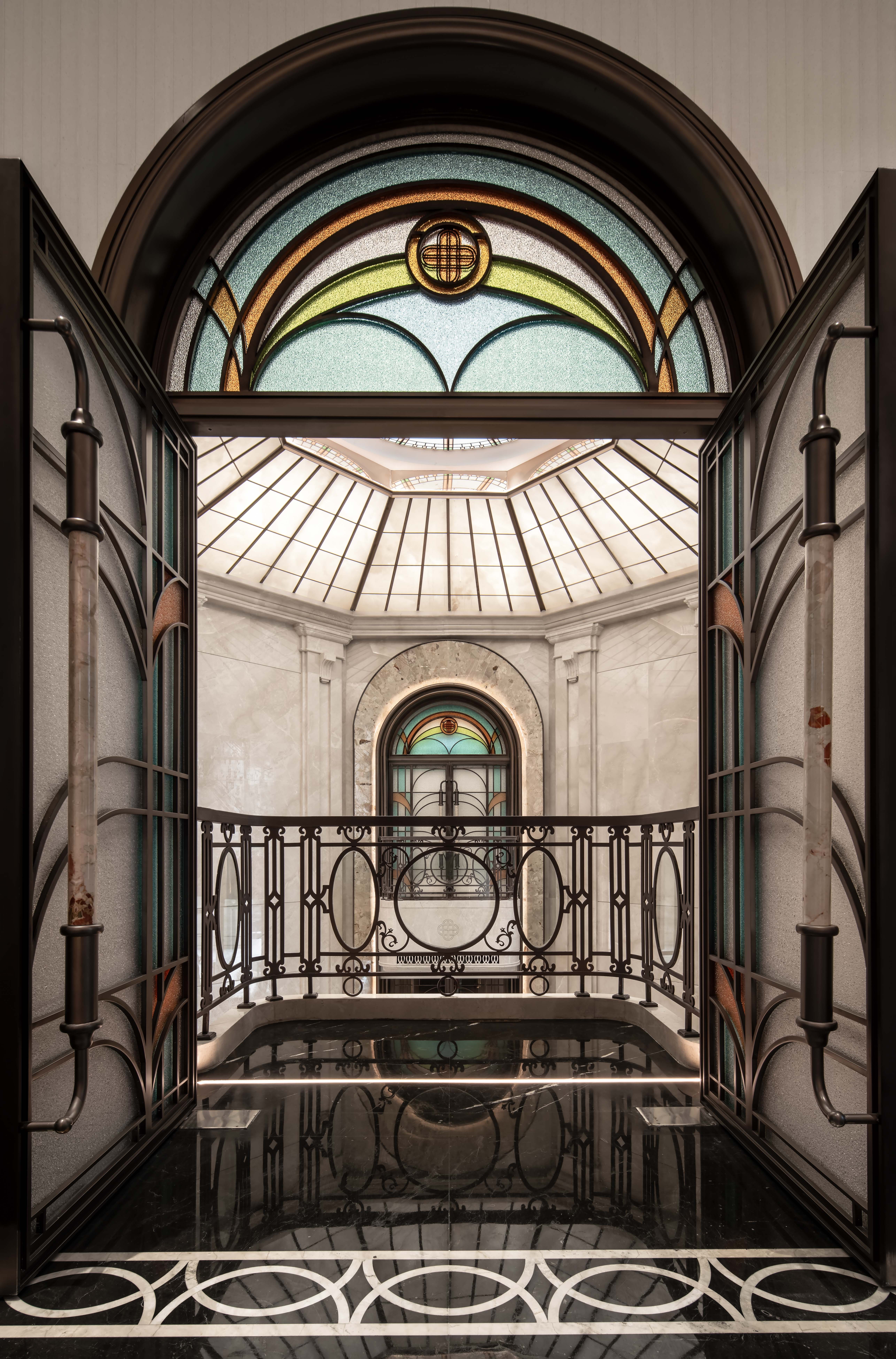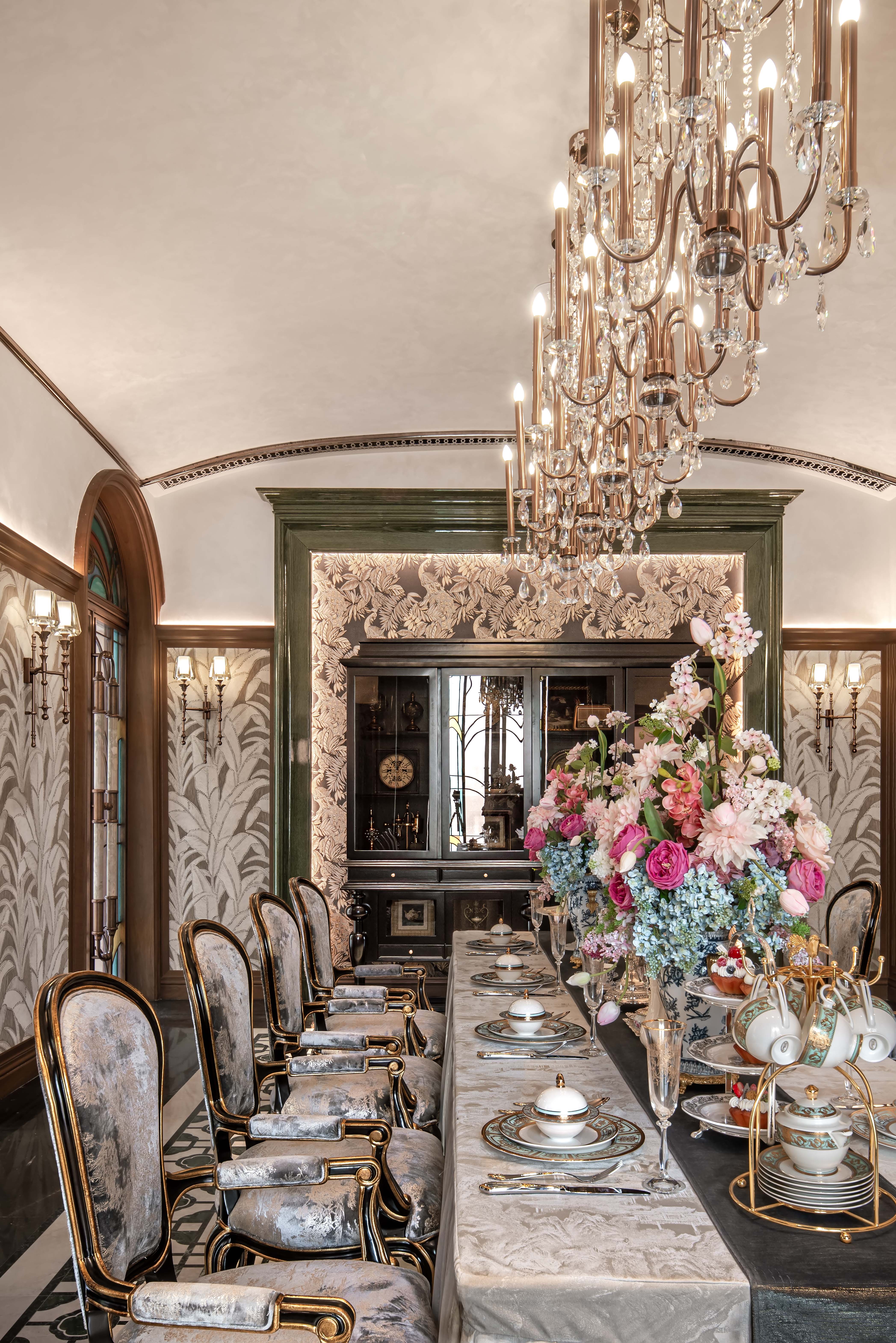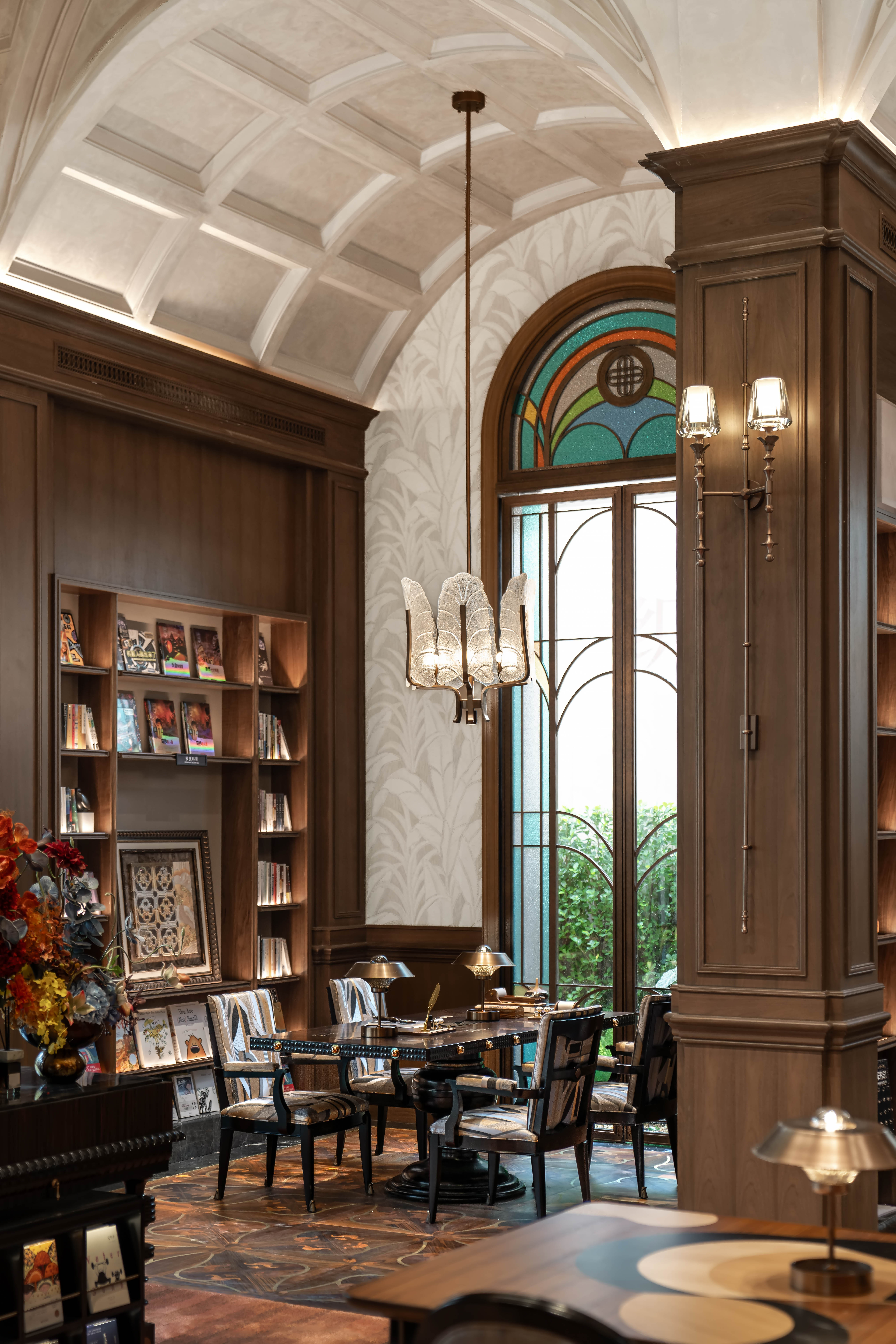 A cluster of intricate and romantic crystal lamps hangs from the palace-style carved dome, while large-scale Manchu windows line both sides. Floral patterns, segmented by dark metal frames, strike a balance between order and agility. The radiance of the crystal lamps coexists with the vitality of greenery, infusing solemnity with warmth. Beyond tranquility and ritual, visitors can listen to a gentle dialogue between time and memory.