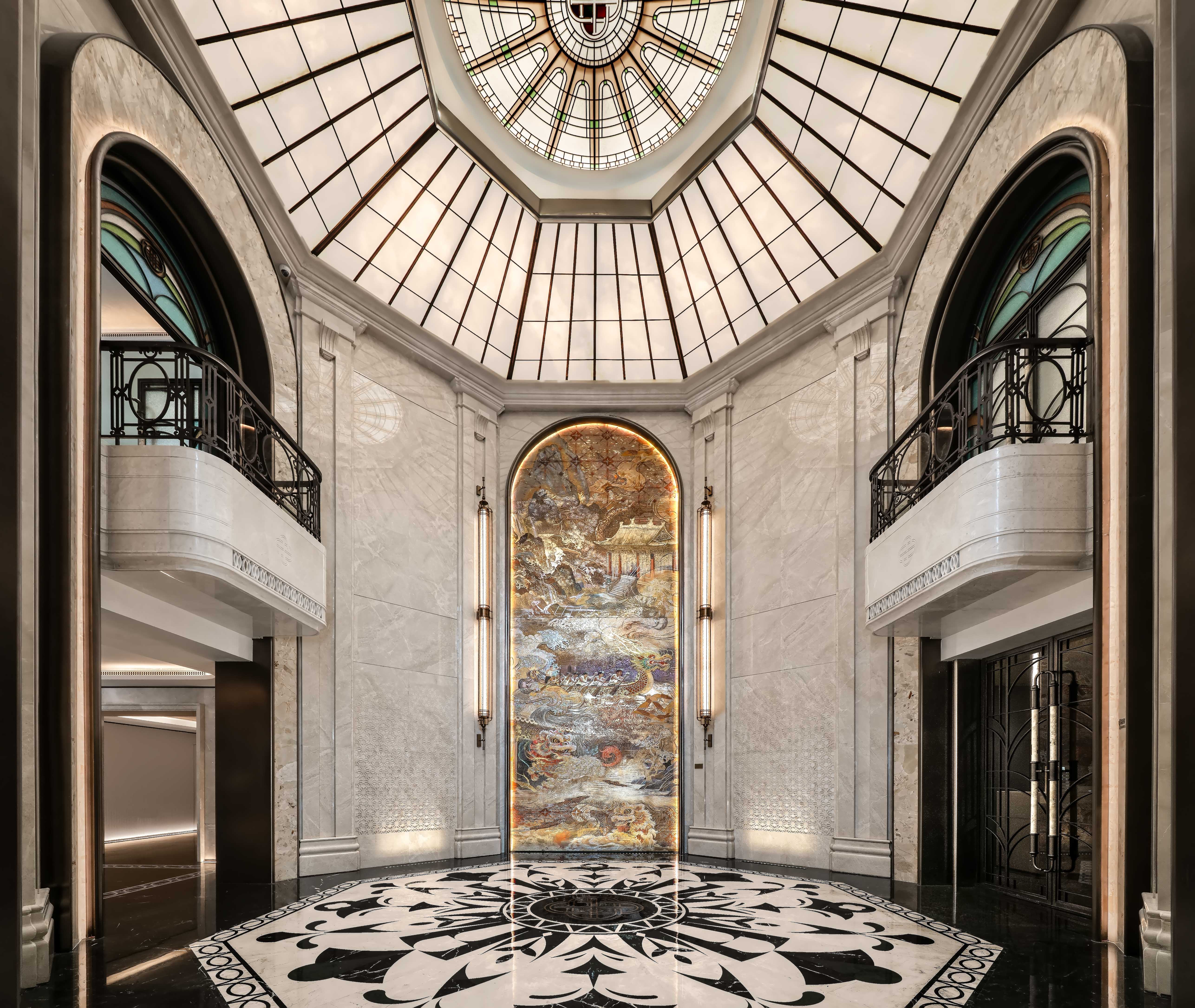 The double-height hollow structure is crowned with an octagonal glass dome that ushers in natural light, creating a soft interplay with the light-colored stone walls. The black-and-white patterned marble flooring stretches out like still water, exuding a sense of order and stability. A giant hanging artwork, crafted with intangible cultural heritage (ICH) techniques, encapsulates the spiritual core of “cloud-water zen”. Cultural motifs in the murals—including dragon boat races, leaping lion dances, and the upturned eaves of ancestral temples—quietly awaken a feeling of belonging.