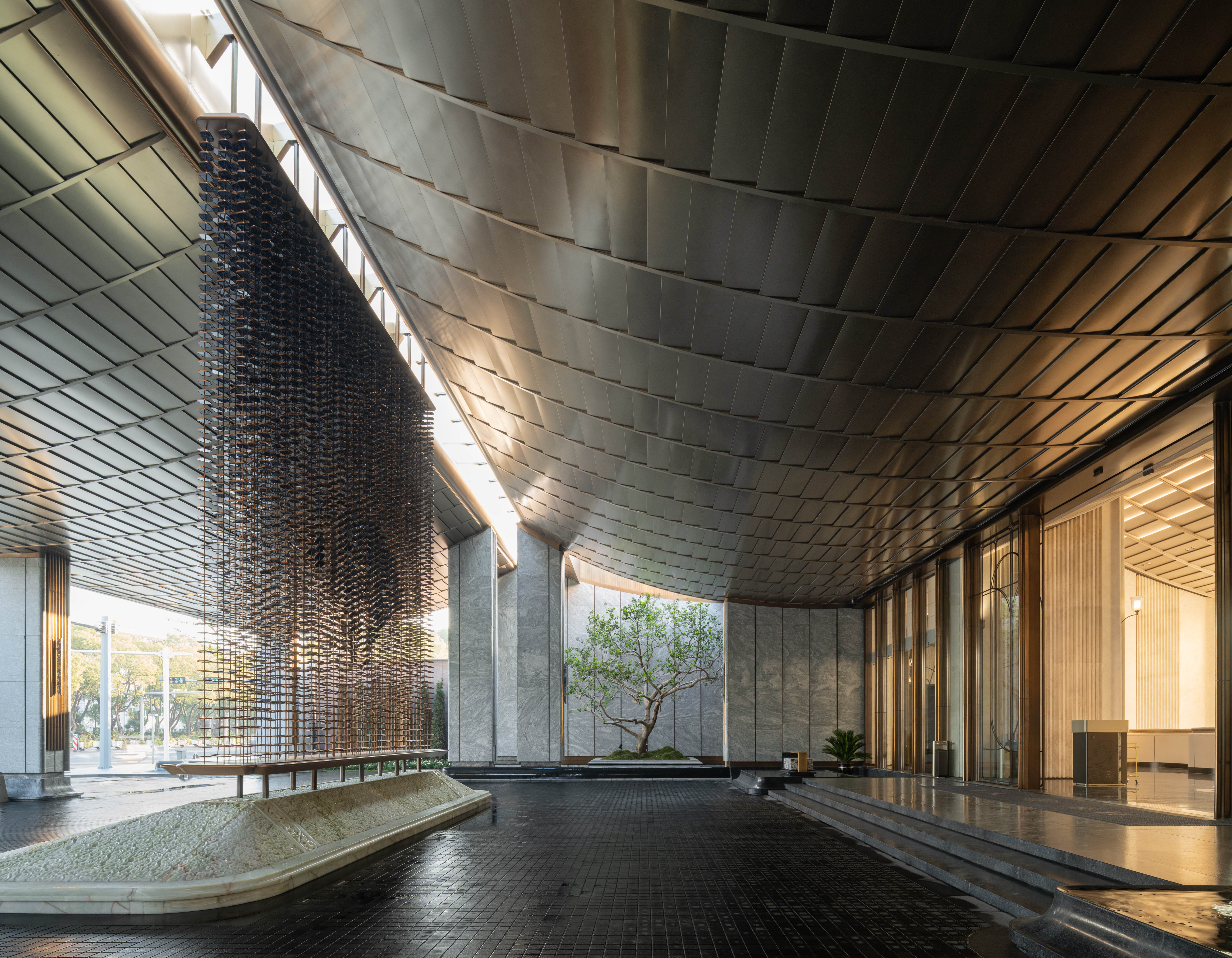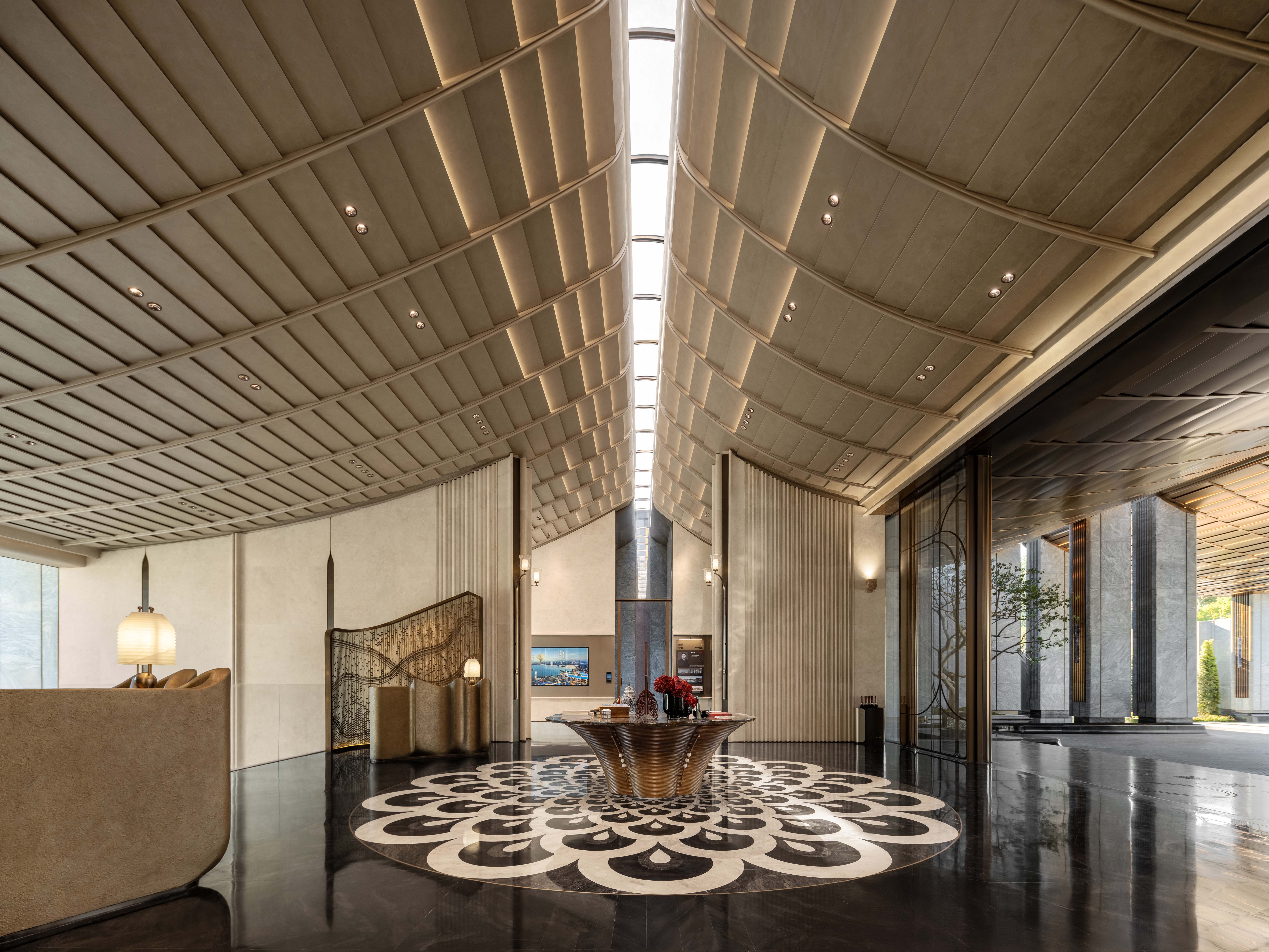 1.Main Entrance:It takes the form of an oriental roof ridge imbued with the artistic charm of traditional Chinese architecture, which internalizes the elegant curved roof structure . From the frontal perspective, it presents the grand gateway of a traditional mansion. Stepping into the semi-outdoor drop-off zone, visitors are greeted by a continuous curved roofscape, with natural light filtering through the gaps between the roof panels, thus forging a distinctive and memorable spatial experience.
