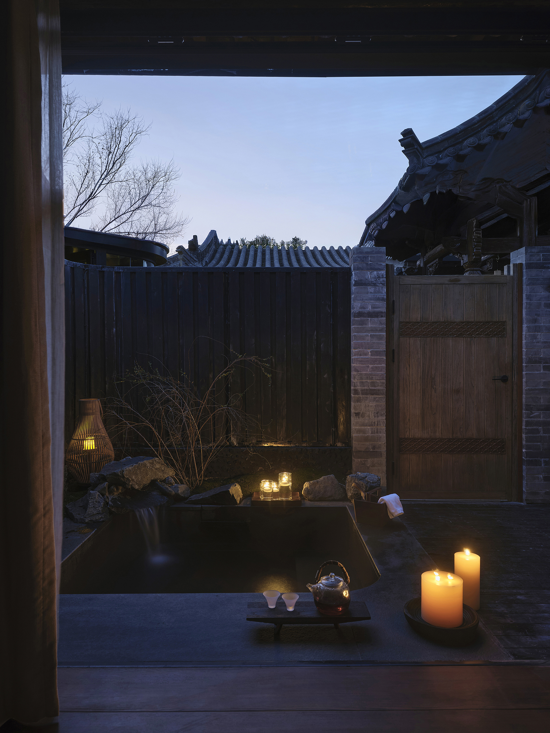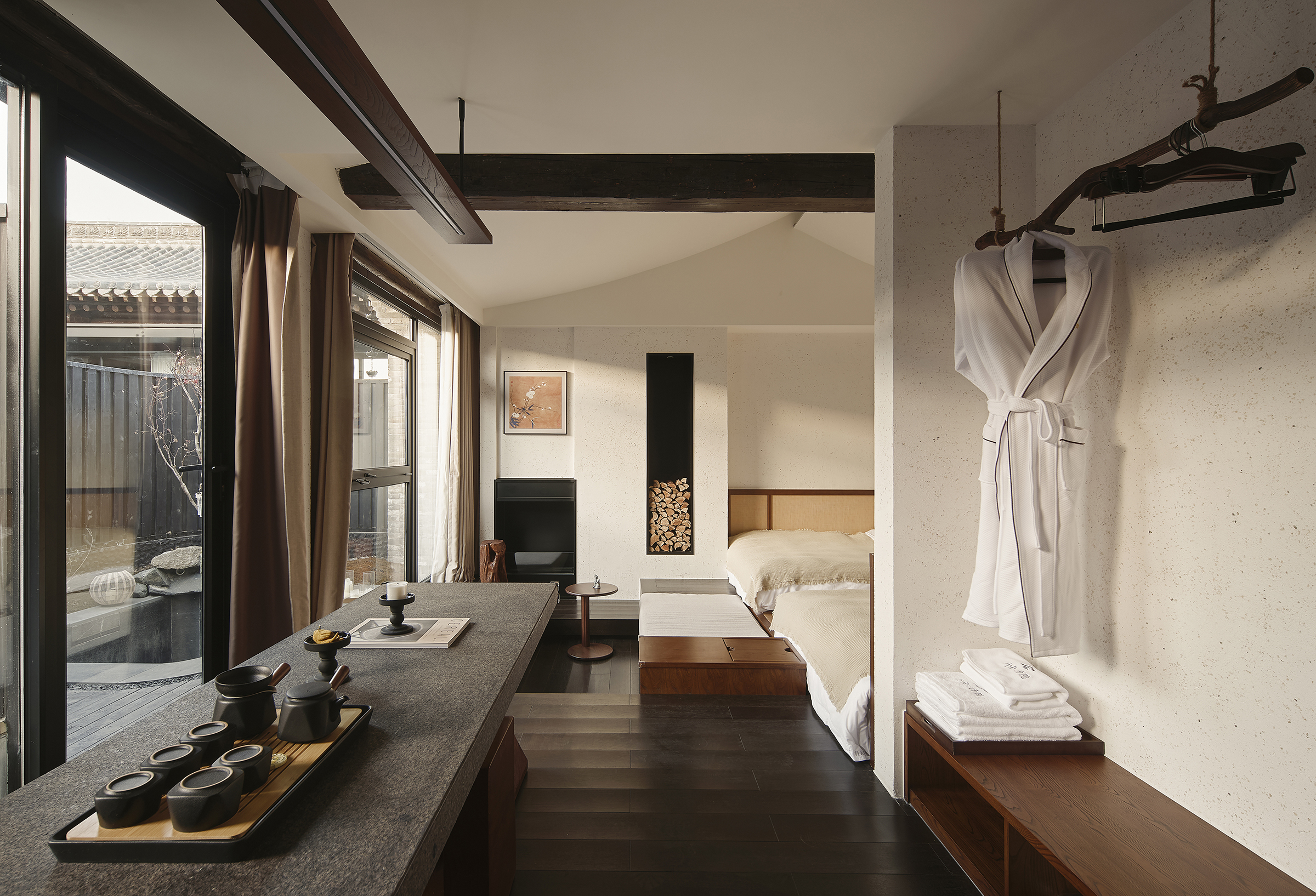 Each hot-spring courtyard is a microcosm of naturalistic style, visible directly from the bedroom through panoramic glazing. A sculptural tree rises above a textured carpet of moss, ferns, and native plants arranged over gentle mounds, while water emerges from a stone-stacked outlet as if from a mountain spring. Enhancing this immersion, the in-room breakfast experience is designed for flexibility—enjoyed at a leisure table or on the bedroom platform—allowing guests to dine while engaging with this tranquil, living canvas. This project is a testament to how interior architecture can breathe new life, poetry, and profound sensory tranquility into ancient walls.
