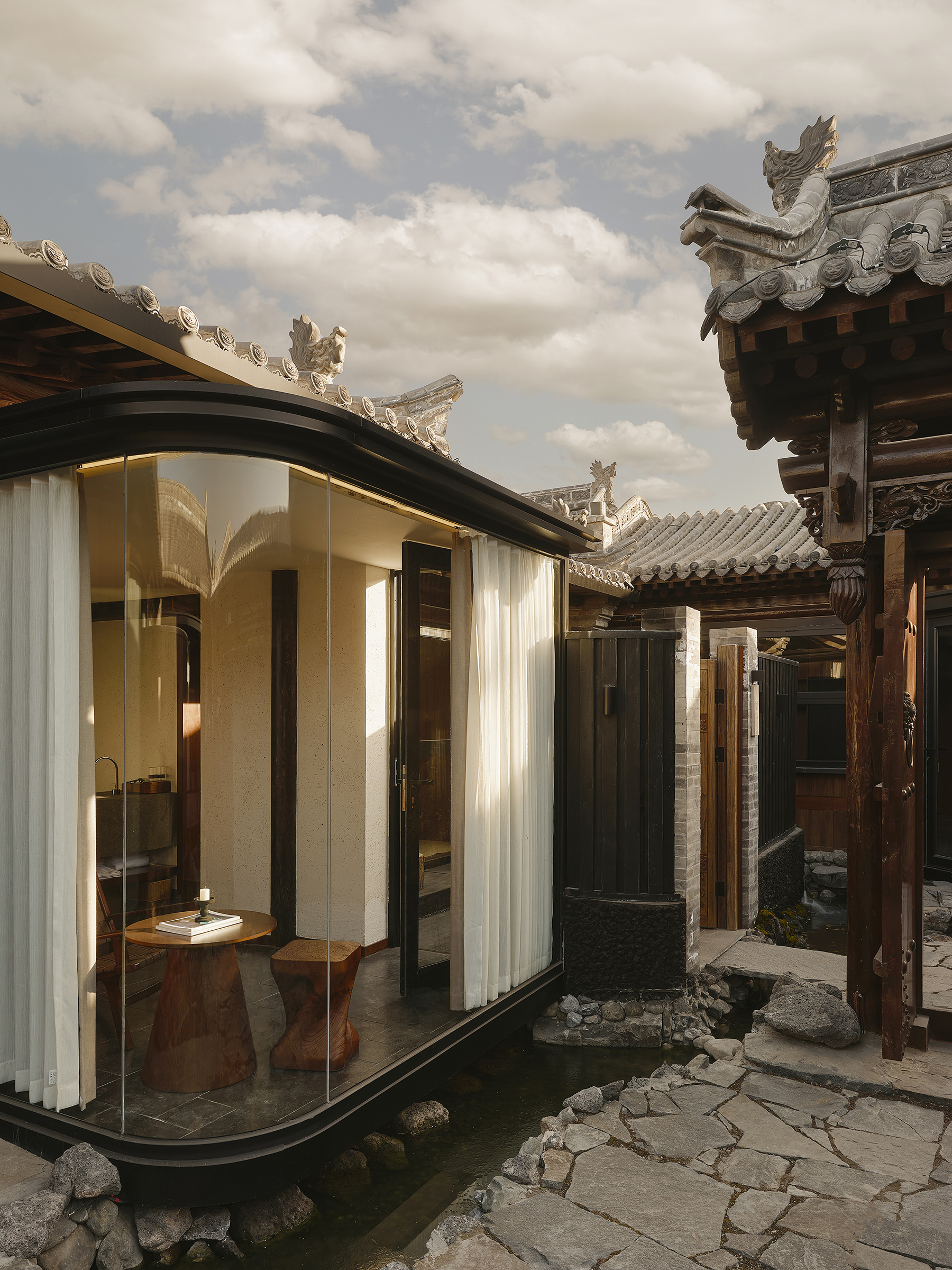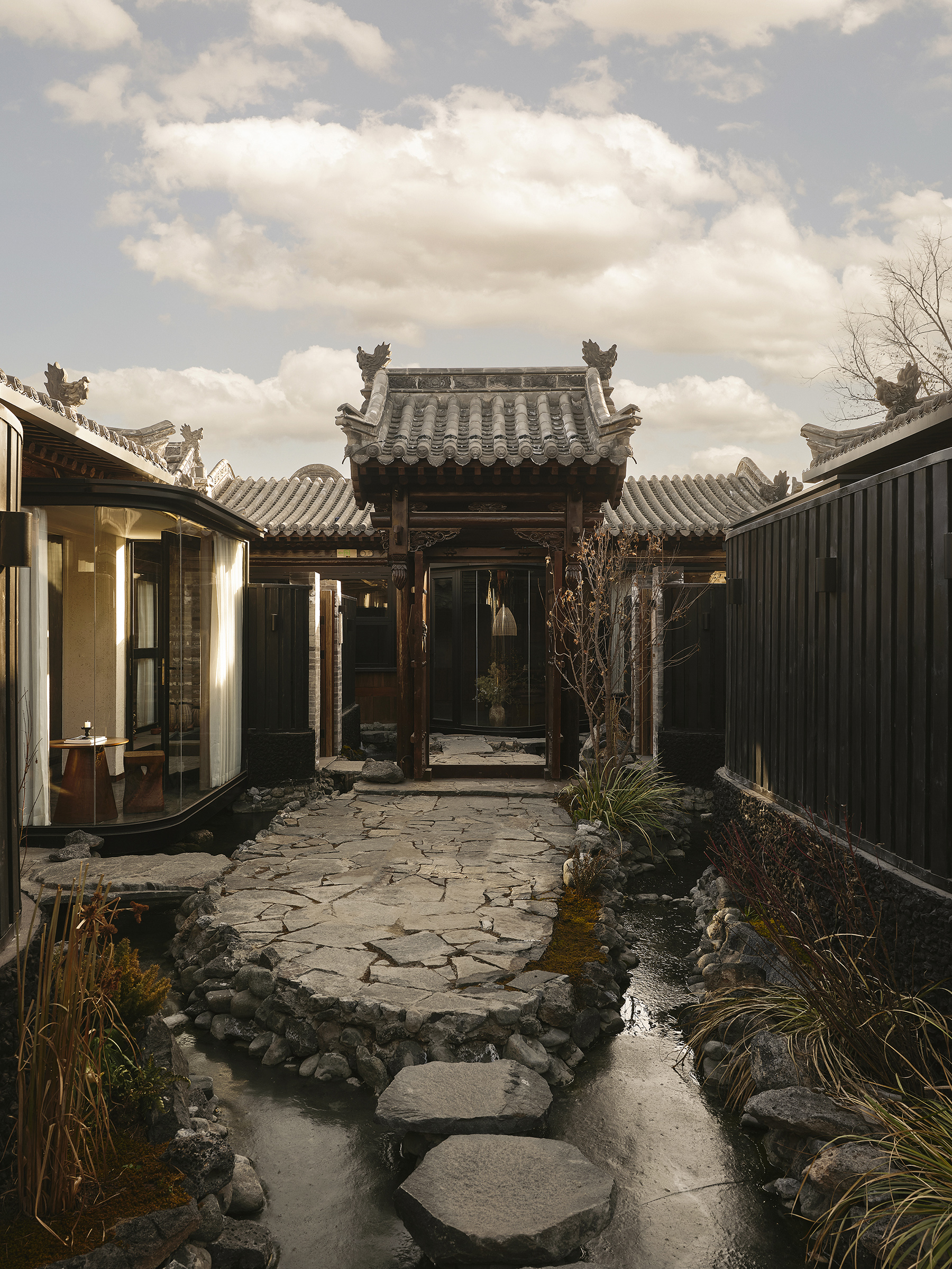 The inspiration for the courtyard design stems from Datong’s unique natural heritage—the world's only volcanic cluster developed upon the Loess Plateau. From these ancient geological formations, we hand-selected basalt stones of varying textures and densities, thoughtfully placing them within each private hot-spring courtyard and the communal water-feature garden. Whether strolling along the pathways admiring the scenery or relaxing in a private thermal bath, what touches one’s fingertips are natural stones carrying the primordial energy of the earth. This is more than just a material application—it is a connection to the ancient frequencies of the planet, turning each stay into a grounded dialogue with the site and an experience of deep energetic healing.