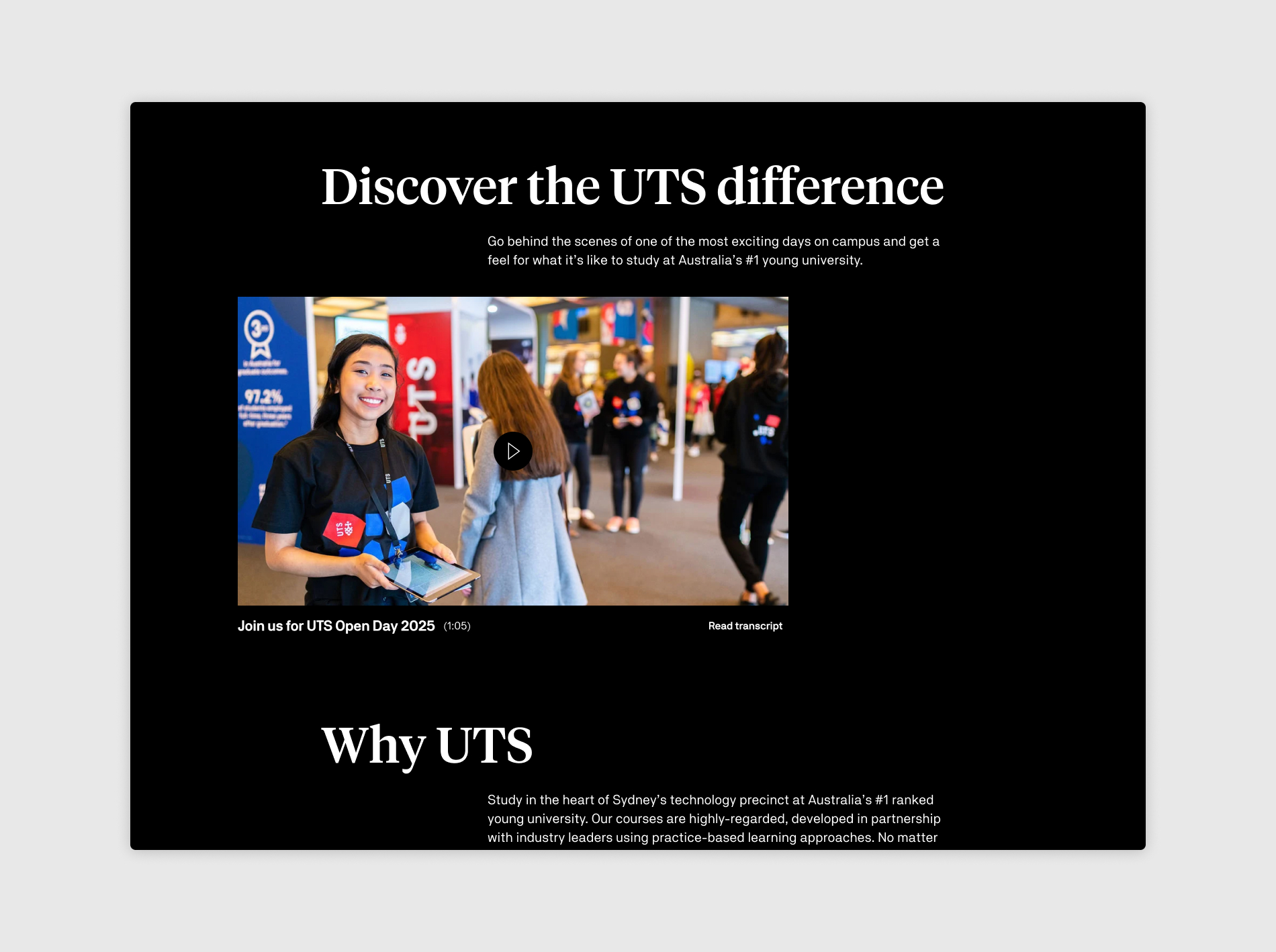 As one of Australia's leading universities, UTS has long built its reputation on bold ideas, creative thinking, and world-class innovation. As part of its UTS 2027 Strategy and broader Digital Strategy, the university set out to transform its digital presence into a platform for engagement, storytelling, and connection—one that could better reflect UTS's identity, showcase its achievements, and support its reputation as a leading global institution.