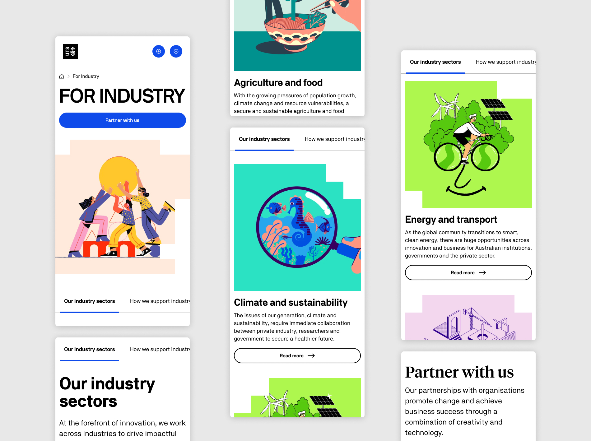 The final execution incorporates bold, simple use of colour to create a feeling of clarity and confidence; a flexible grid system that embraces negative space to create balance and interest; and typography that brings personality and rhythm, ensuring written content is not only legible but also visually engaging. The use of colourful illustration and documentary-style photography helps convey the UTS brand, where creativity and authenticity are integral.