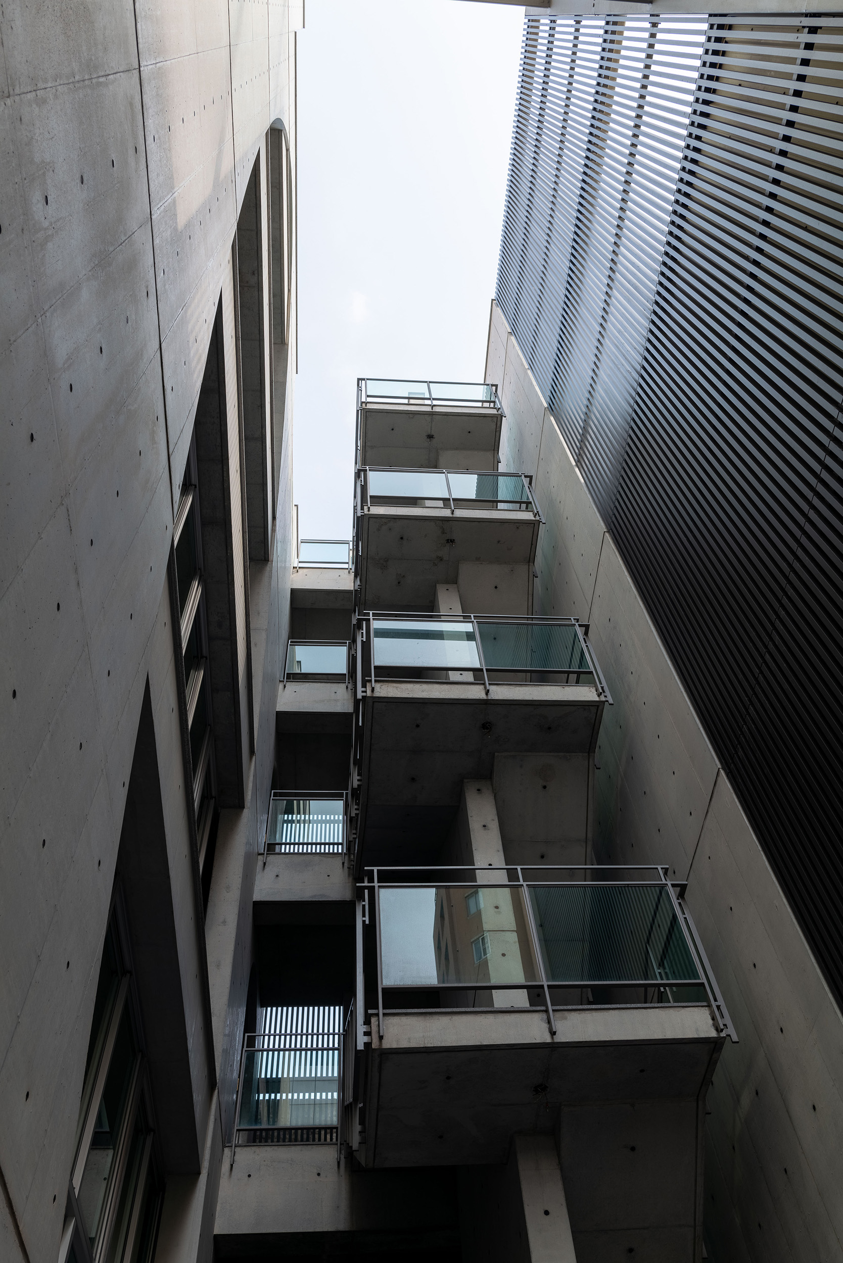 The architect designs an exterior staircase on the side of the main building. It is intended to let this staircase be another feature of the overall planning, and the staircase is designed back inside so that outside pedestrians can focus on the main body, and people inside can appreciate the structural beauty presented by this staircase.