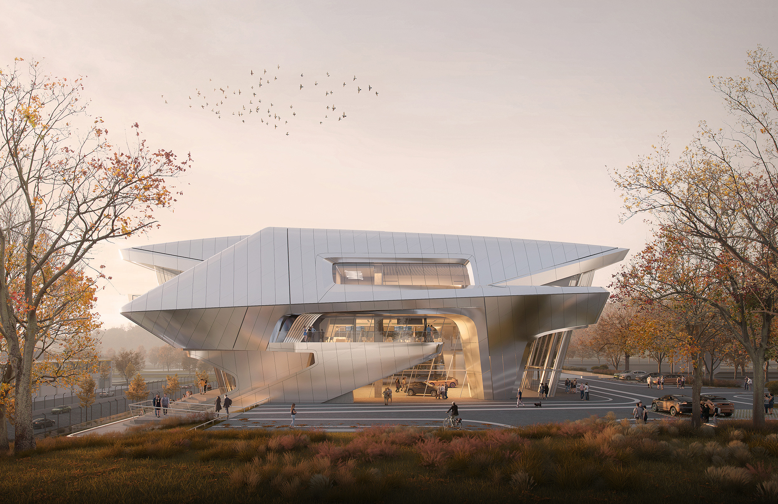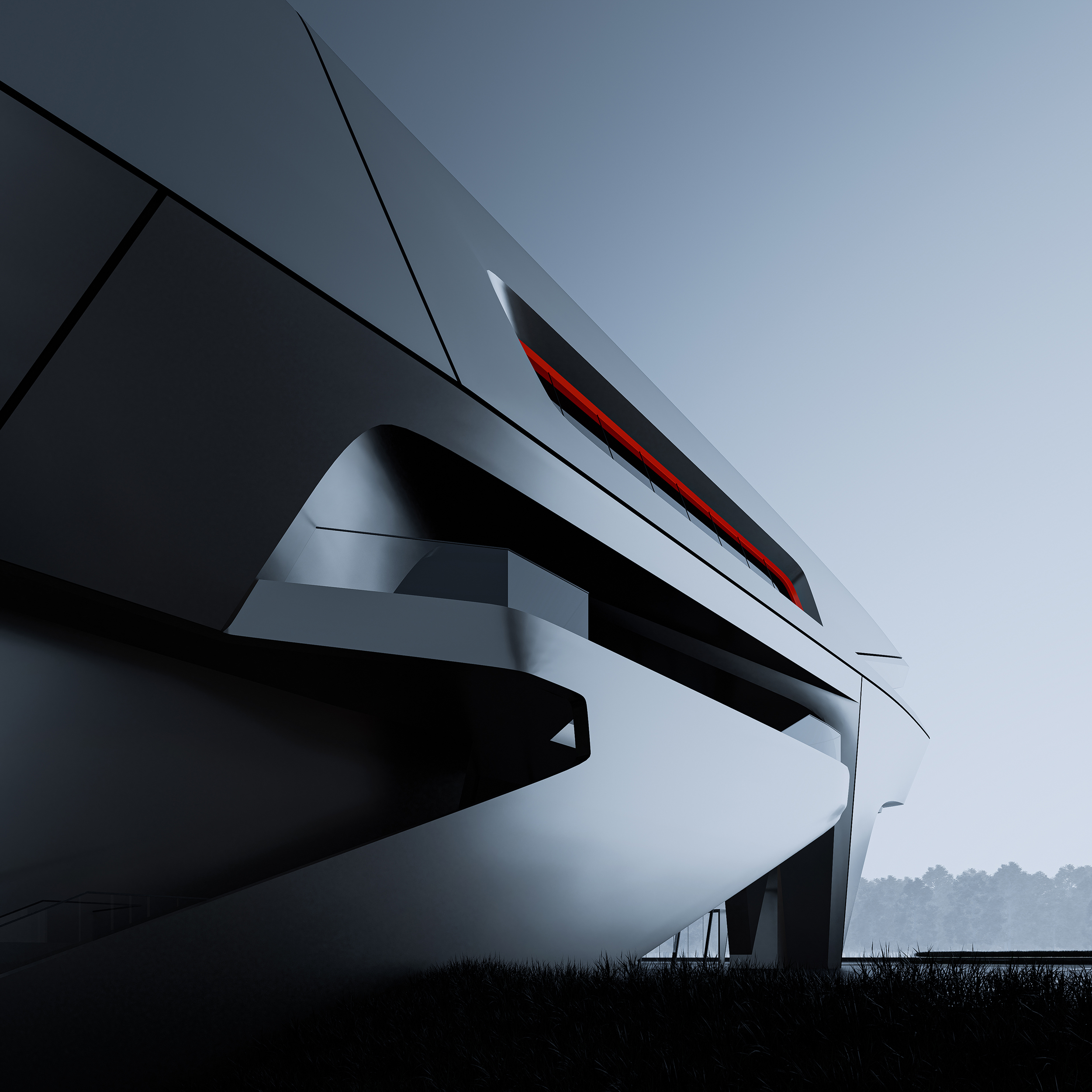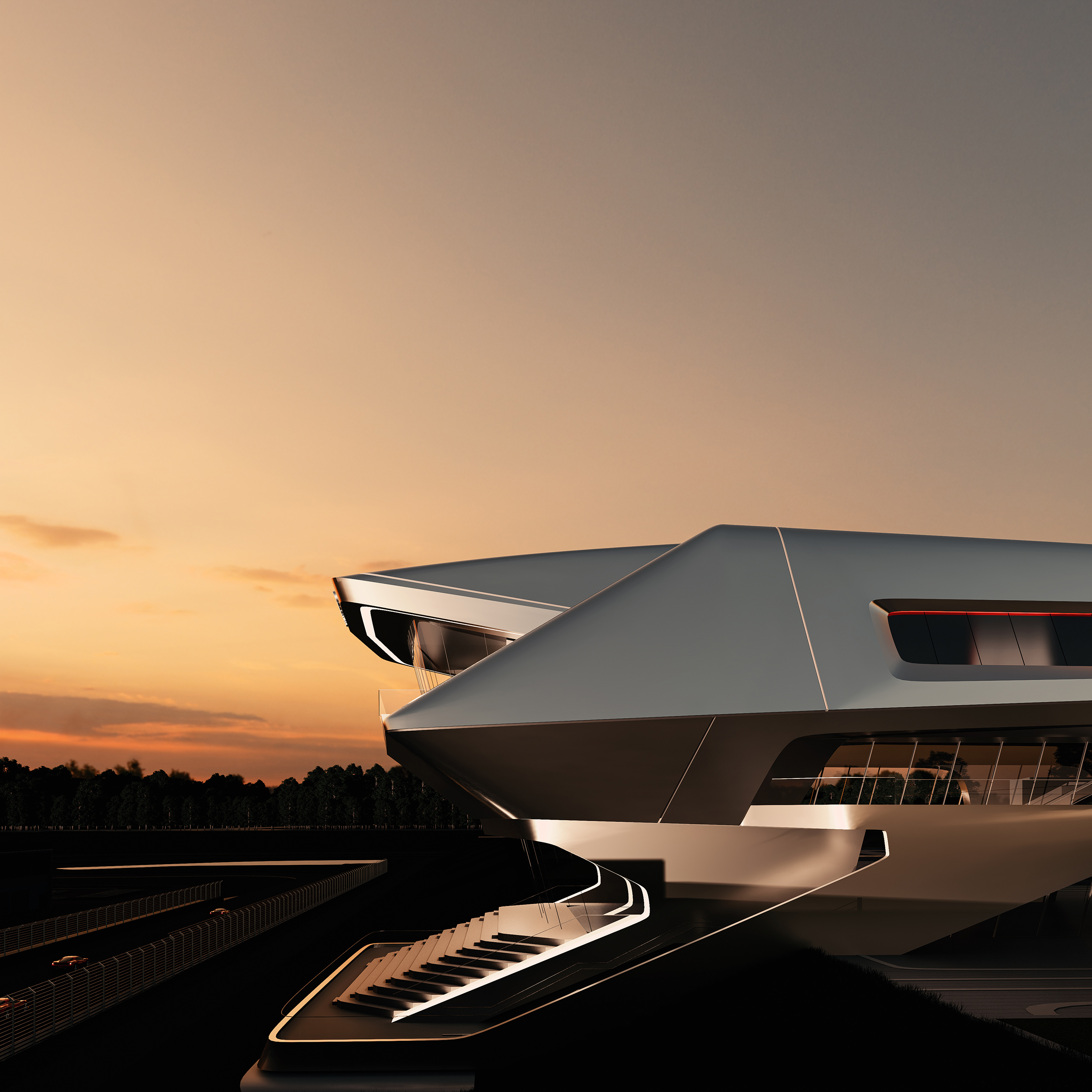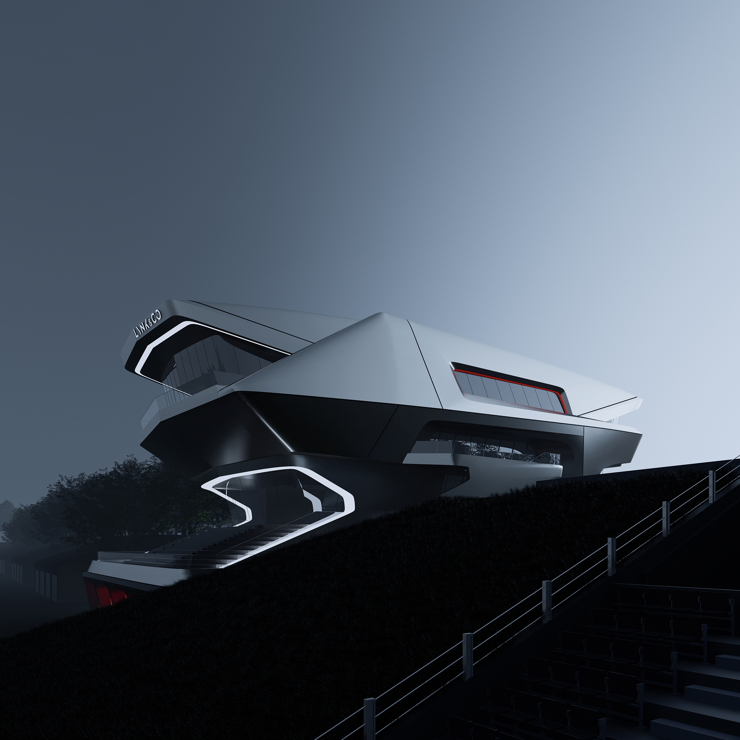 Anchored within the Tianfu International Circuit, the LYNK&CO Motorsports Experience Center is conceived as a dynamic interface—bridging the energy of automotive sports, the ethos of an urban community, and the fluidity of daily life. Positioned at the intersection of track and city, the architecture acts as a spatial mediator, fostering an organic connection between public engagement and high-performance culture. The design draws from the visual and conceptual language of LYNK&CO vehicles—muscular lines, aerodynamic curves, and technical detailing—abstracted into a deconstructivist architectural form. Interwoven volumes of irregular geometry and sweeping surfaces express motion and power, transforming the building into a “spaceship” poised for speed, transformation, and future energy exchange. The silver aluminum façade, composed of curved reflective panels, captures shifting light and environmental textures, reinforcing the building’s futuristic and kinetic identity while sharply contrasting its context. This sculptural envelope encases a vertically stratified program: immersive brand showrooms, event salons, spectator terraces, racing simulators, community lounges, and service bays. Each layer supports a distinct user experience, uniting spectators, visitors, and technical teams under a shared spatial choreography. Guided by the brand’s values—“Born Global, Open & Connected”—the project envisions a new typology: a hybridized cultural engine that accelerates interaction between performance, place, and people.
